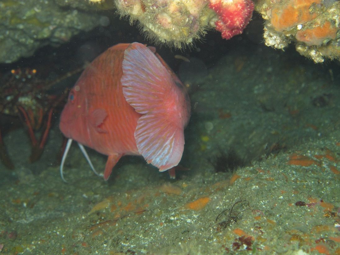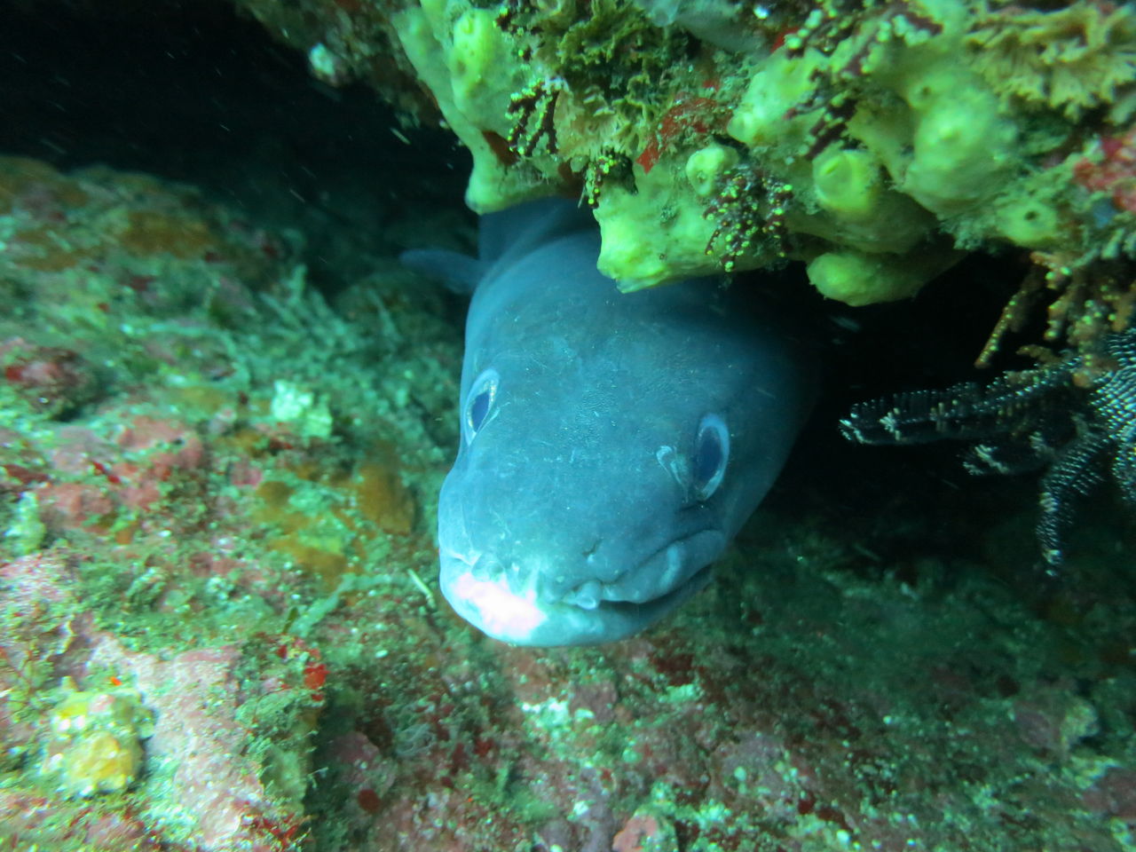 エントリーしてすぐに、コブダイの老成魚が移動中。久し振りに見る、ゴツイやつでした。サメ穴では、モロコが数匹、中層でホバリングしていました。小さい魚たちは眼中に無いかのように、悠然としています。北の岩の片隅で、ネコザメが食事中の様子でした。