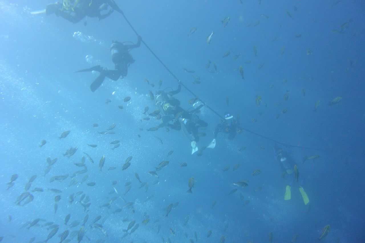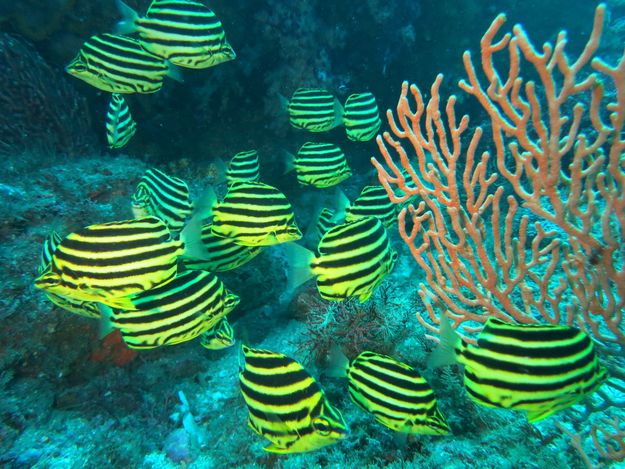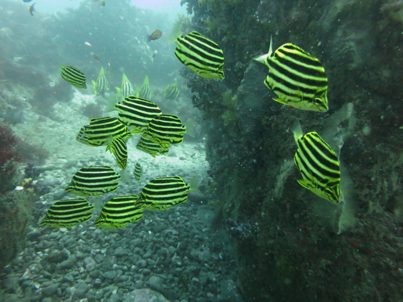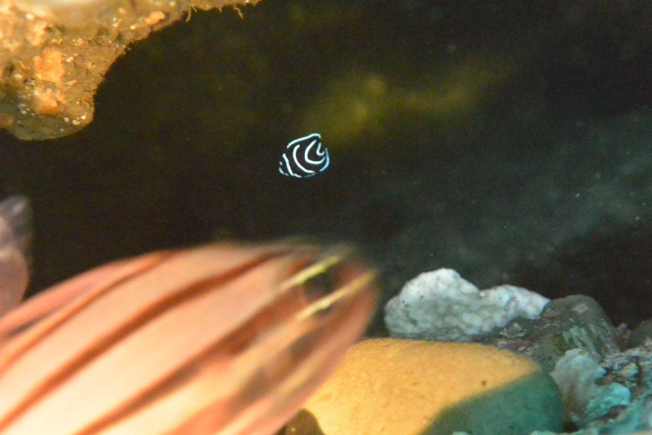 エントリーするとまったりな水中♪のんびりトビエイの根を目指します。根の東側にある岩をぐるっと回って根の南側へ、タテジマキンチャクダイの幼魚はひらひらと泳いでいます。