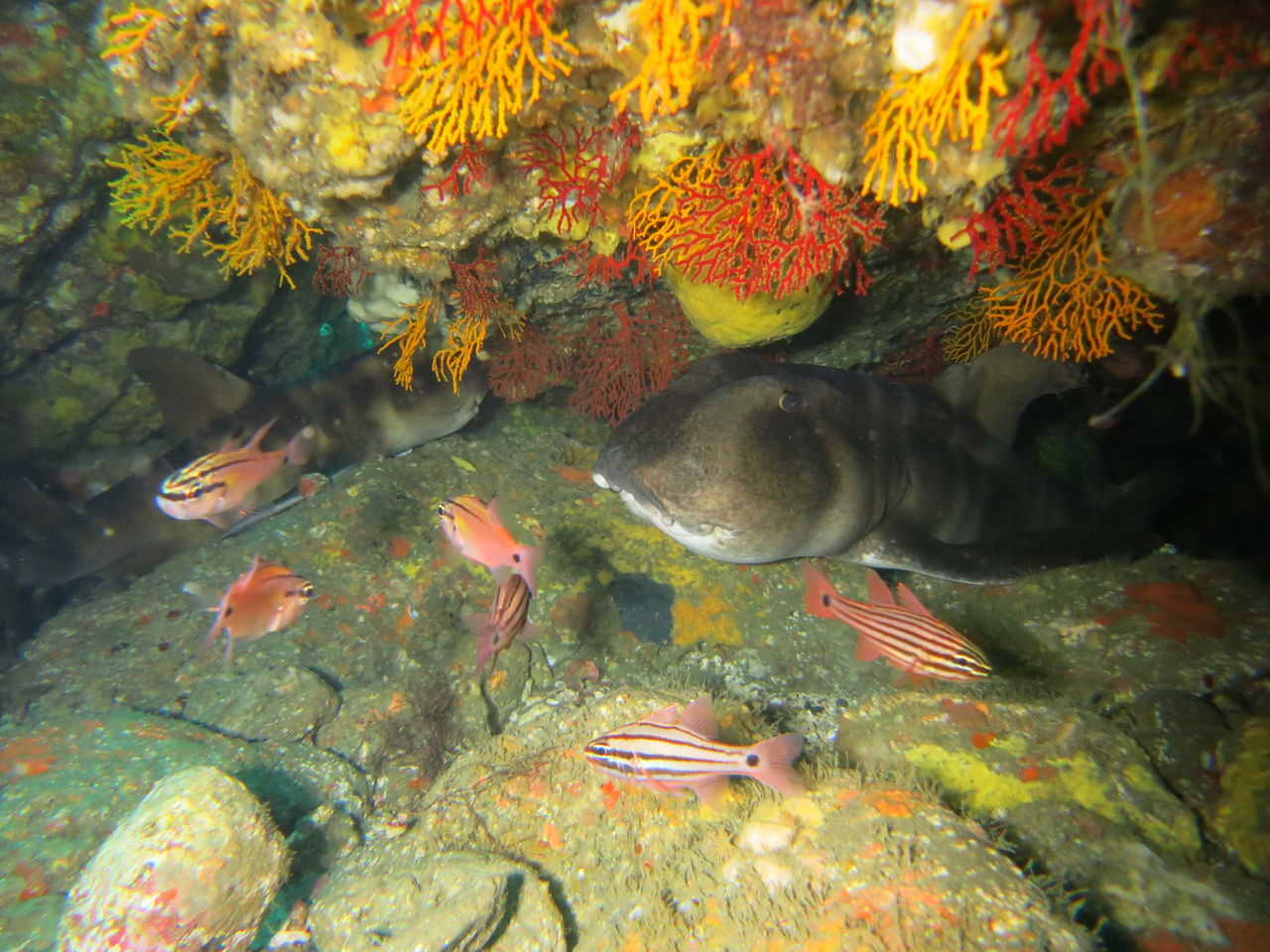 んん?急に逆潮がちょっと入ってきた・・・サメ穴にはカゴカキダイが小さな群れを作っていました、キレー☆ 岩の上にはメバルが斜め上を向いてホバリング中♪マツカサウオも登場してとっても賑やかでした(^^♪