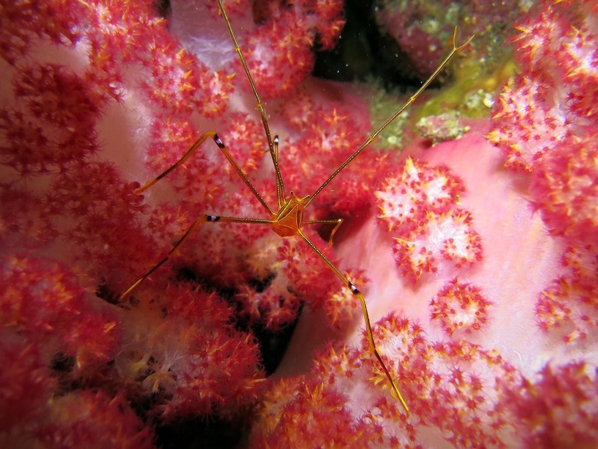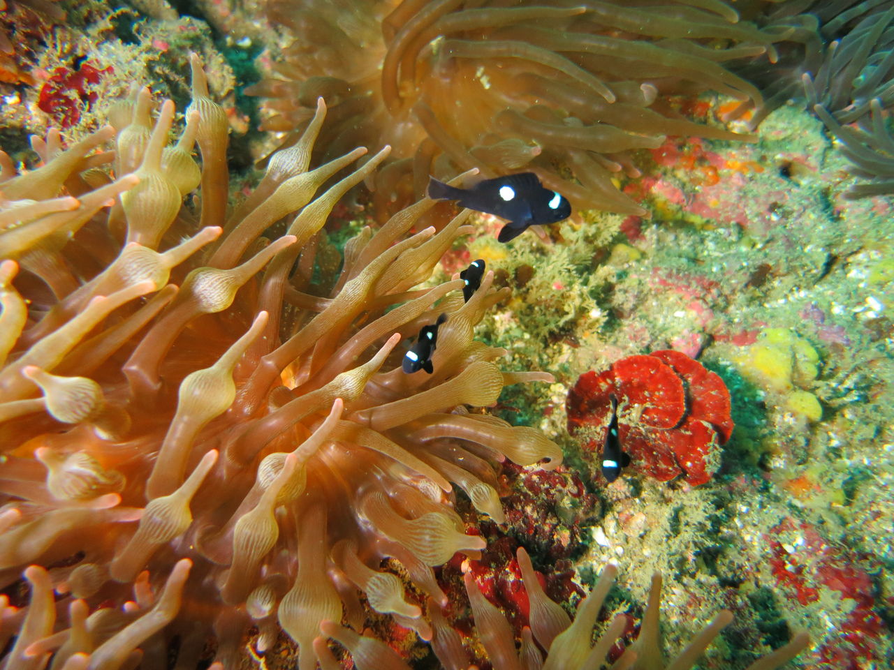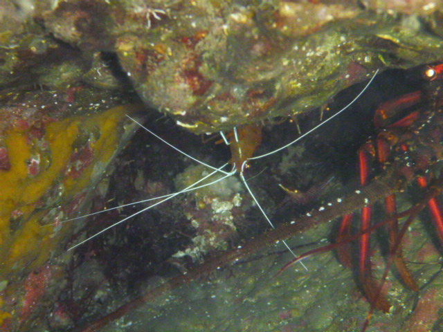 ちょっと逆潮強くなったかな? ハタンポ岩の下にはゴンズイが、これでもかッ!ってほど群れてます。根の周りにはイサキが群れ群れです。離れ根に移動してイソギンチャクの中を観察。イソギンチャクエビが顔を出してくれました。ソフトコーラルの中にはオルトマンワラエビを発見☆ 全力でピースしてました(笑)