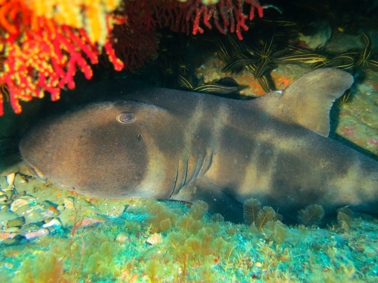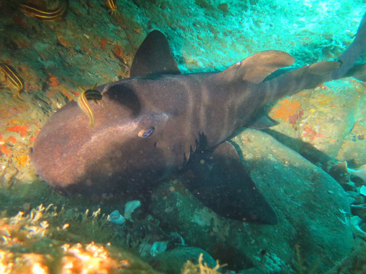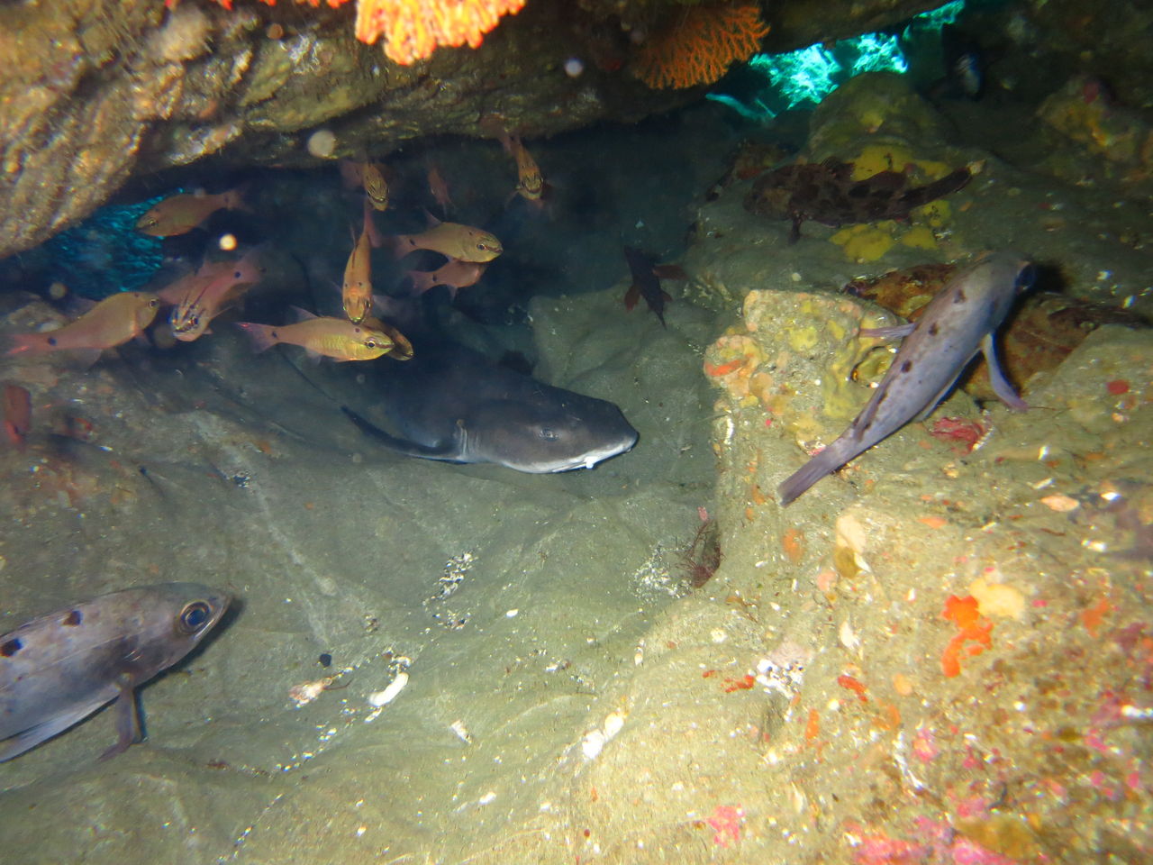 メバル谷を目指して泳いでいると、ツルさんがオイラを呼んでます。すると岩の下にドチサメが寝ていました。残念ながら尻尾がこちらに向いていましたので、顔は分かりませんでした。メバル谷には相変わらずキンメモドキ・ネンブツダイ等の群れがいっぱい☆