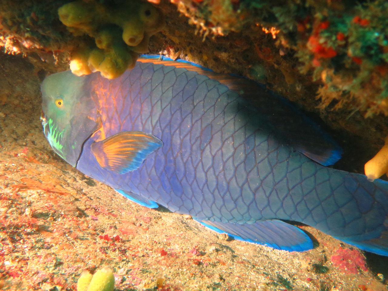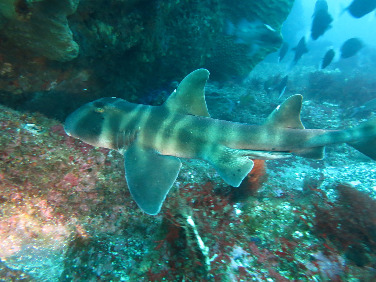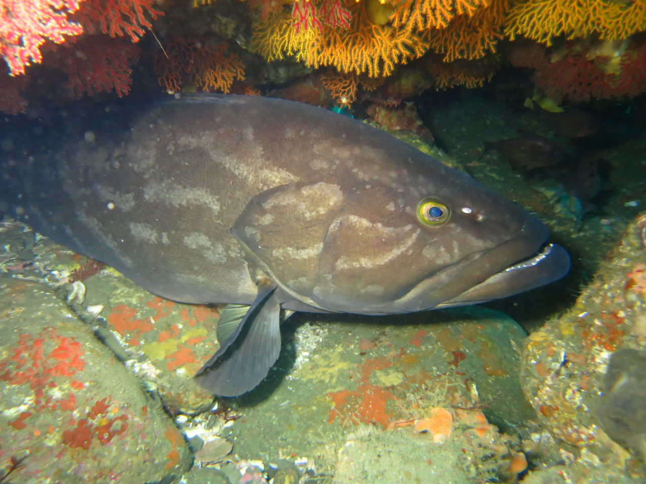 メバル谷を目指して泳いでいると、ツルさんがオイラを呼んでます。すると岩の下にドチサメが寝ていました。残念ながら尻尾がこちらに向いていましたので、顔は分かりませんでした。メバル谷には相変わらずキンメモドキ・ネンブツダイ等の群れがいっぱい☆