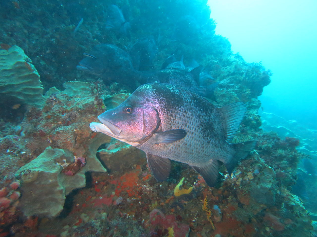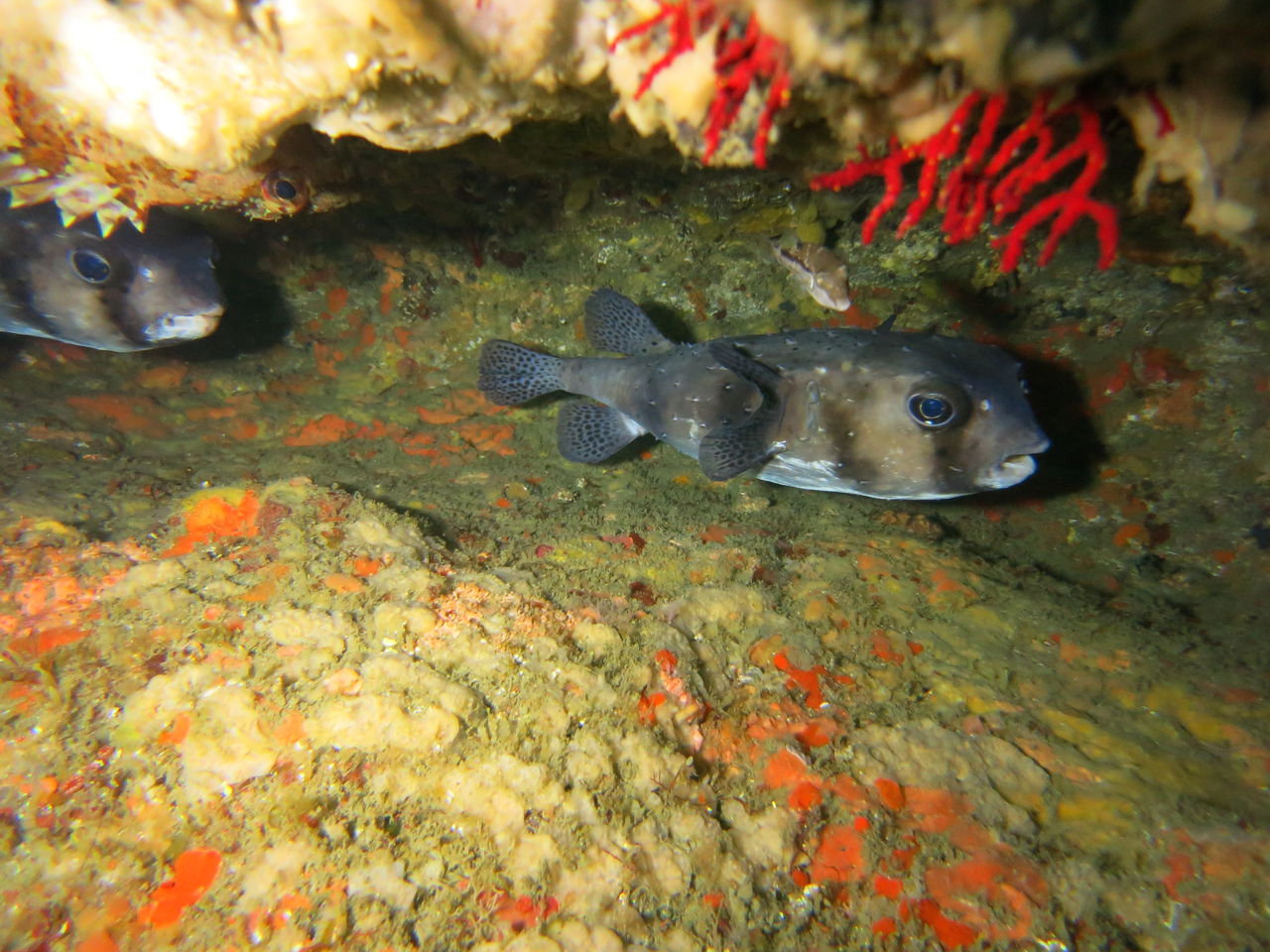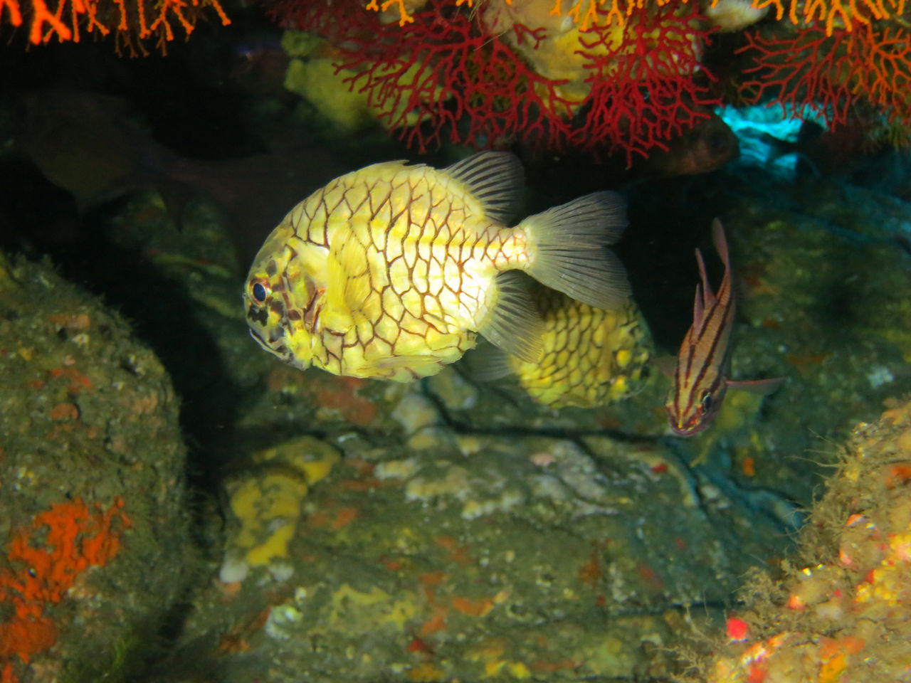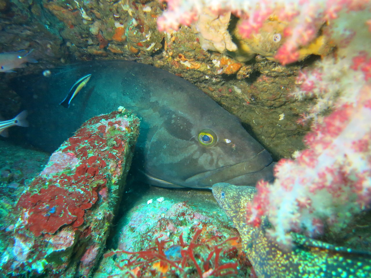 大根の南側にあるイソギンチャクの中にはカザリイソギンチャクエビが数匹住みついていますね☆ V字谷にはヒゲダイが15匹ほど群れていました。