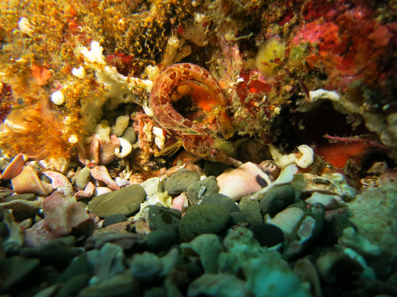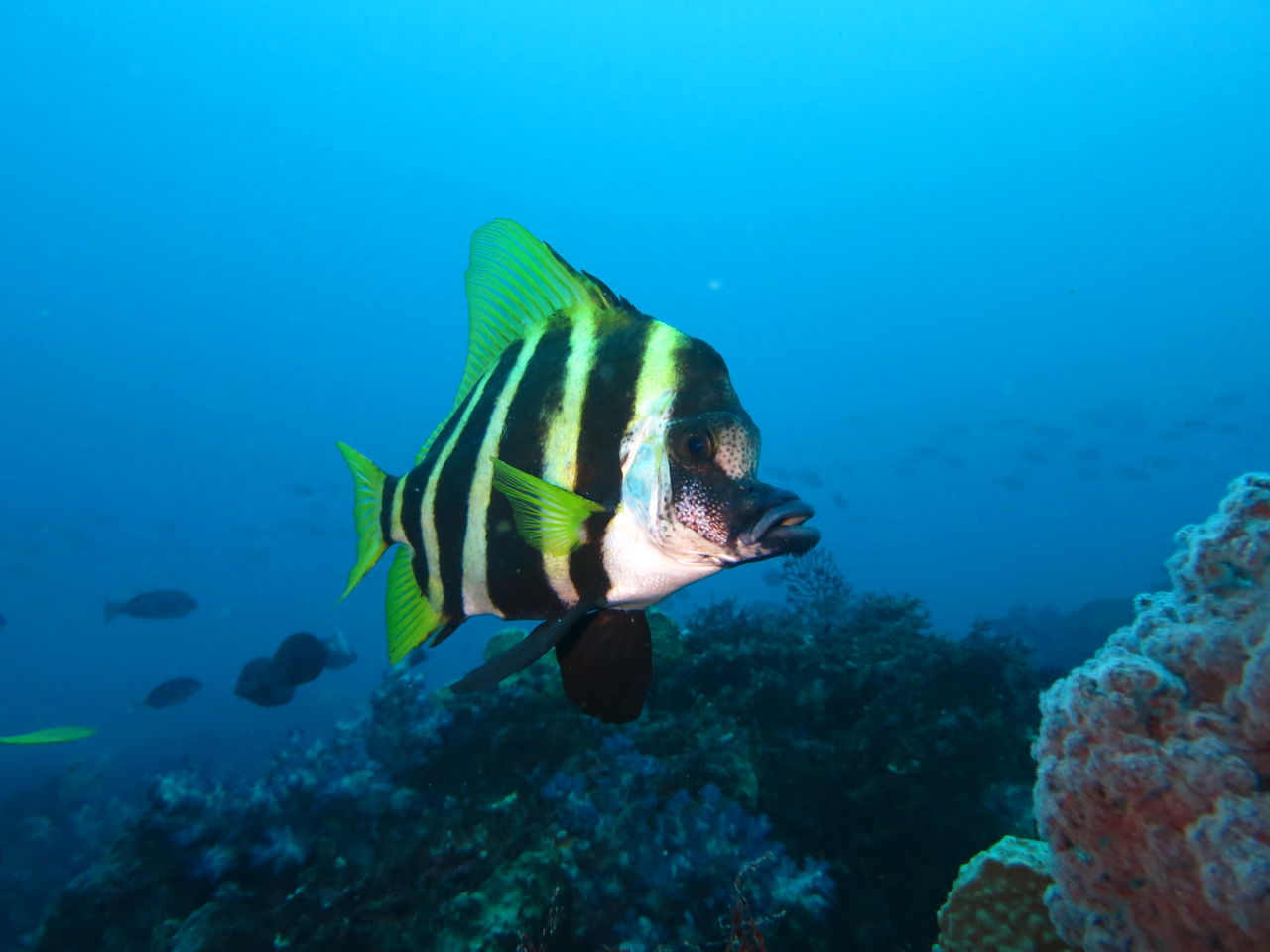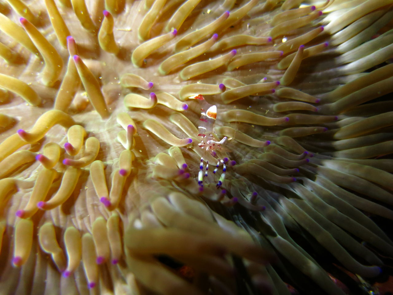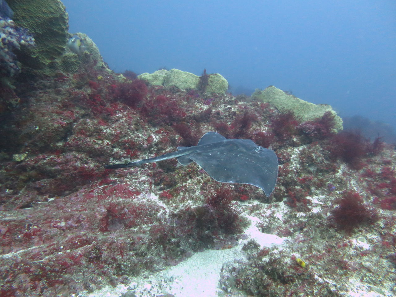 大根の南側にあるイソギンチャクの中にはカザリイソギンチャクエビが数匹住みついていますね☆ V字谷にはヒゲダイが15匹ほど群れていました。