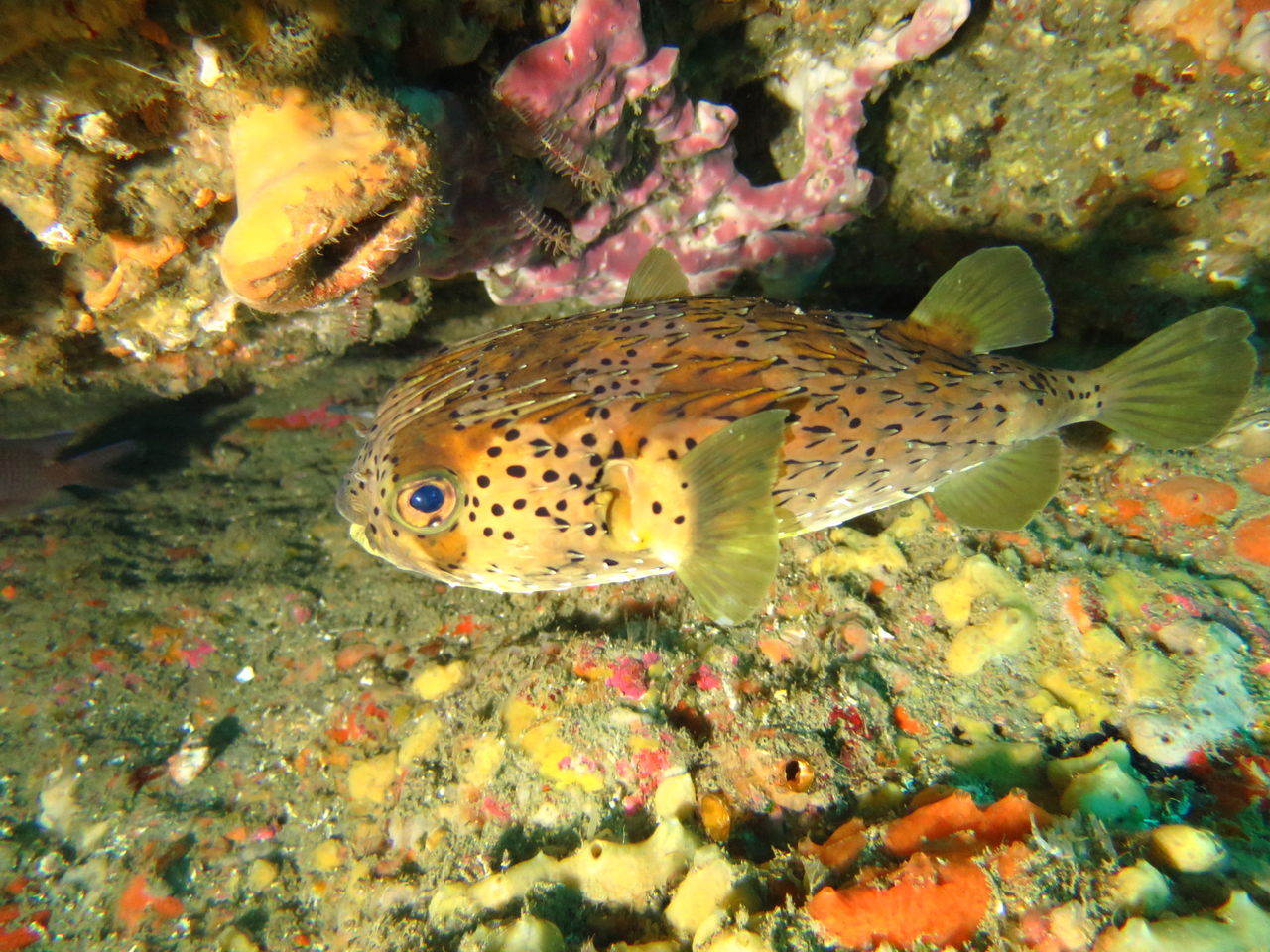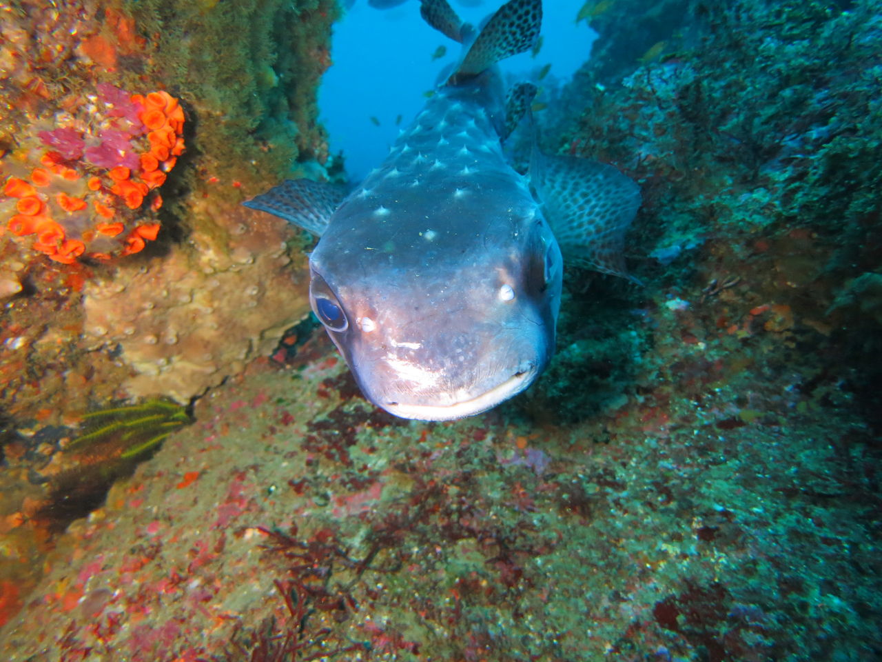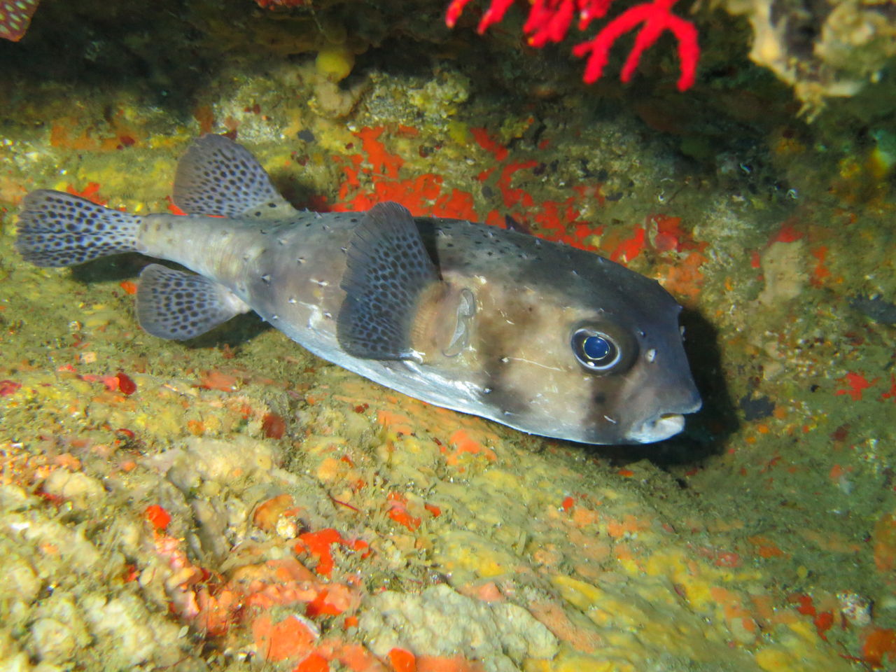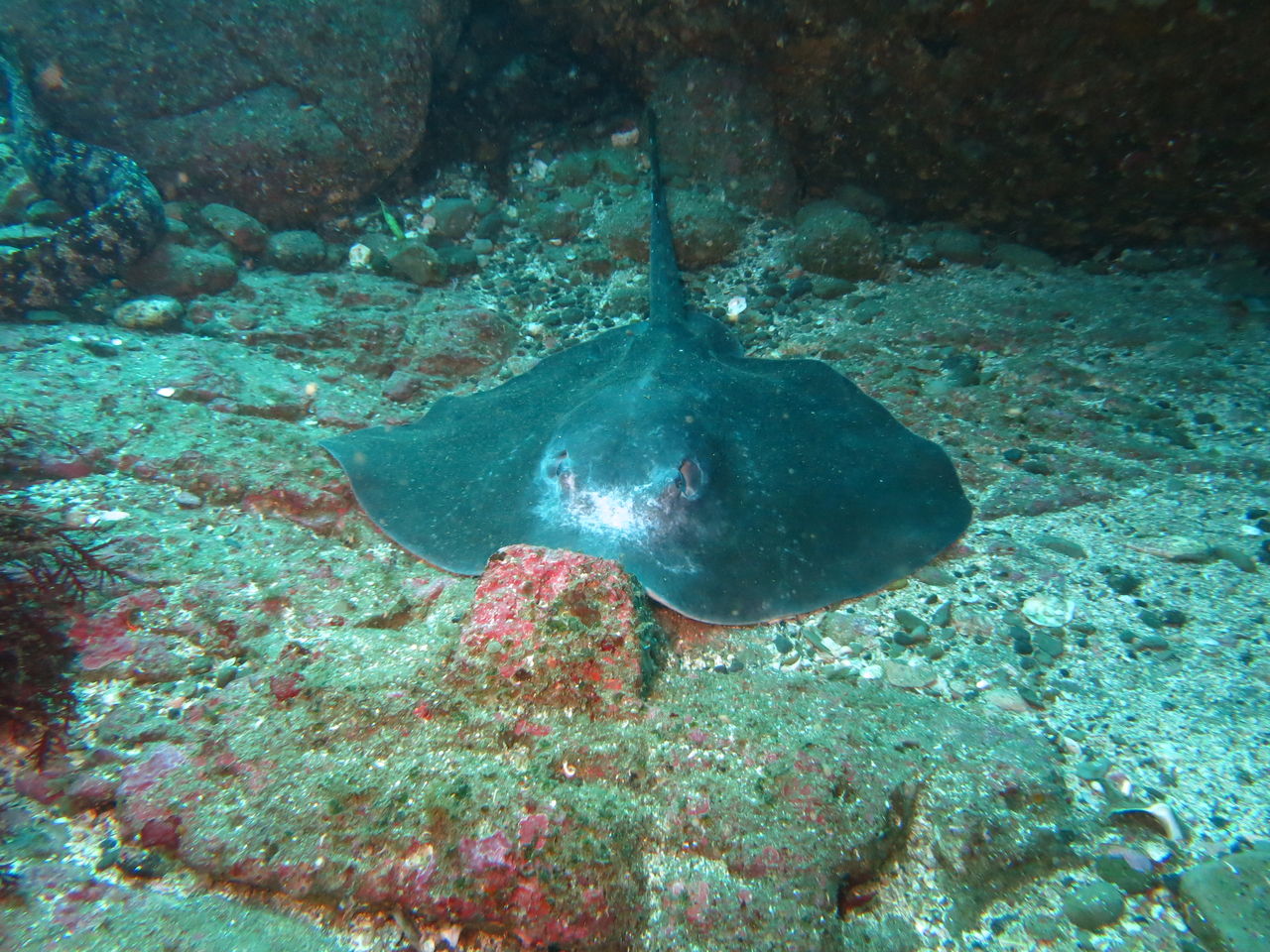 トビエイの根に向かいます! 最近クロアナゴはいるんですが・・なかなか出てきませんねぇ(>_<) もう一つの穴を覗くと、そこにはオアブダイが入っていました。根に張り付いていろいろ探していると、ミツイラメリウミウシが二匹くっついていました。ちっちゃいのなんの!!