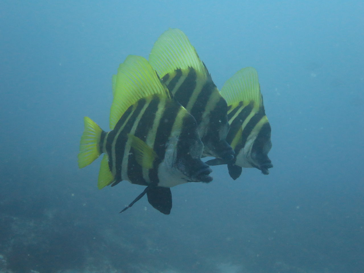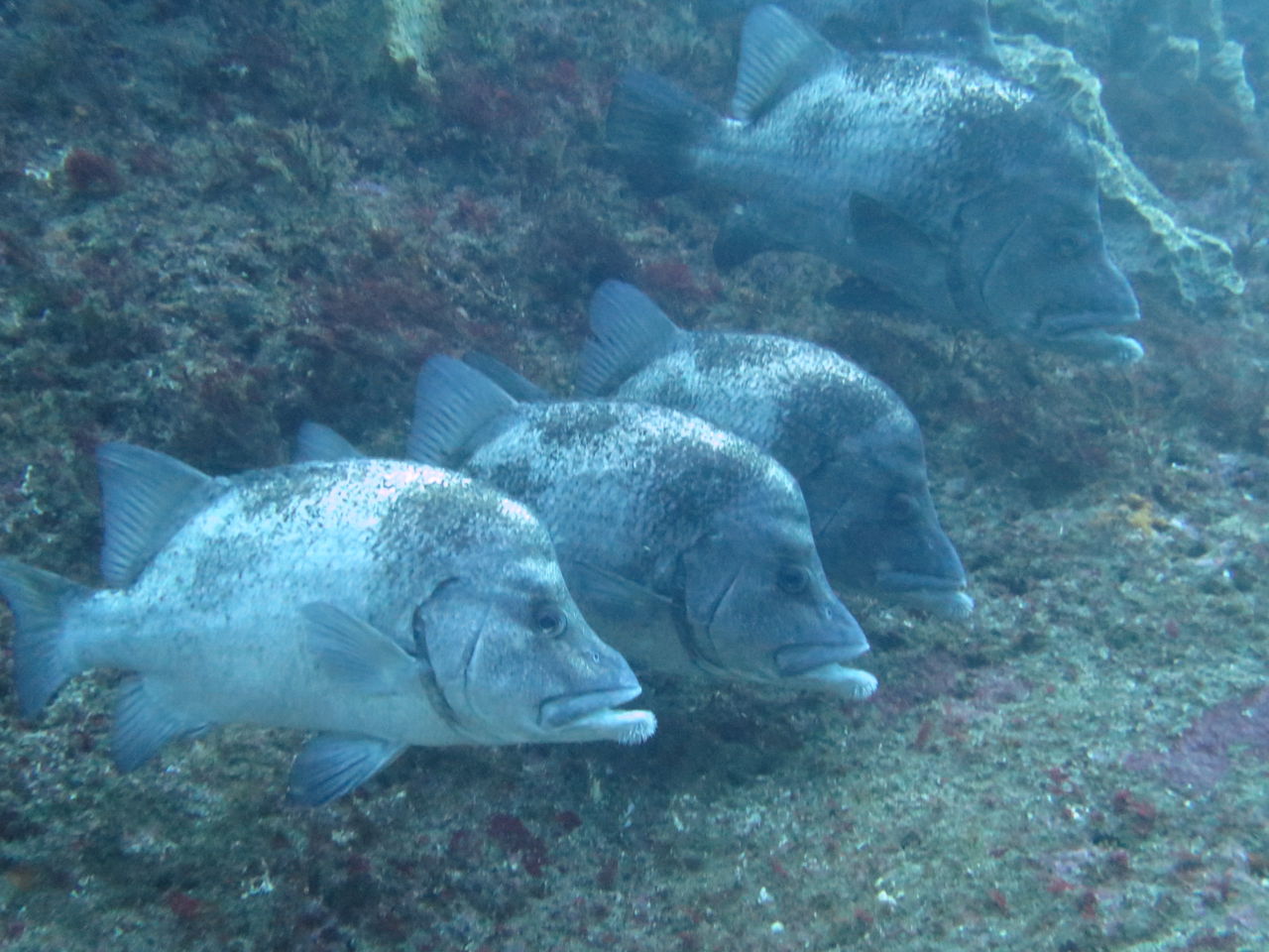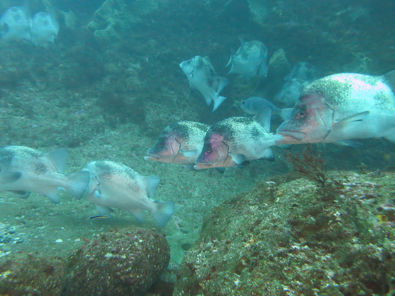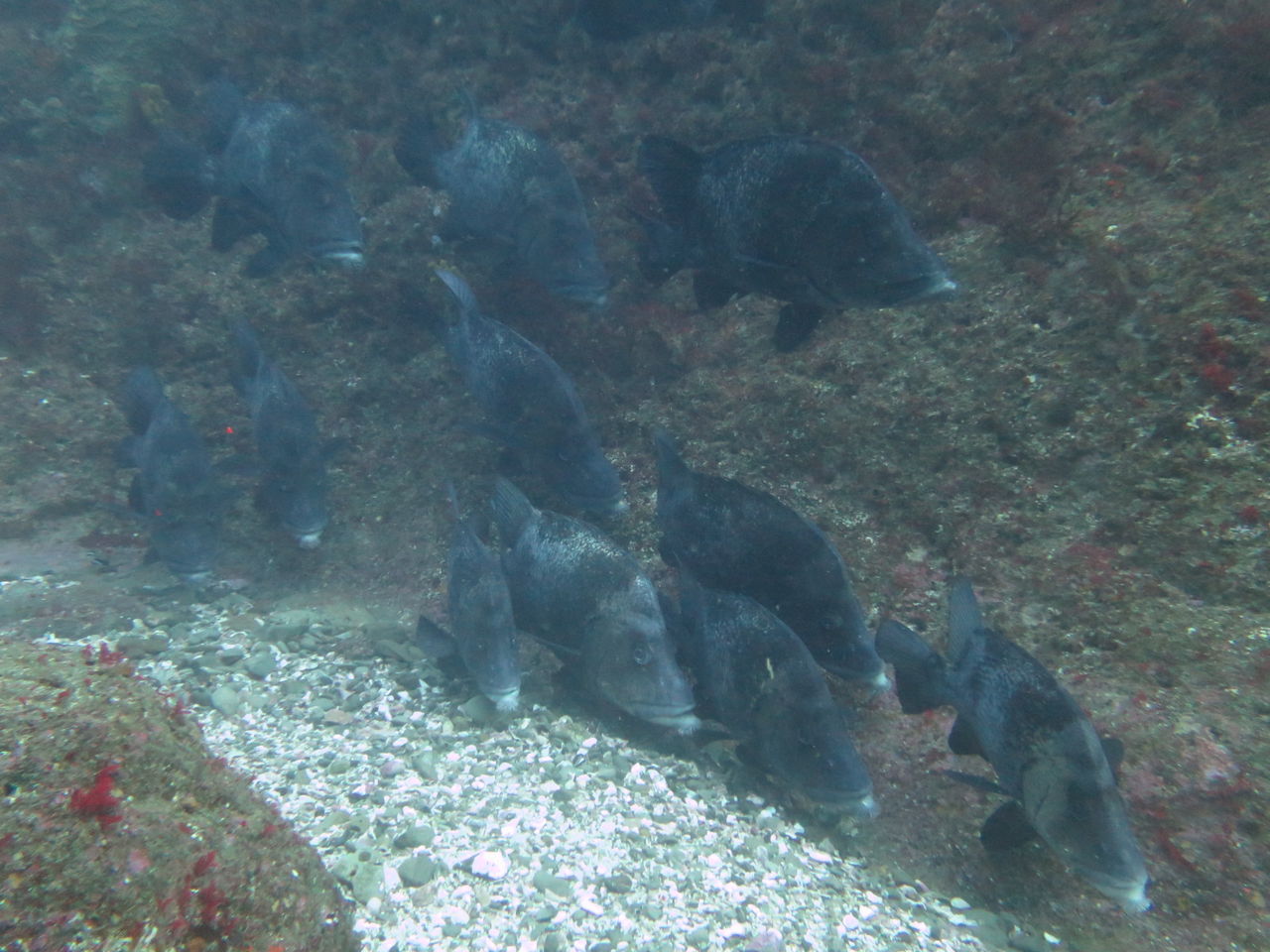 水底にタカノハダイが25匹くらい張り付いていたので、一緒に張り付いて観察☆ アナゴ岩にはスミゾメミノウミウシが2匹確認できます。