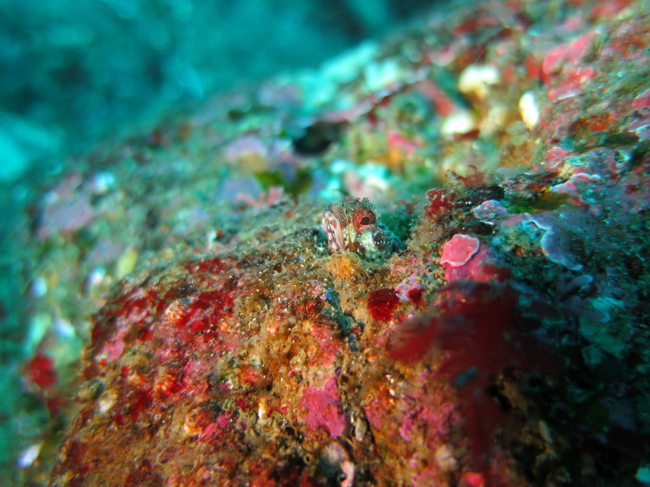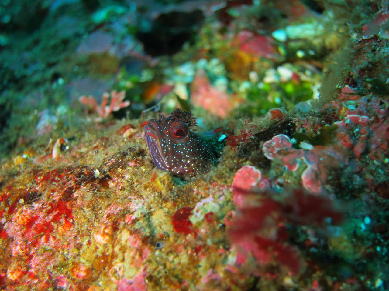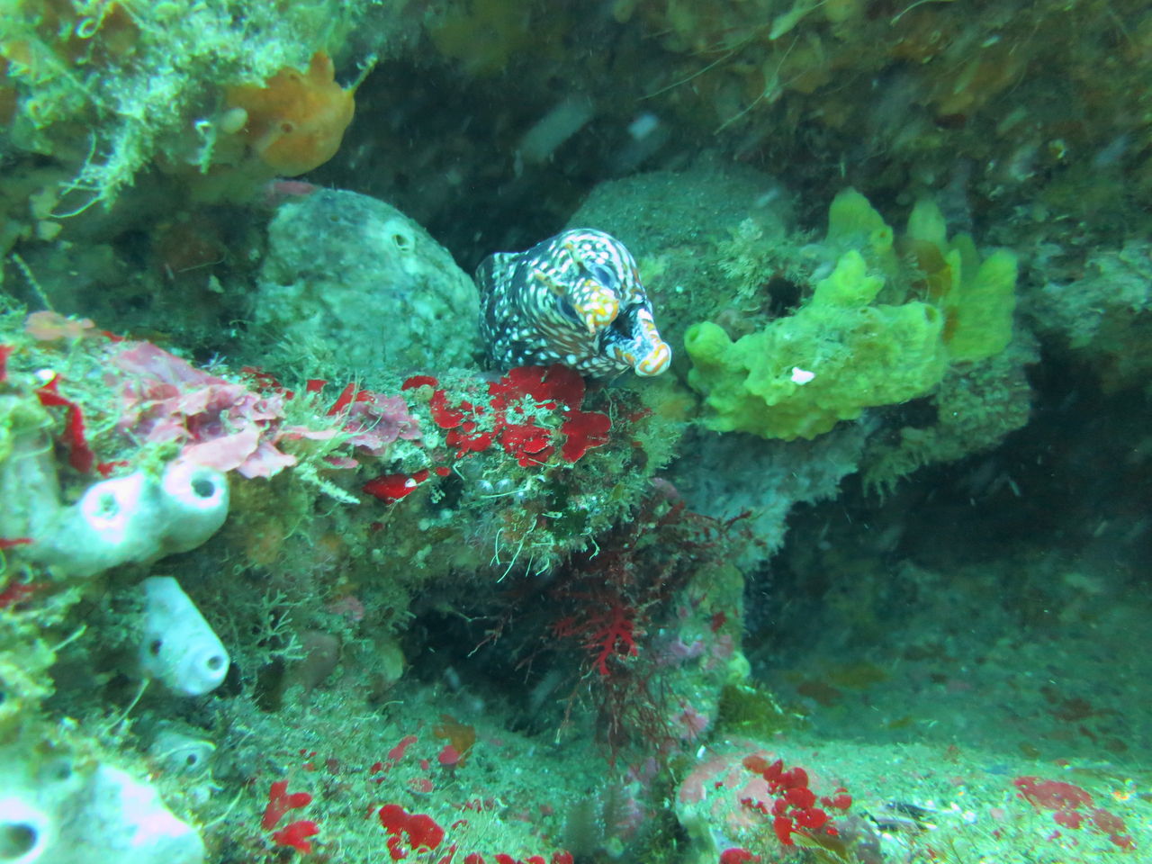 水底もいい色です(*^_^*) 中層にはマダイがゴロゴロ、ここにもキビナゴの群れが入って来てました!にぎやかー(^^♪ ゲストさんの話だと一本目にV字谷周辺でトビエイが出たとか\(◎o◎)/!とりあえず大根周辺をウロウロ・・・ホシエイやアカエイには会いましたが、トビエイには会えず(T_T)/~~~ しかーし!! ヒラマサが3匹ほどトク根の上で泳いでいました(*^_^*)V字谷にはヒゲダイが終結☆ その反対側の壁にとんでもなくでかいマルツノガニが隠れていますよ♪ みなさん是非探してみてください☆