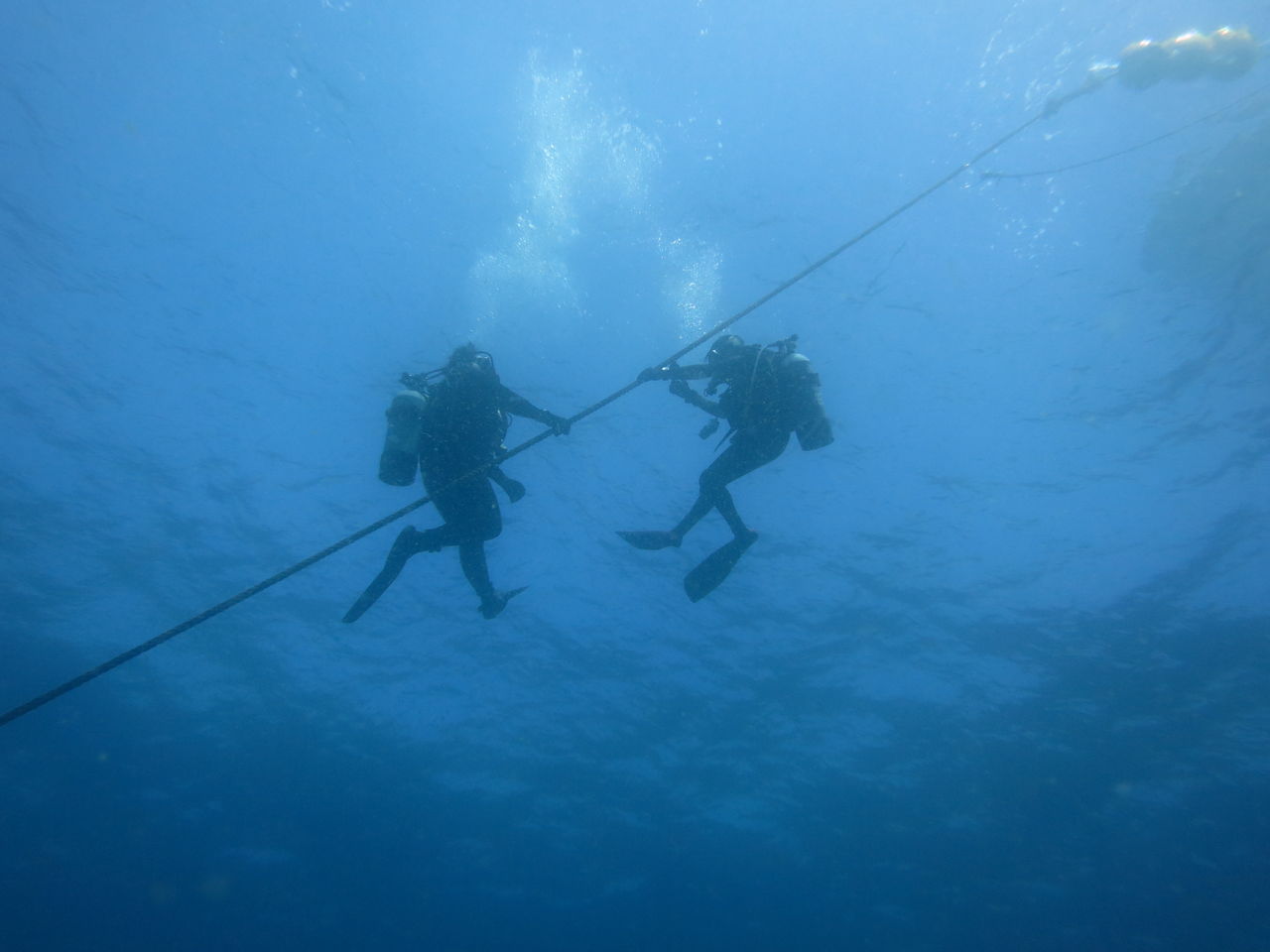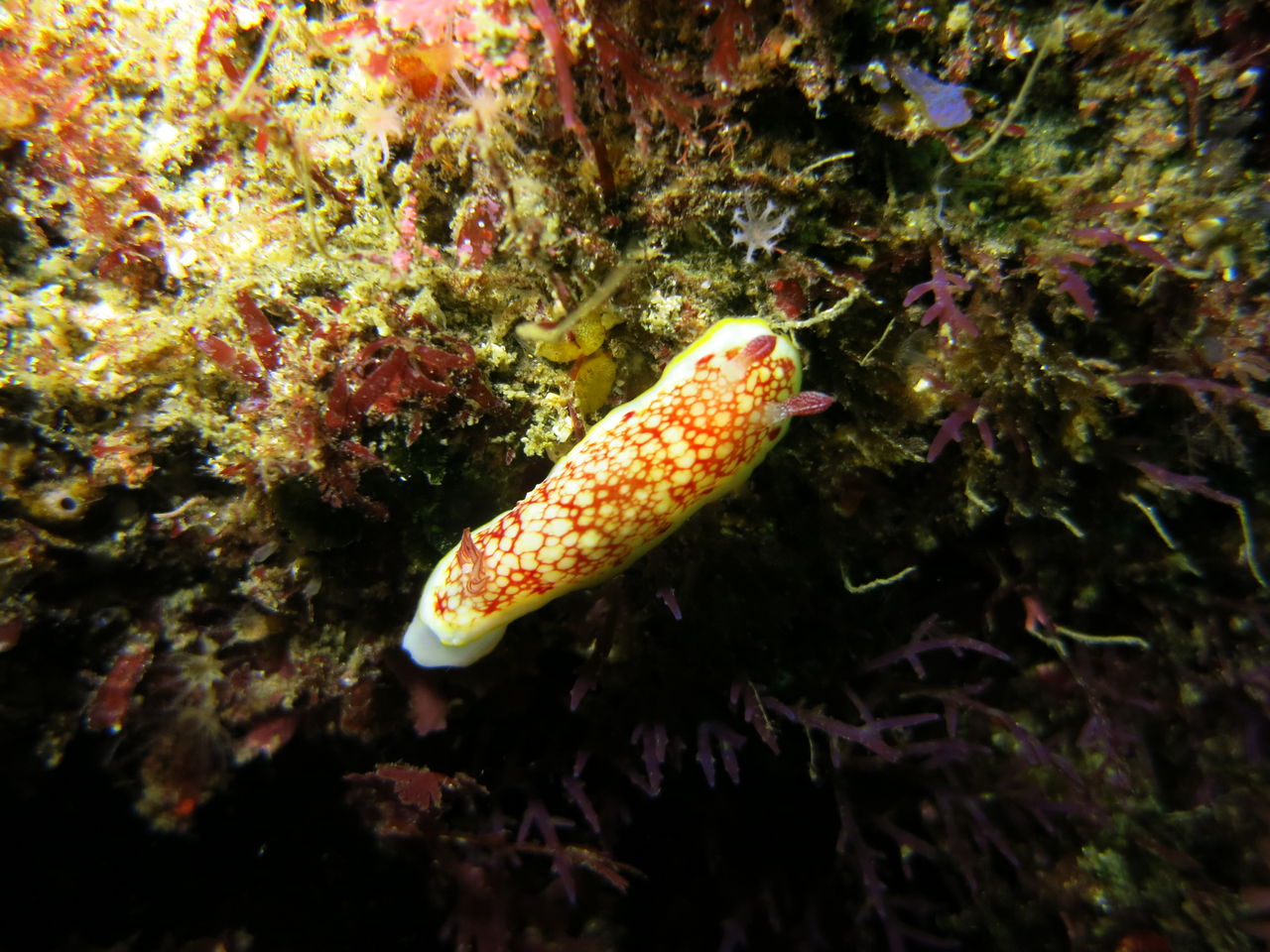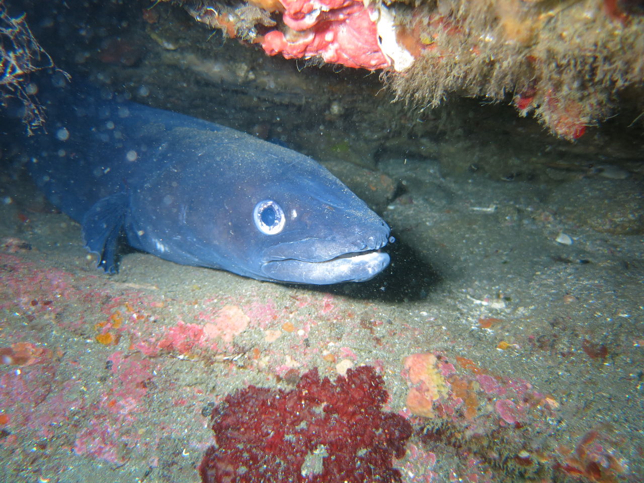 10mは見えてますよ☆ 流れは北からゆっくり♪トビエイ根にはクロアナゴが2匹、東側の穴の中にいるやつのほうが顔出してくれます(^v^)北の岩の麓にテントウウミウシが二匹居ました、2mmぐらい(笑)サメ穴には金色のヒラメを発見!もう一匹は黒でしたが、常に一緒に行動していました。アナゴ岩の上にキビナゴの群れが泳いでいました。青物を待っていましたが、現れず・・・大人しくポイントに帰還。