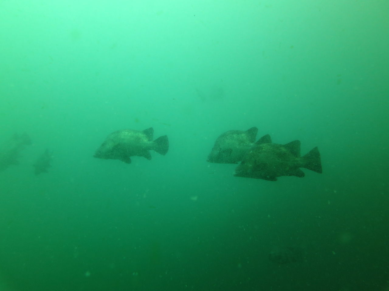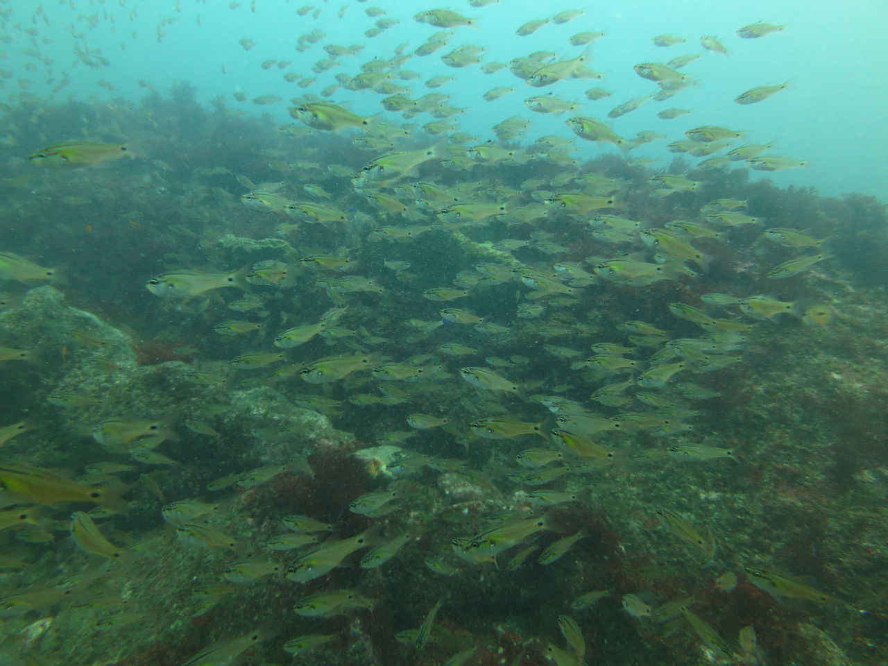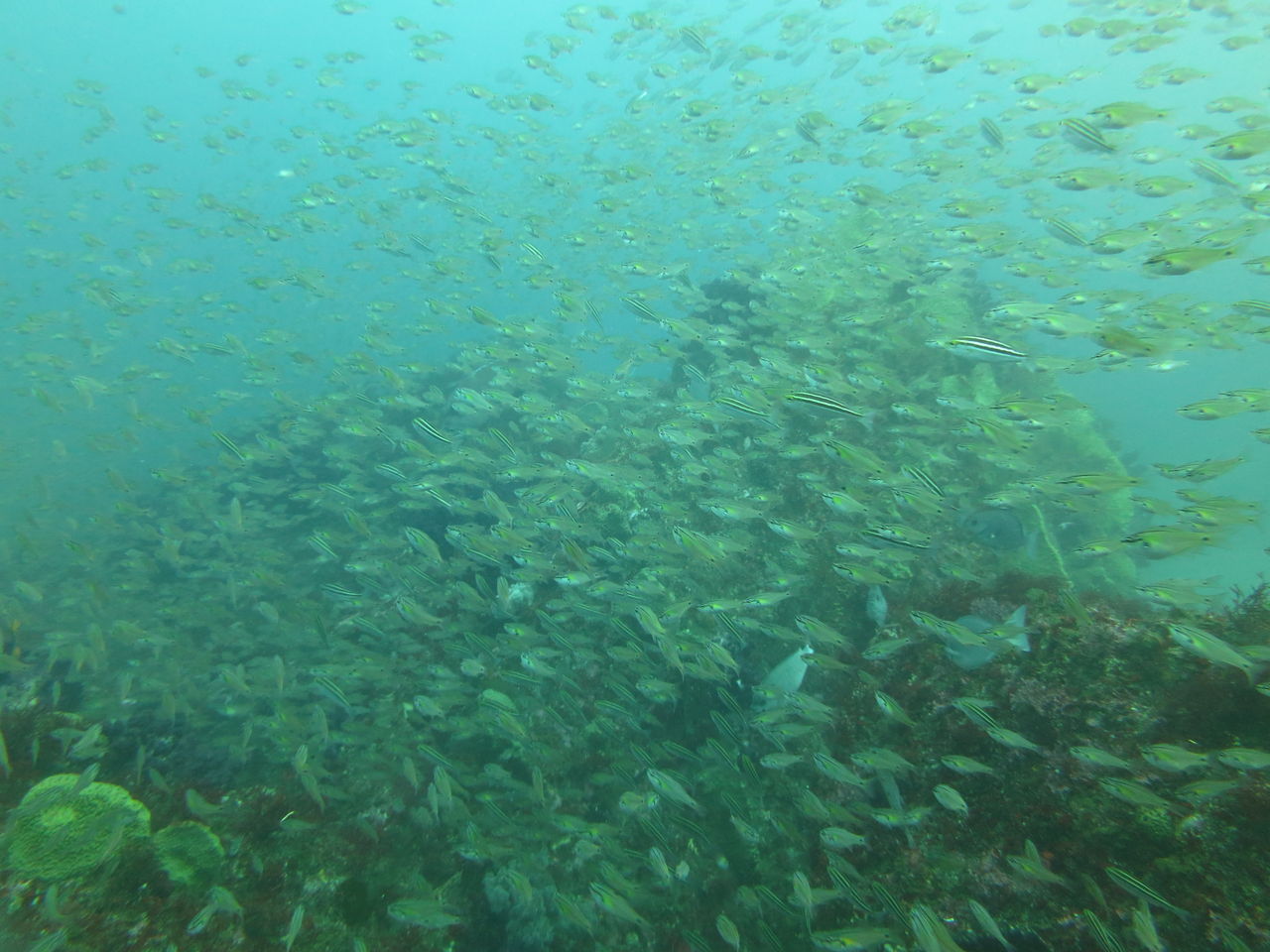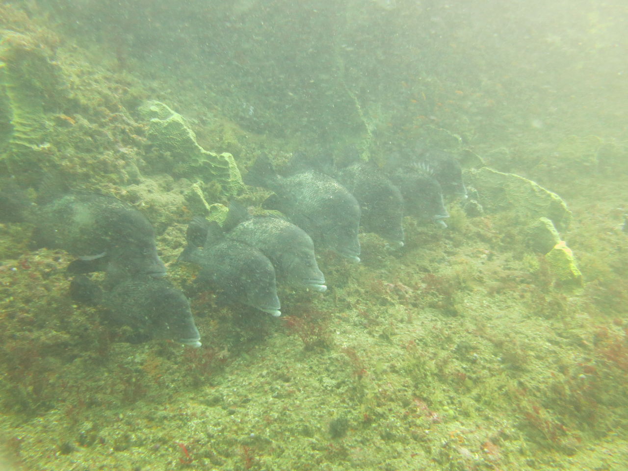 程よい流れの中V字谷を目指します。イサキがグッチャリ群れていました(*^_^*)スズメダイもたくさん☆ヒゲダイももちろんたくさん泳いでいます♪離れ根に移動すると泡好きのモロコさんが近寄って来てくれました。しばらく僕らの上でホバリング♪