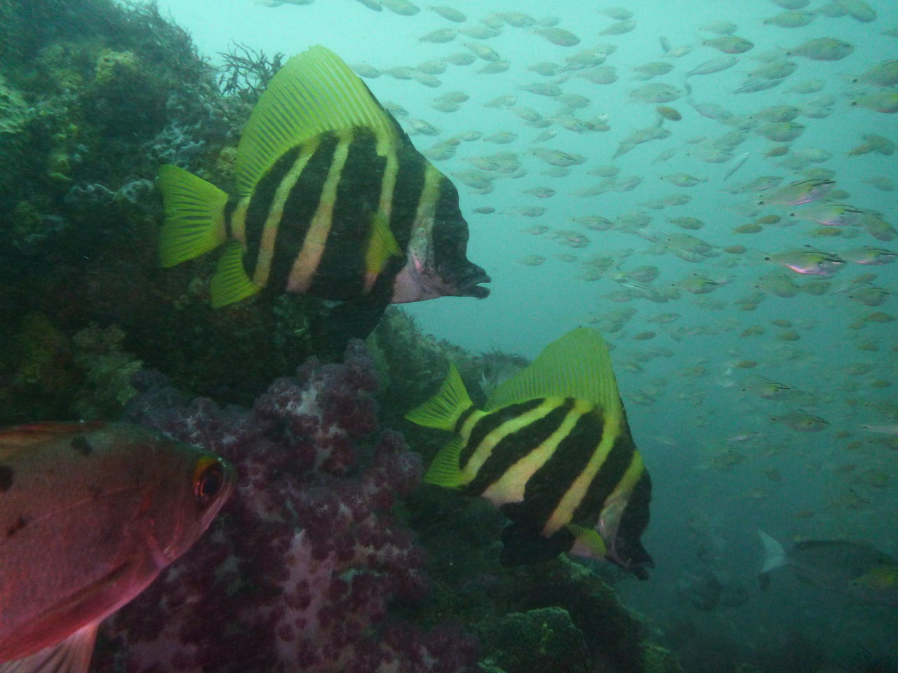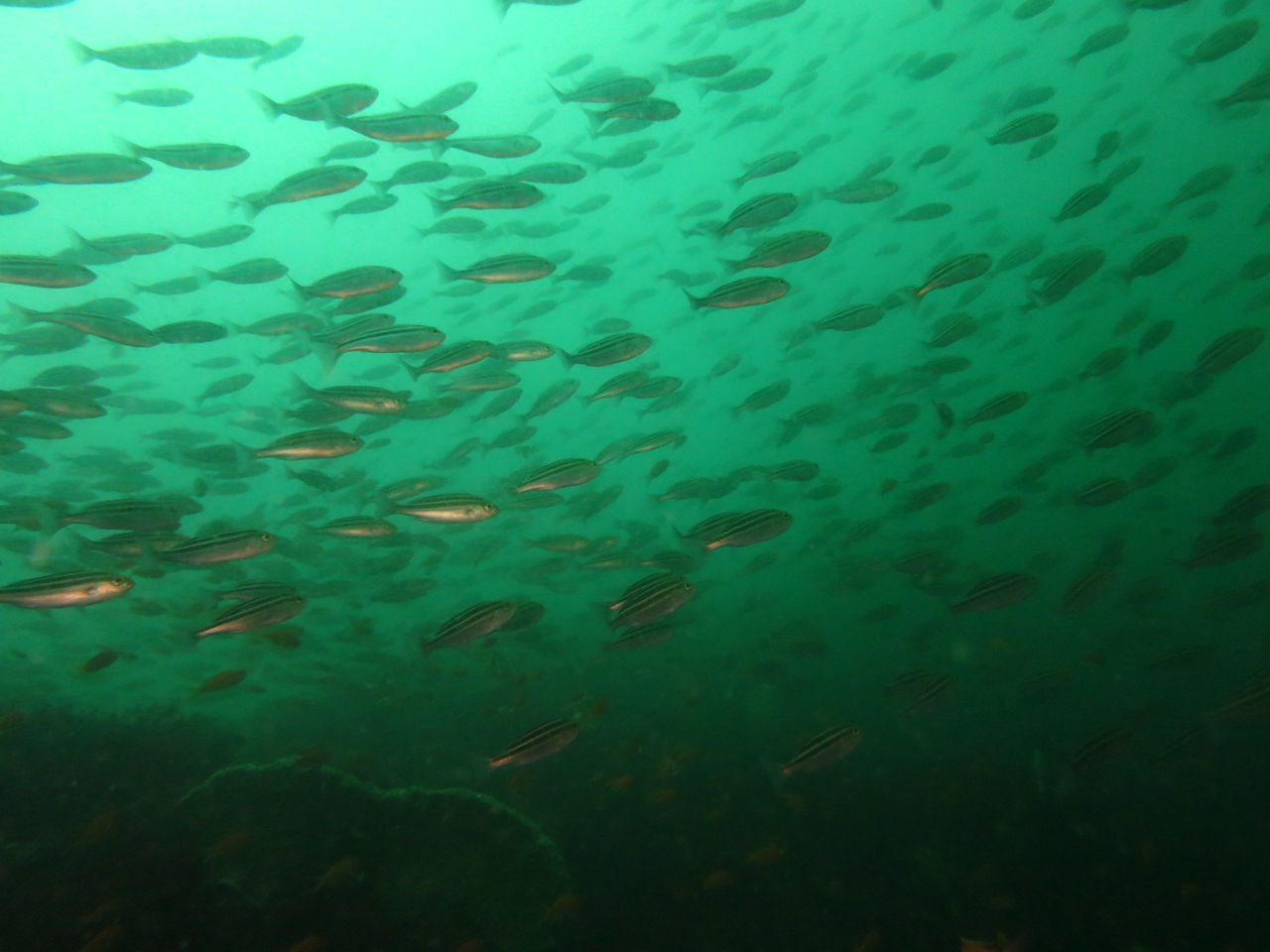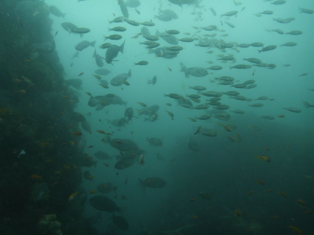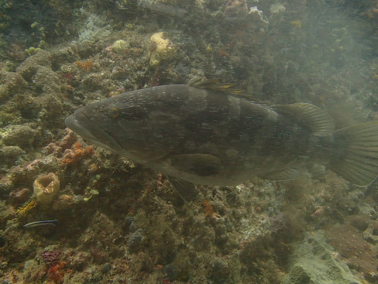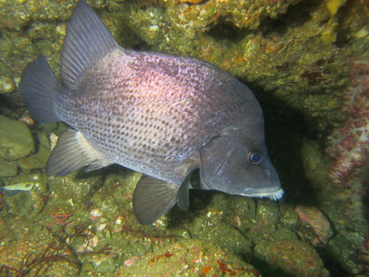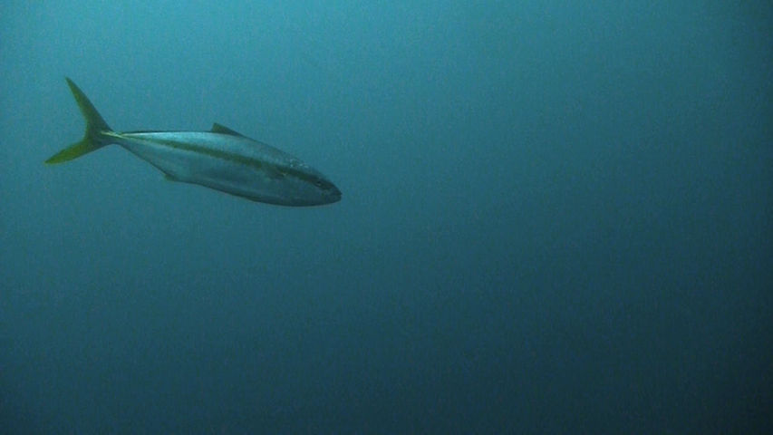 2本目もAポイントからです。北からの流れですが、意外と緩やかなので、南側のエリアを回りました。中層を気にしながら移動しましたが、見通しがよくないので、何かを見つけても、よく観察することが出来ないのが残念です。V字谷は、閑散とした感じでしたが、その上をイサキの群れが、列を成していました。