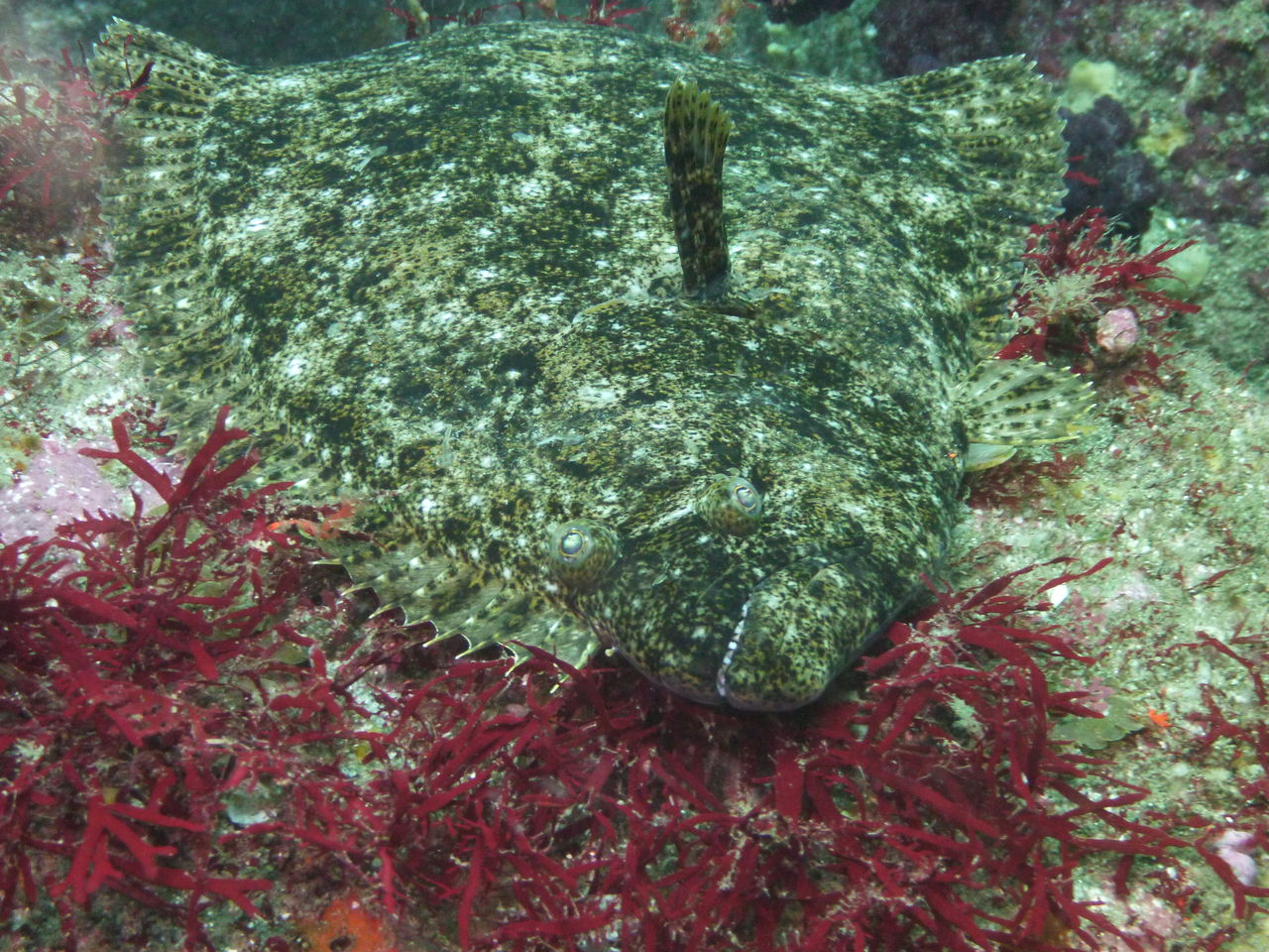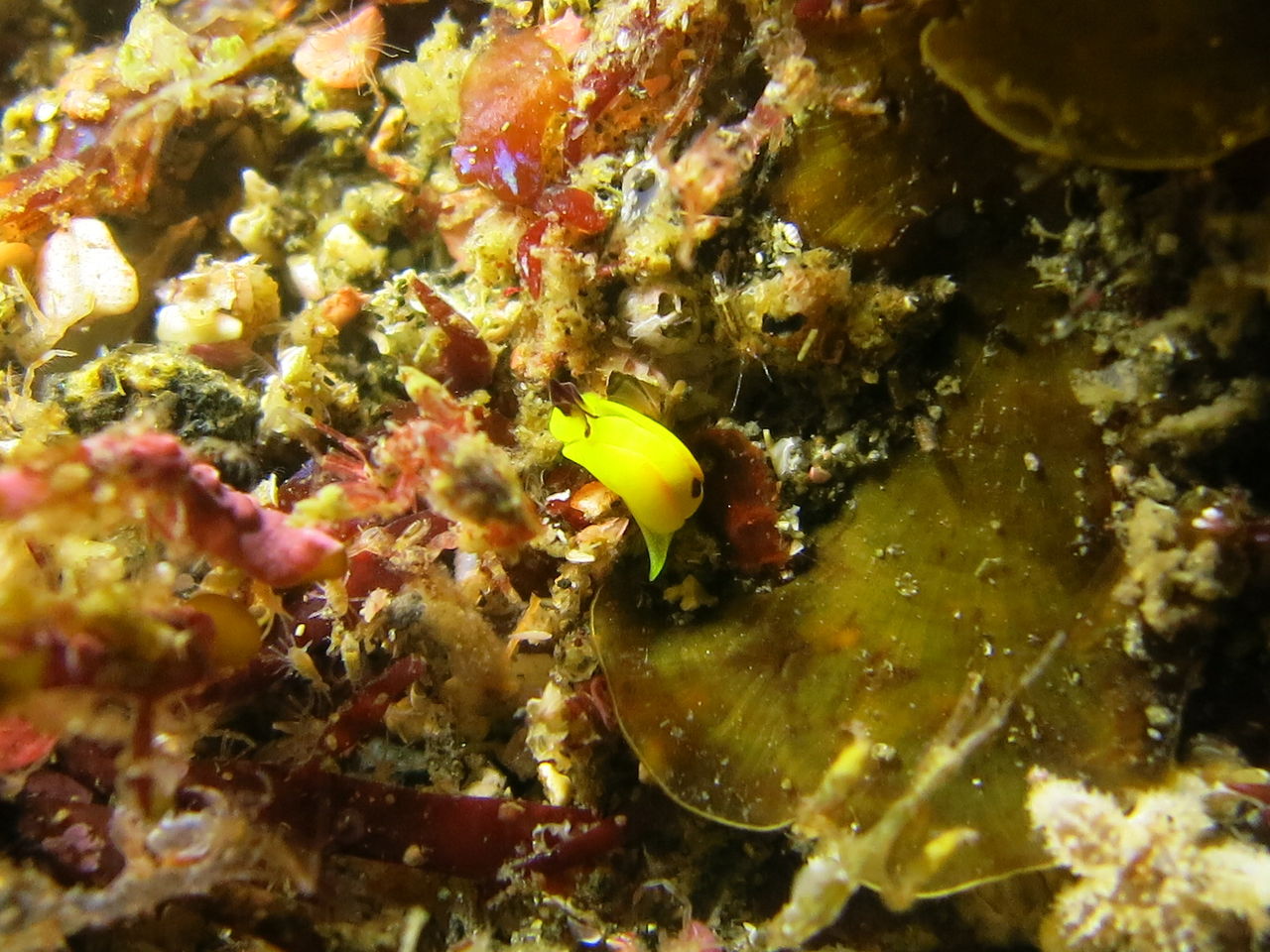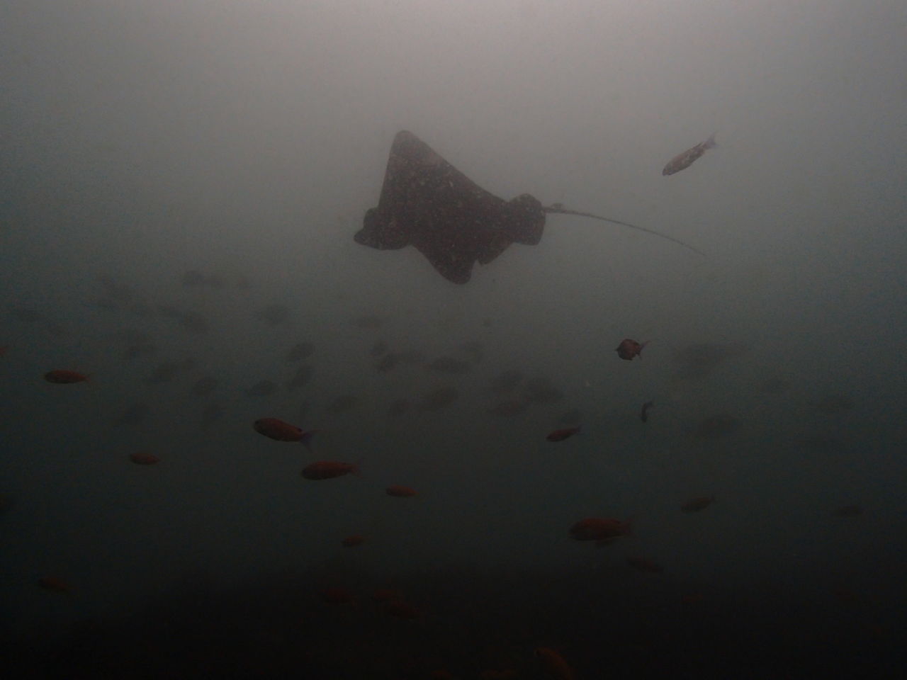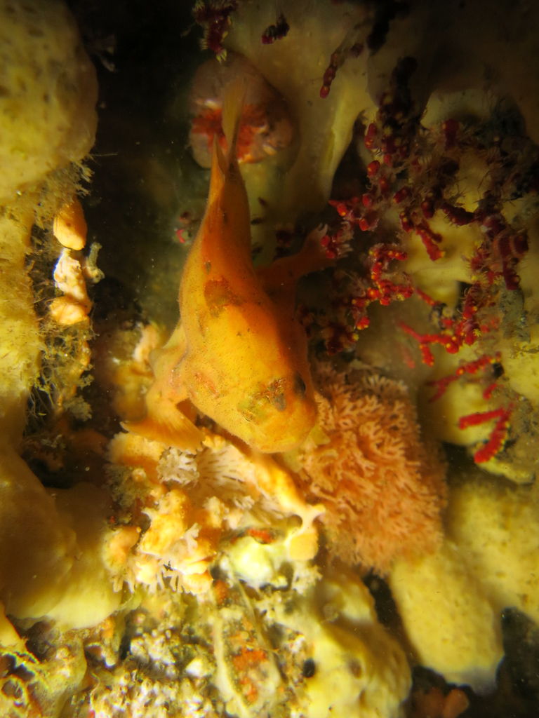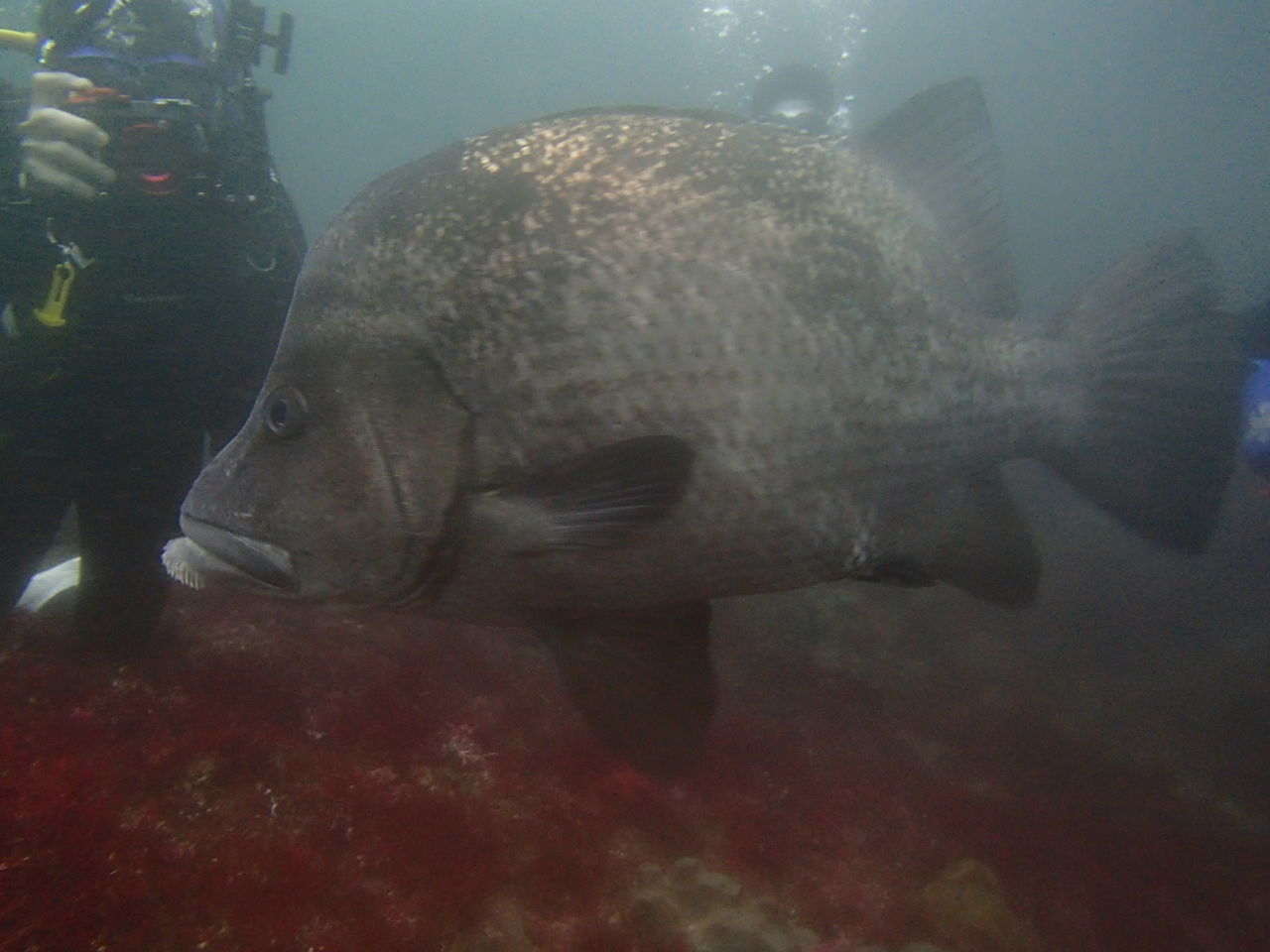 1本目はAポイントからです。中層は濁っていますが、水底付近はそれほどひどくありません。ただ、少しひんやりとします。北からの緩い流れなので、北側のエリアを回ります。トビエイとの遭遇を期待しましたが、今日は不発。しかし、他のスタッフは目撃したそうなので、すぐにチャンスは巡ってくるでしょう。エキジット時、いい潮が入ってきたようで、表層の水が青く、暖かかったです。早くきれいな水と入れ替わって欲しいです。