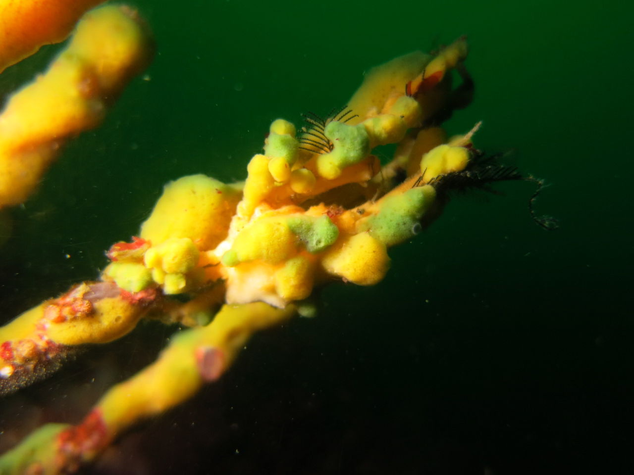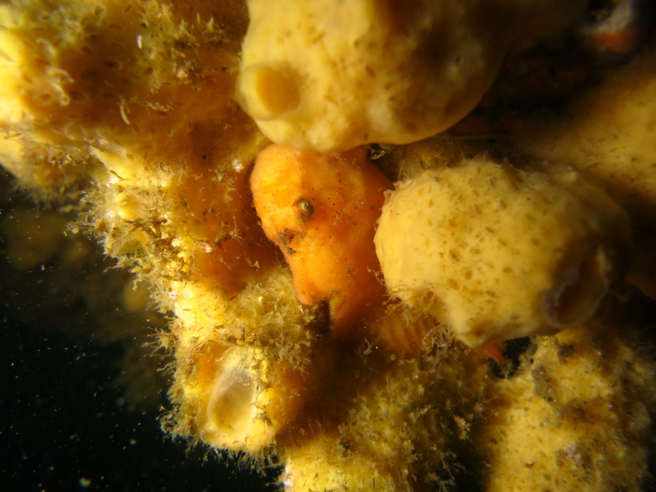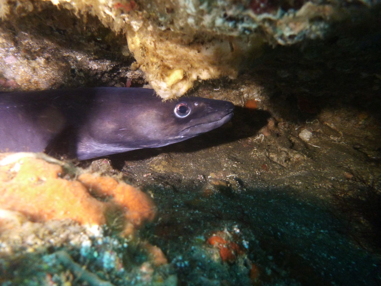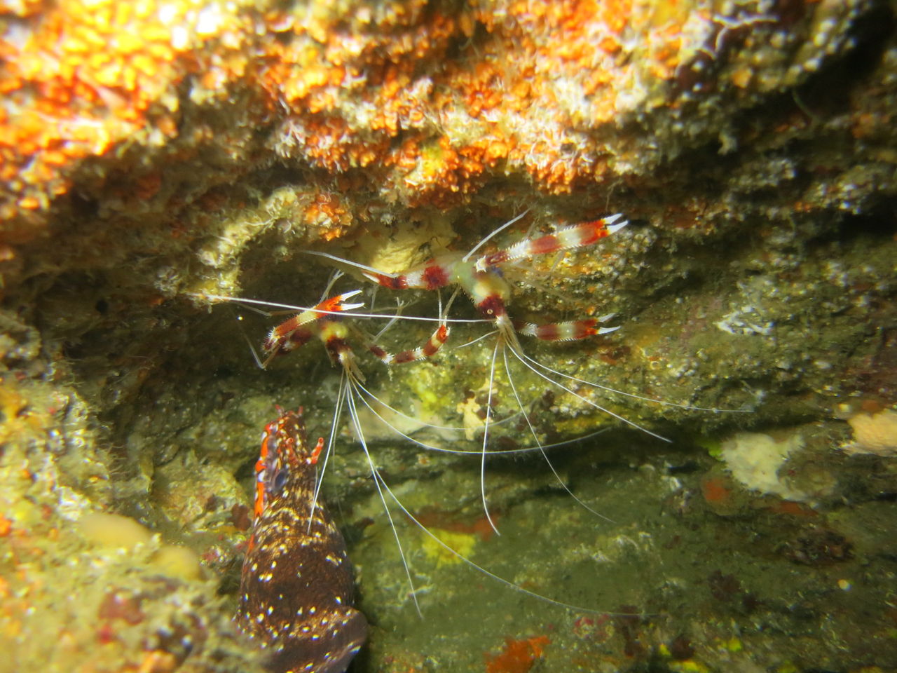 1本目はAポイントからです。中層は濁っていますが、水底付近はそれほどひどくありません。ただ、少しひんやりとします。北からの緩い流れなので、北側のエリアを回ります。トビエイとの遭遇を期待しましたが、今日は不発。しかし、他のスタッフは目撃したそうなので、すぐにチャンスは巡ってくるでしょう。エキジット時、いい潮が入ってきたようで、表層の水が青く、暖かかったです。早くきれいな水と入れ替わって欲しいです。