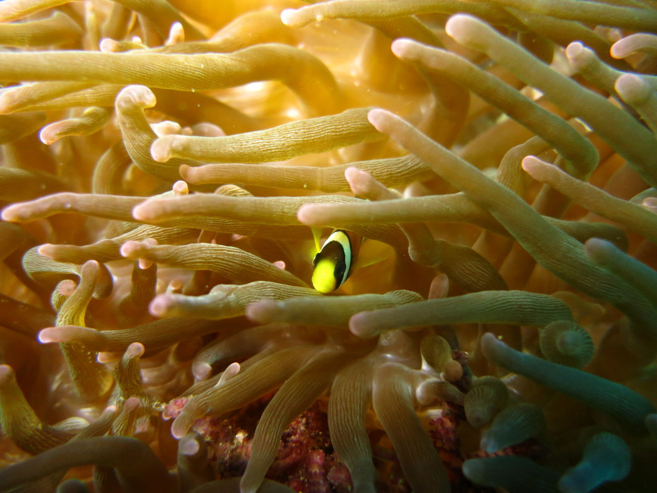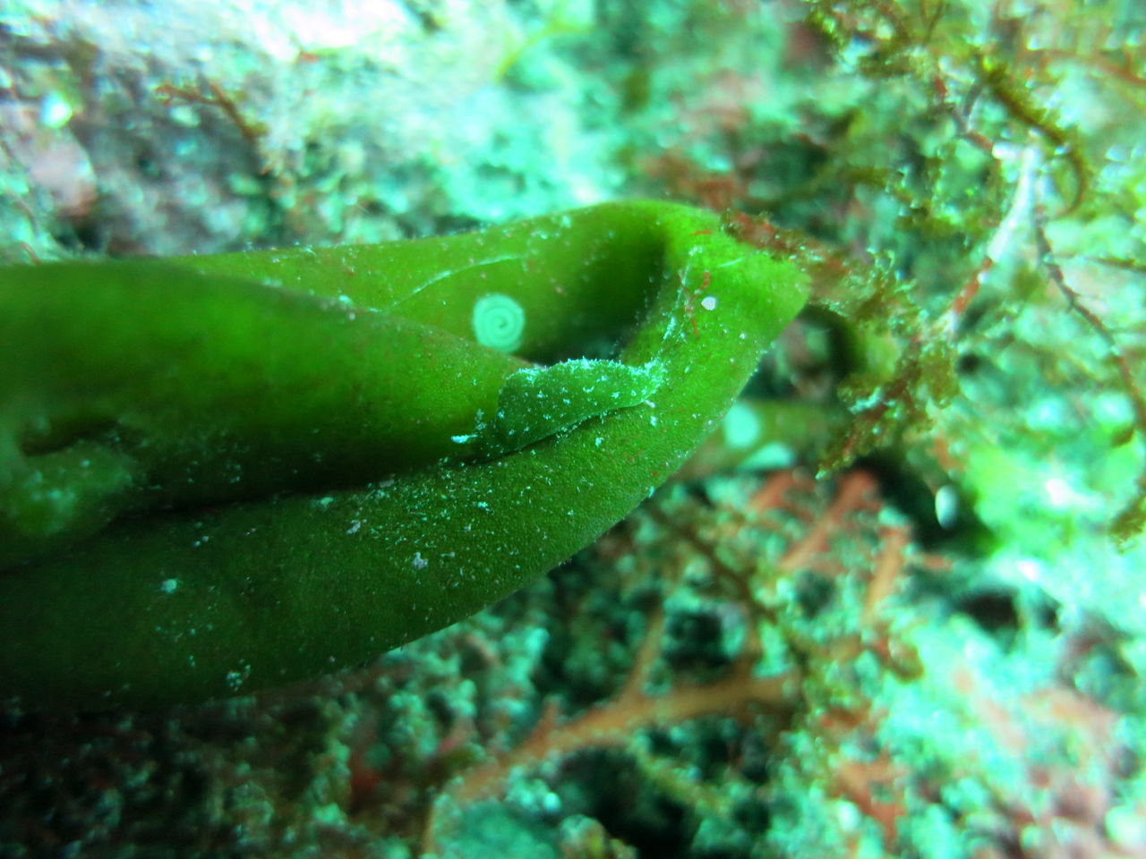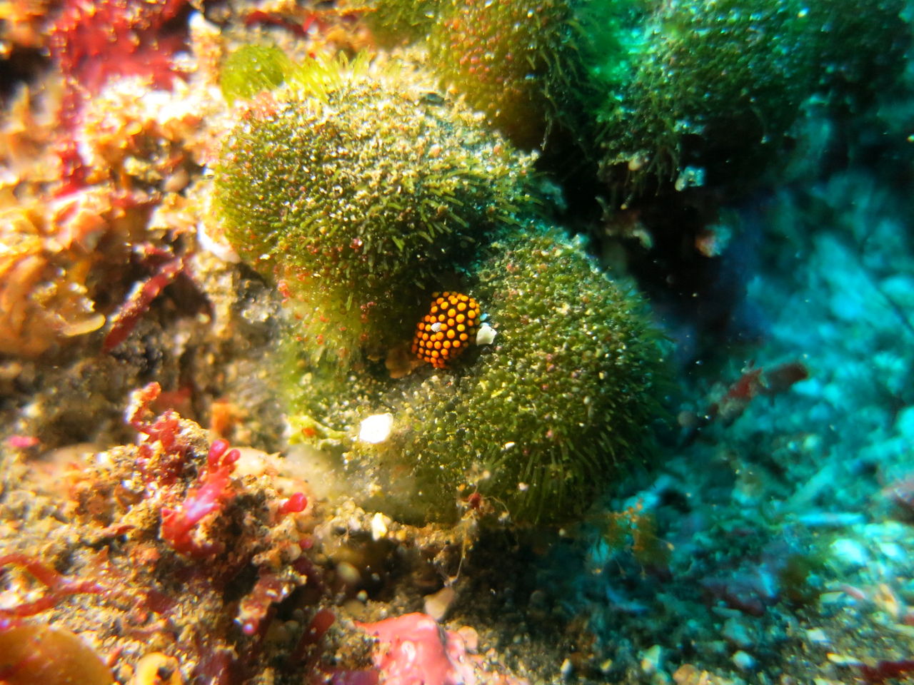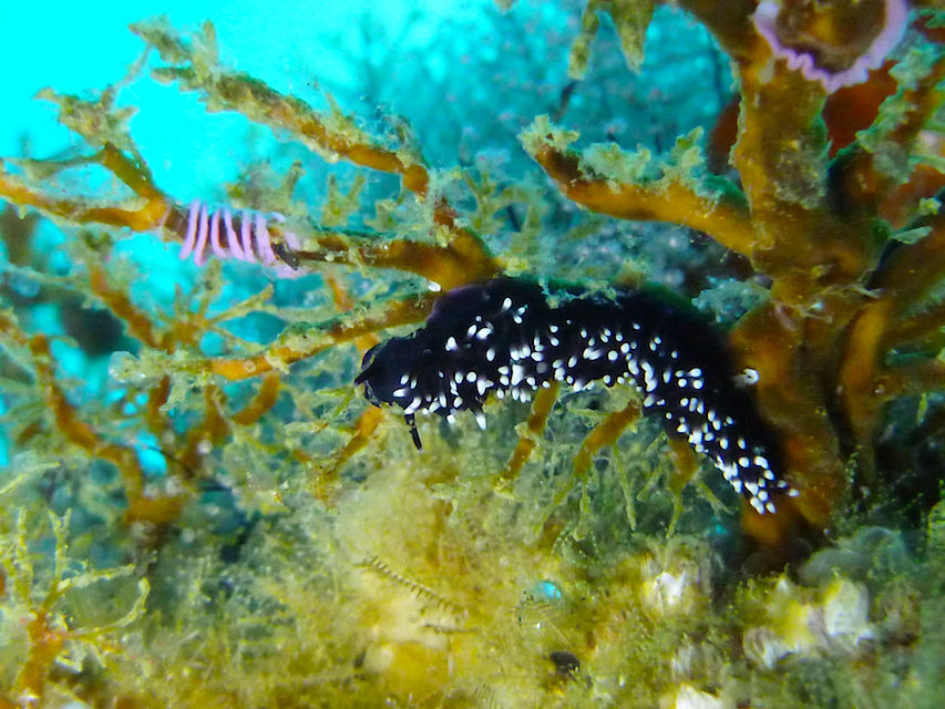 おぉぉう!!水底見えてるじゃん☆やったー!入ってみると潮も無くまったりな海でした☆ 時化の後だったのでチェーンが切れてないかどうか確認しながら進みます。トビエイの根にはイシガキフグが一匹住み着いています。イソギンチャクのまわりも賑やかですよ、クマノミやシラコダイ、ニシキベラなどもたくさん泳いでいます。そのままCポイントへ、チェーンは無事ですね☆そのままV字谷へ、ヒゲダイは中層にフワフワ♪ モロコもそこら中にゴロゴロいます♪ 帰りがけにテントウウミウシを一匹見つけました。ヒラマサも2匹出ていますよ!
