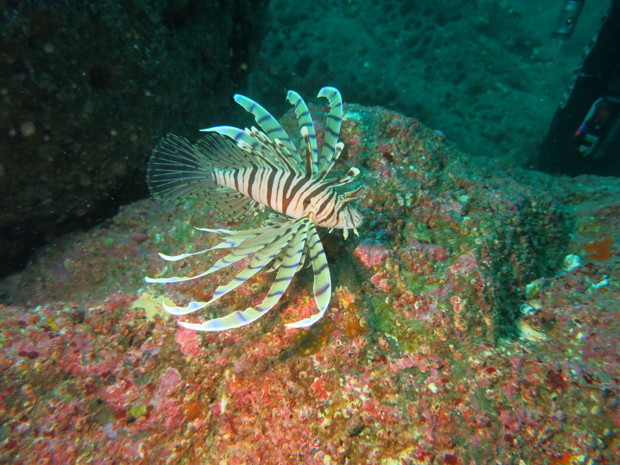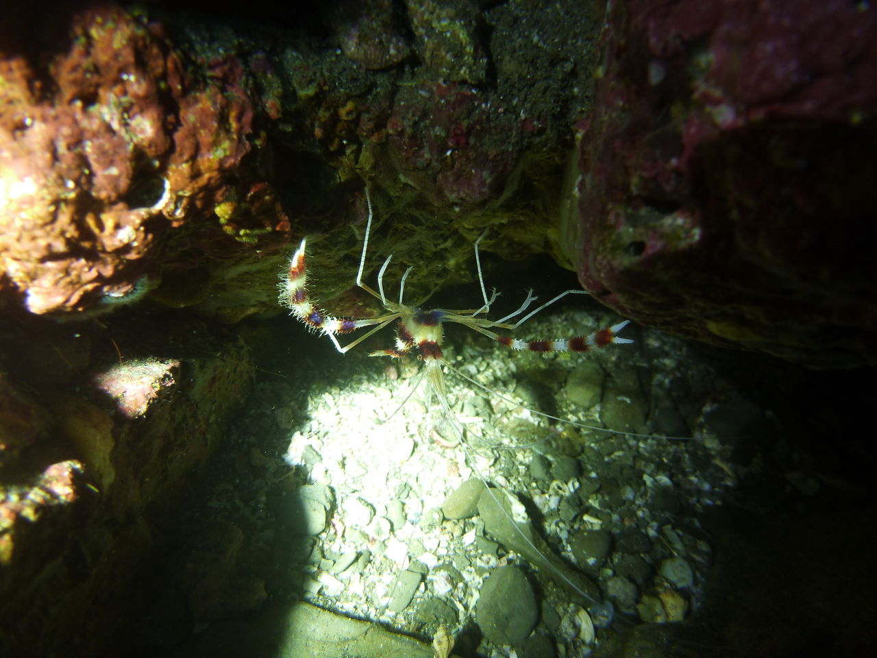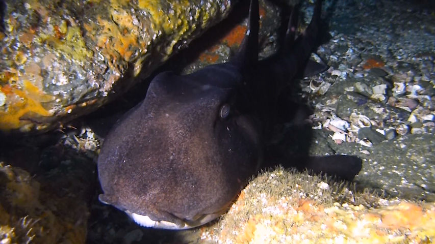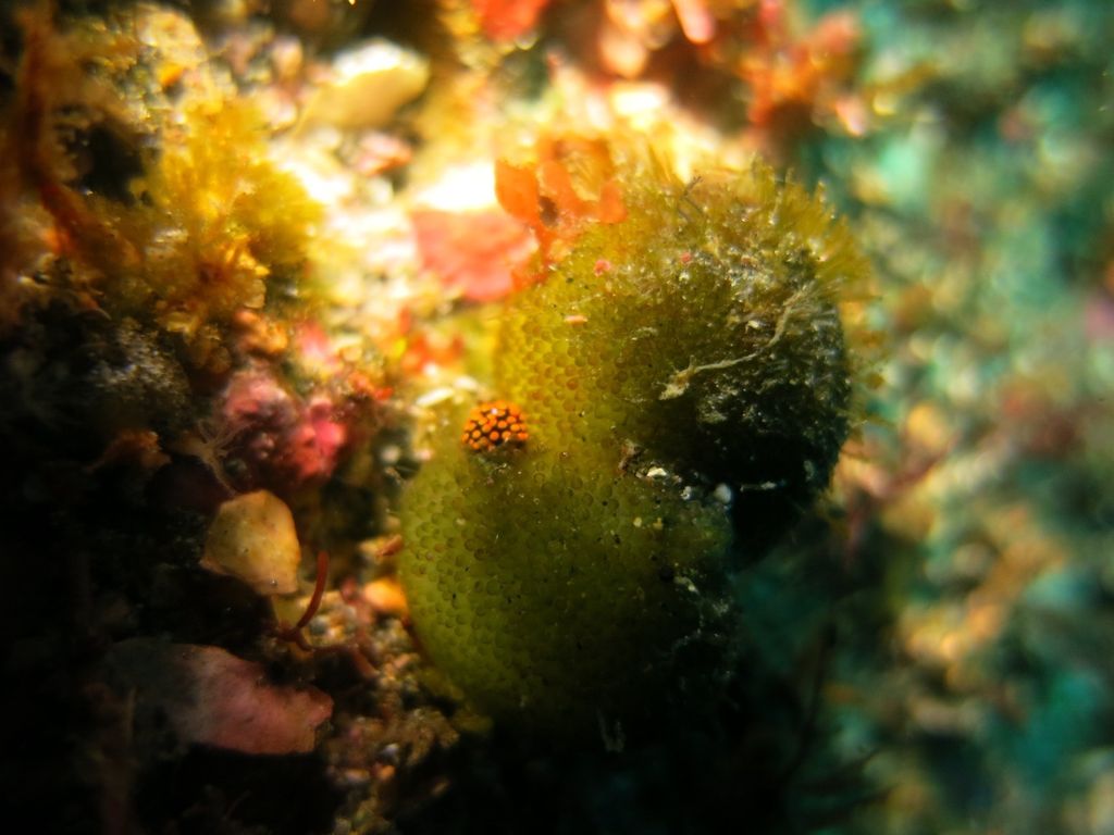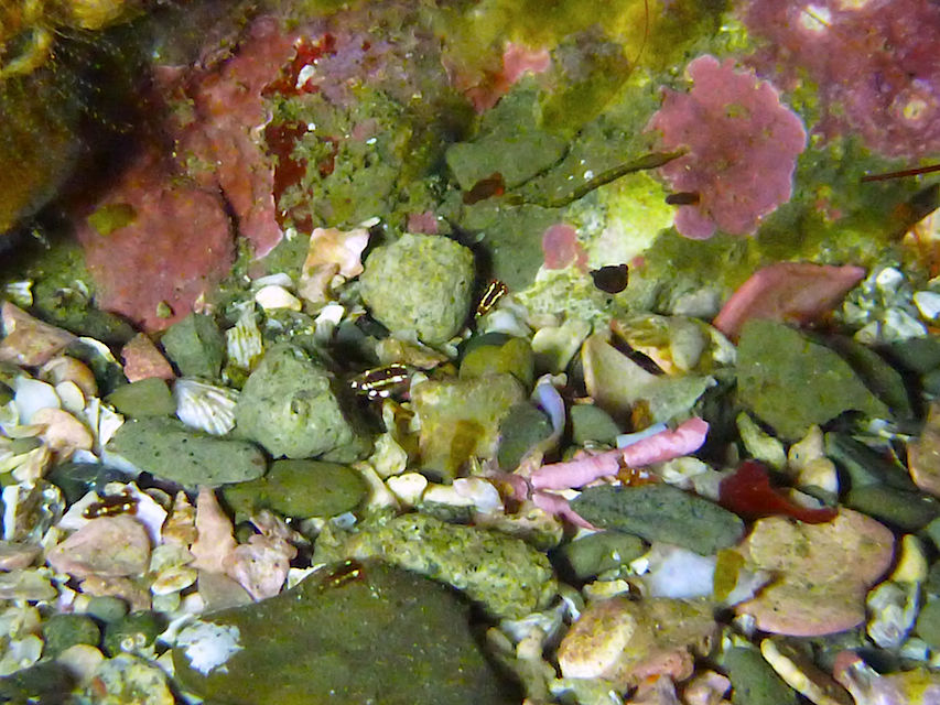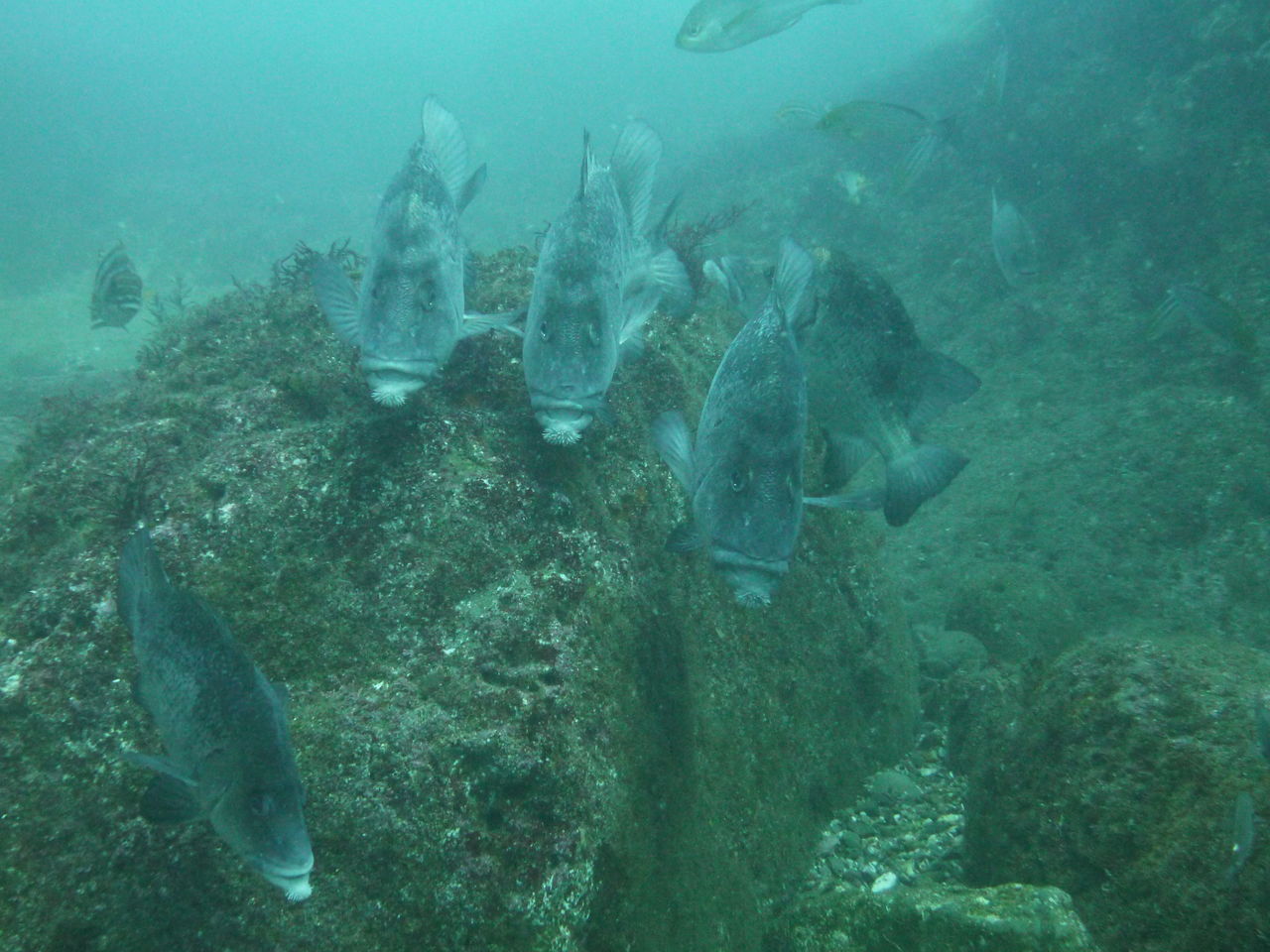 潮は北からに変わってすこーし流れてきました。サメ穴を目指します。途中イソギンチャクの中にイソギンチャクモエビが二匹入っていました。大きいの一匹、小さいの一匹です。サメ穴にはネコザメが2匹休憩中♪ テングダイも2匹泳いでいましたよ。中層にはイサキの群れが雲のように群れていました。サメ穴はメバルがたくさん集まっています。モロコさんも優雅に泳いでいますよ☆☆ アカエソも何匹かいましたが、イサキたちが高いところにいるので、なかなか飛び掛れないようです(笑)