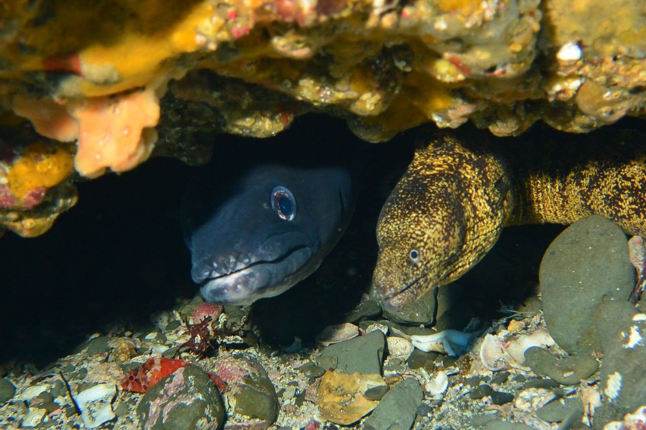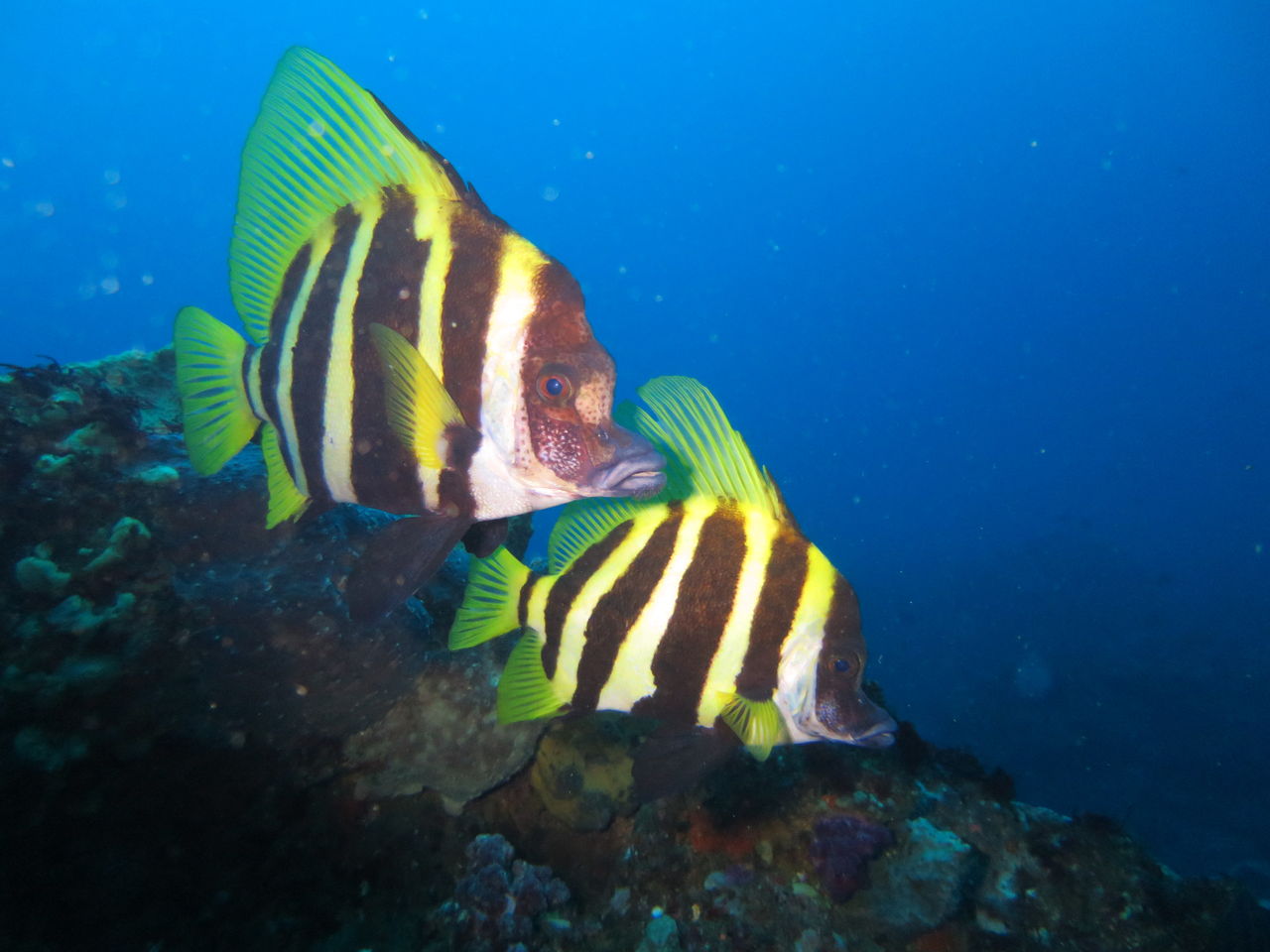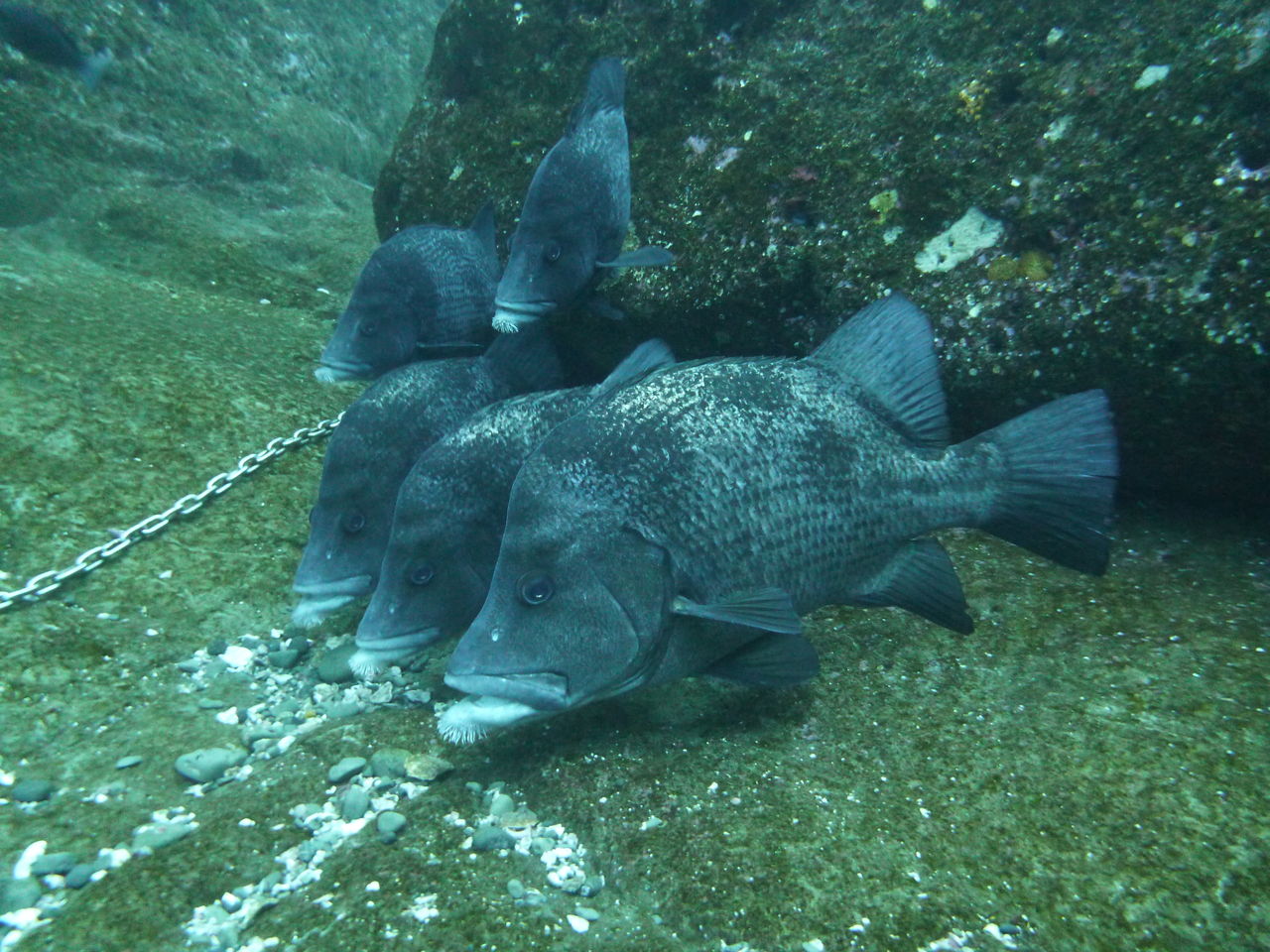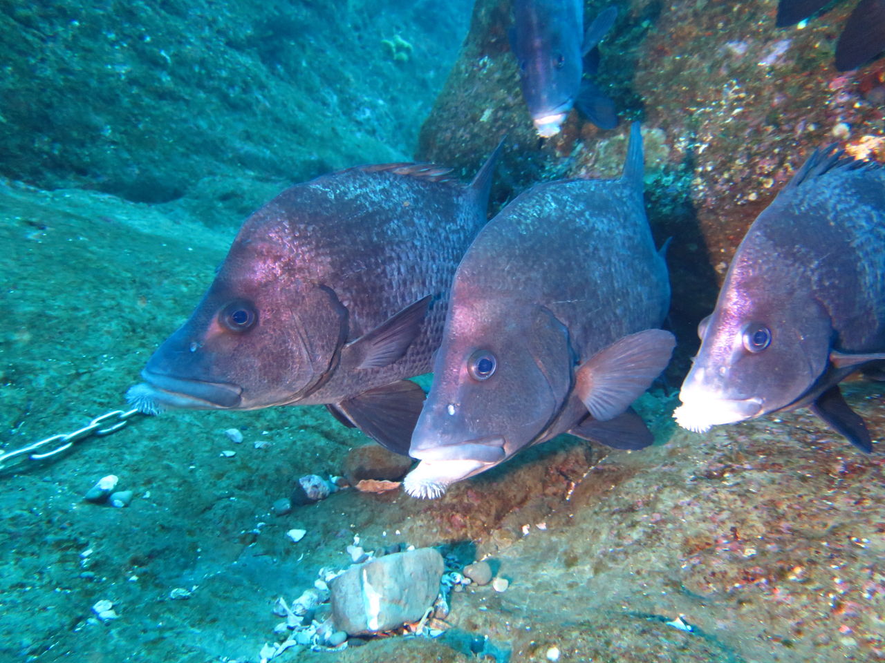 V字谷ではヒゲダイ16匹、モロコ1匹、イシダイが1匹仲良く整列しています。
