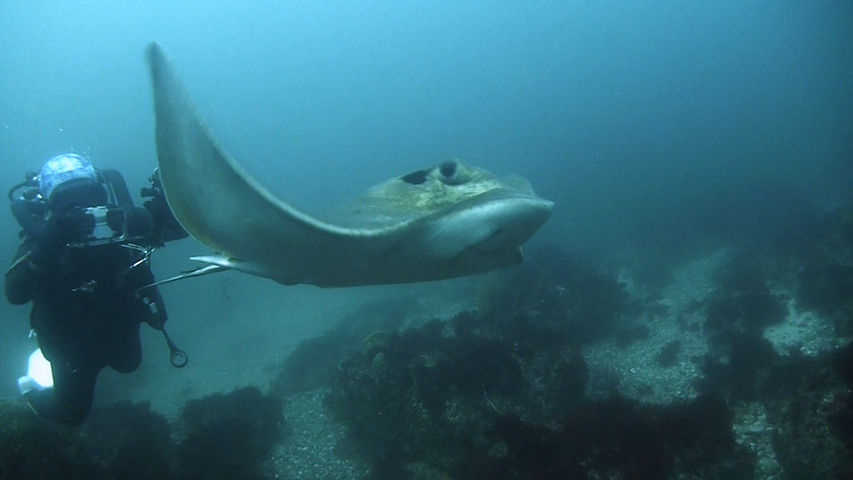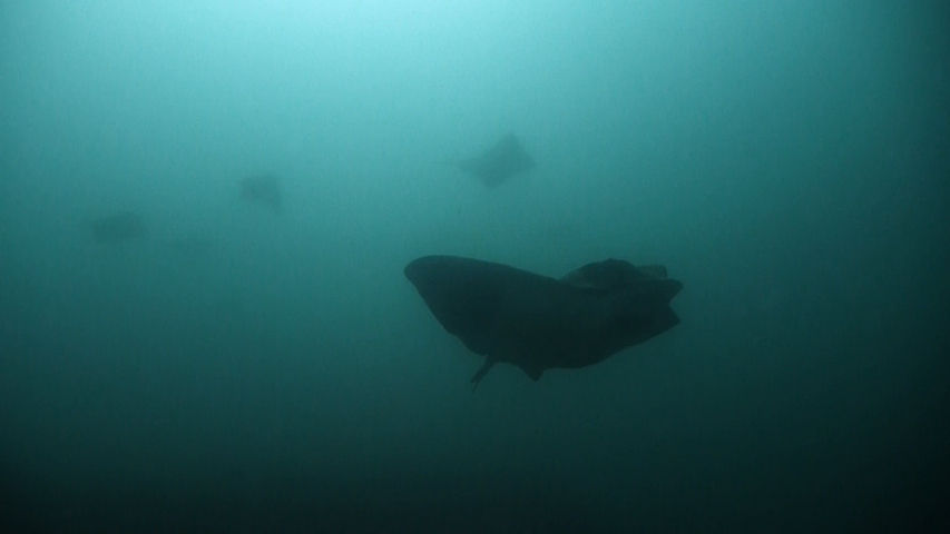 至るところにヒラタエイが居ます。そこへ大きいアカエイが通過。