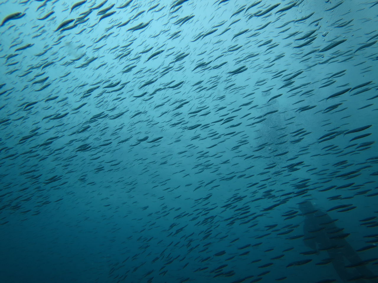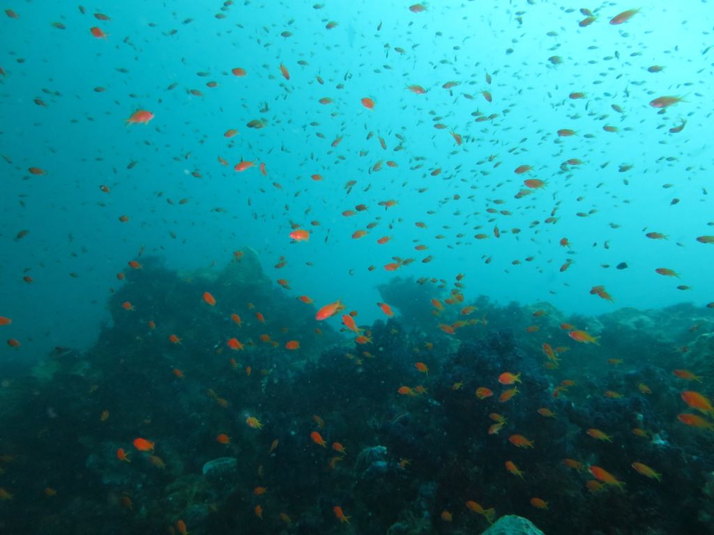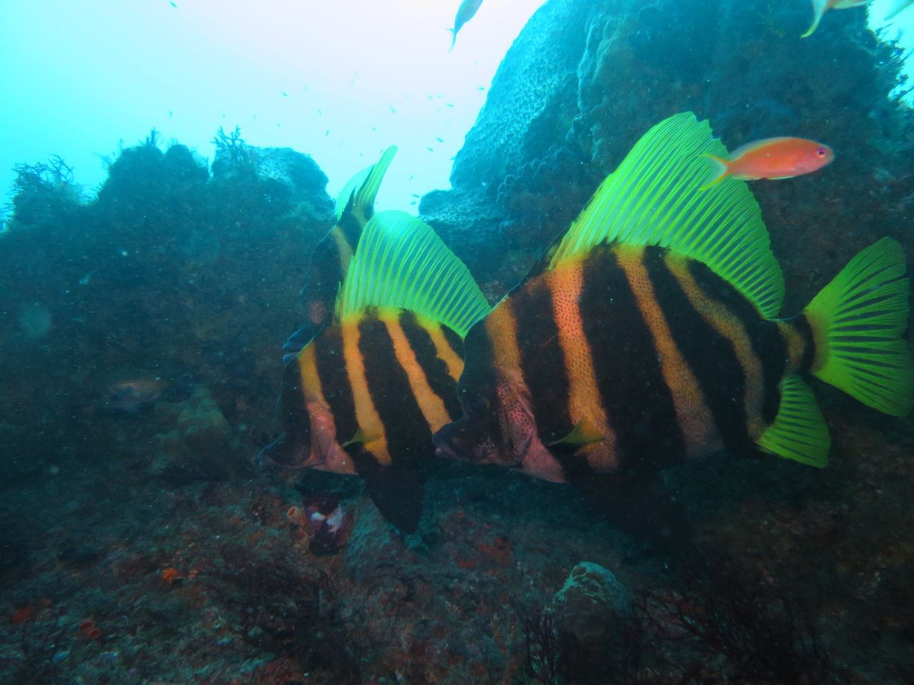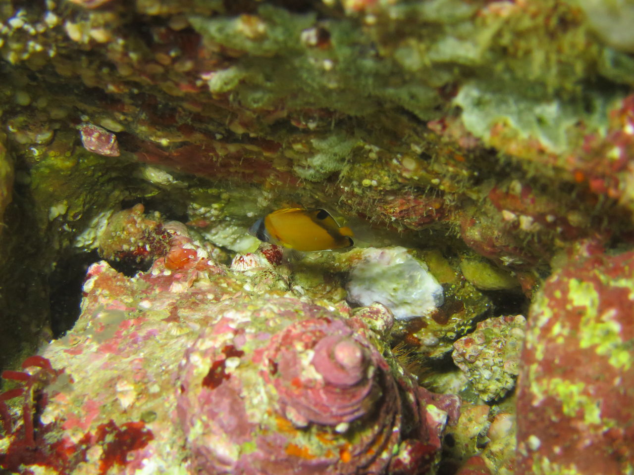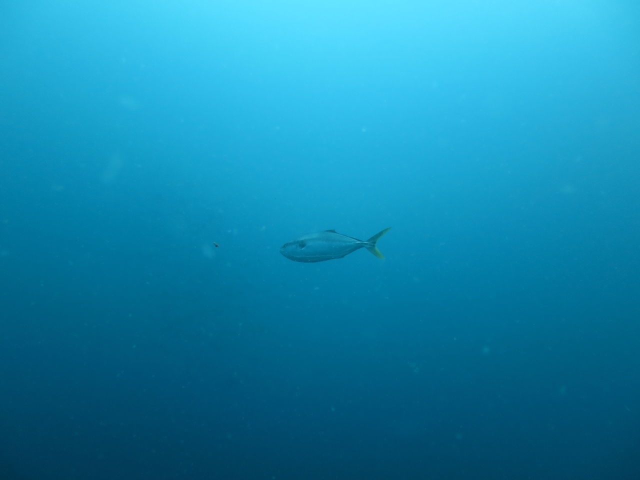 Bポイントからエントリー 時間の経過と共に流れが出てきました。水色は問題ないですが、逆潮が強くなる前に行きましょう。 潜行してすぐにアオリイカの群れに遭遇。少し進むと大きなアオブダイが2匹も泳いでいました。V字谷はイサキだらけ♪ ヒゲダイも7匹ぐらい並んでいます。途中から流れが強くなってきたのでここからドリフト!! 流れに乗ってポイントまで一直線で帰ります。途中可愛いムラサキウミコチョウとトカラベラの幼魚を見て戻りました。
