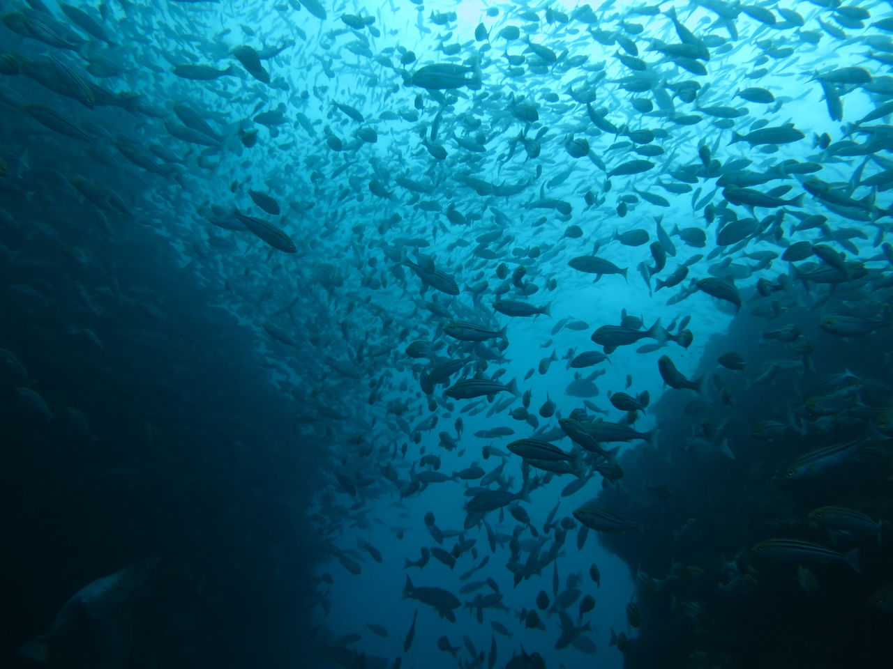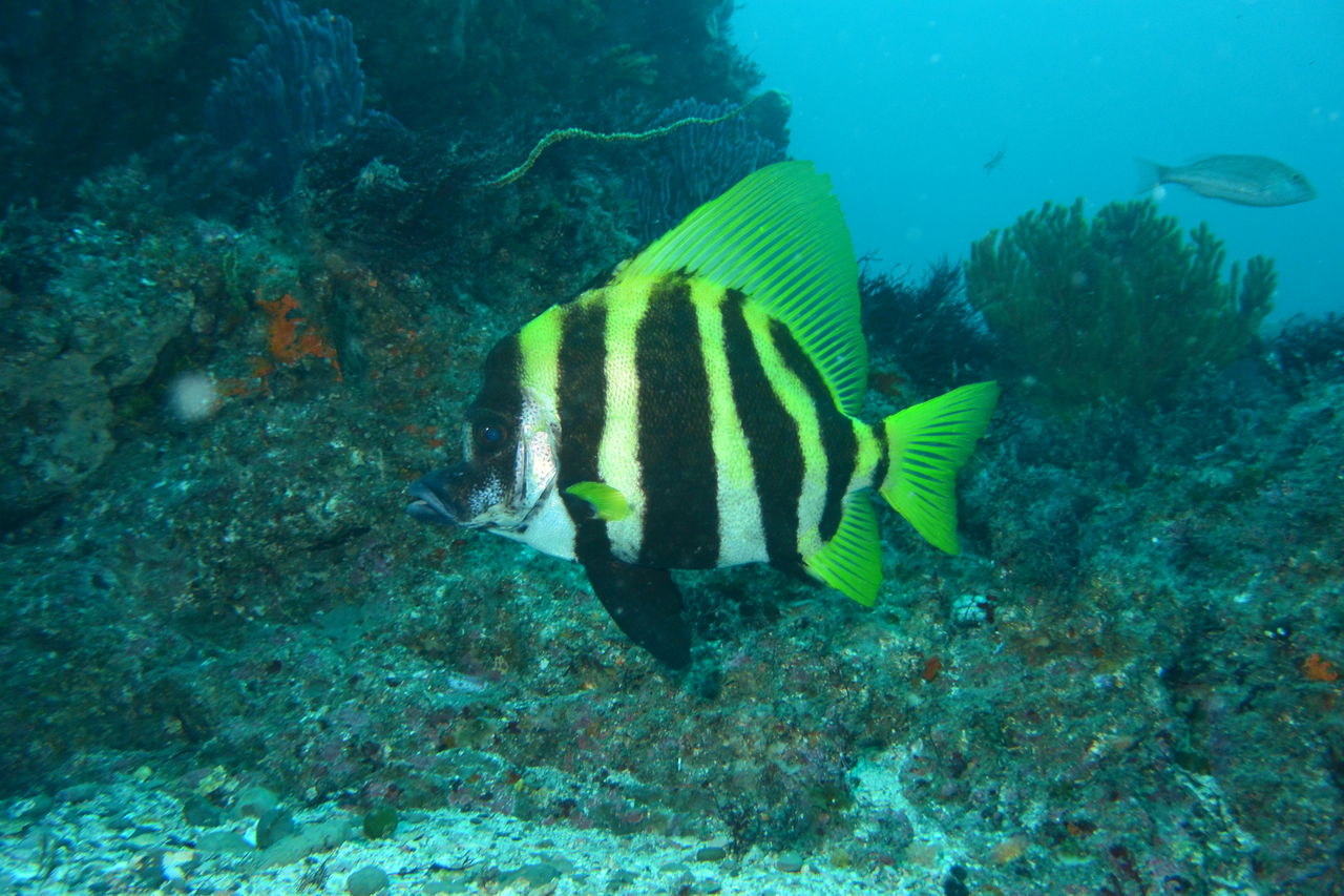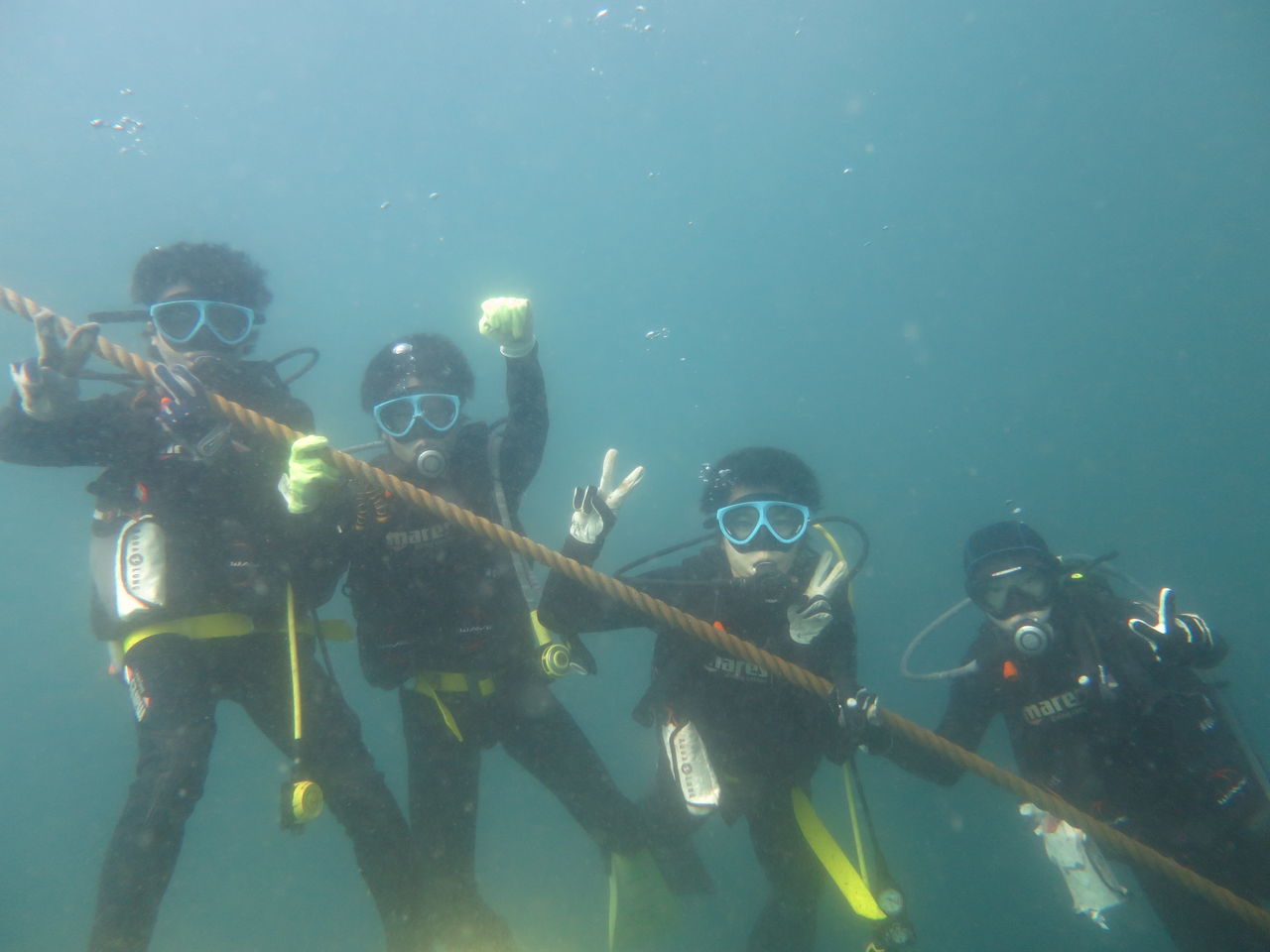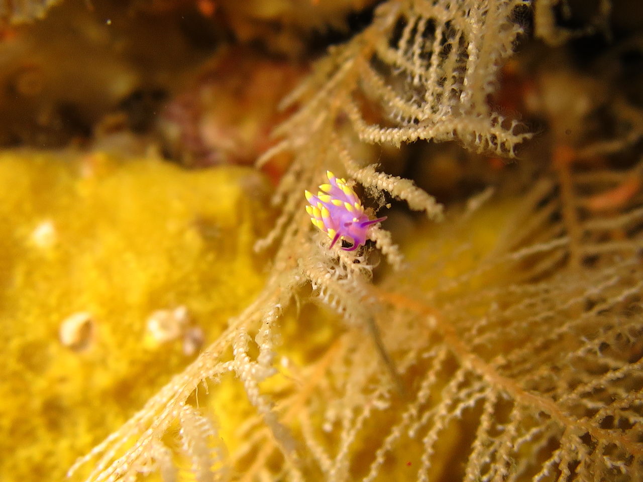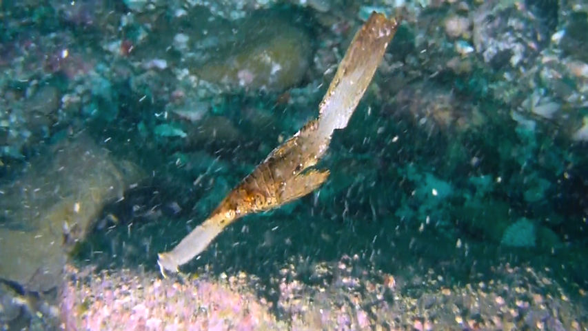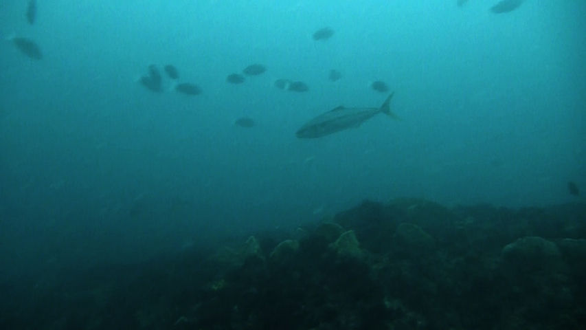 Bポイントからエントリー 時間の経過と共に流れが出てきました。水色は問題ないですが、逆潮が強くなる前に行きましょう。 潜行してすぐにアオリイカの群れに遭遇。少し進むと大きなアオブダイが2匹も泳いでいました。V字谷はイサキだらけ♪ ヒゲダイも7匹ぐらい並んでいます。途中から流れが強くなってきたのでここからドリフト!! 流れに乗ってポイントまで一直線で帰ります。途中可愛いムラサキウミコチョウとトカラベラの幼魚を見て戻りました。