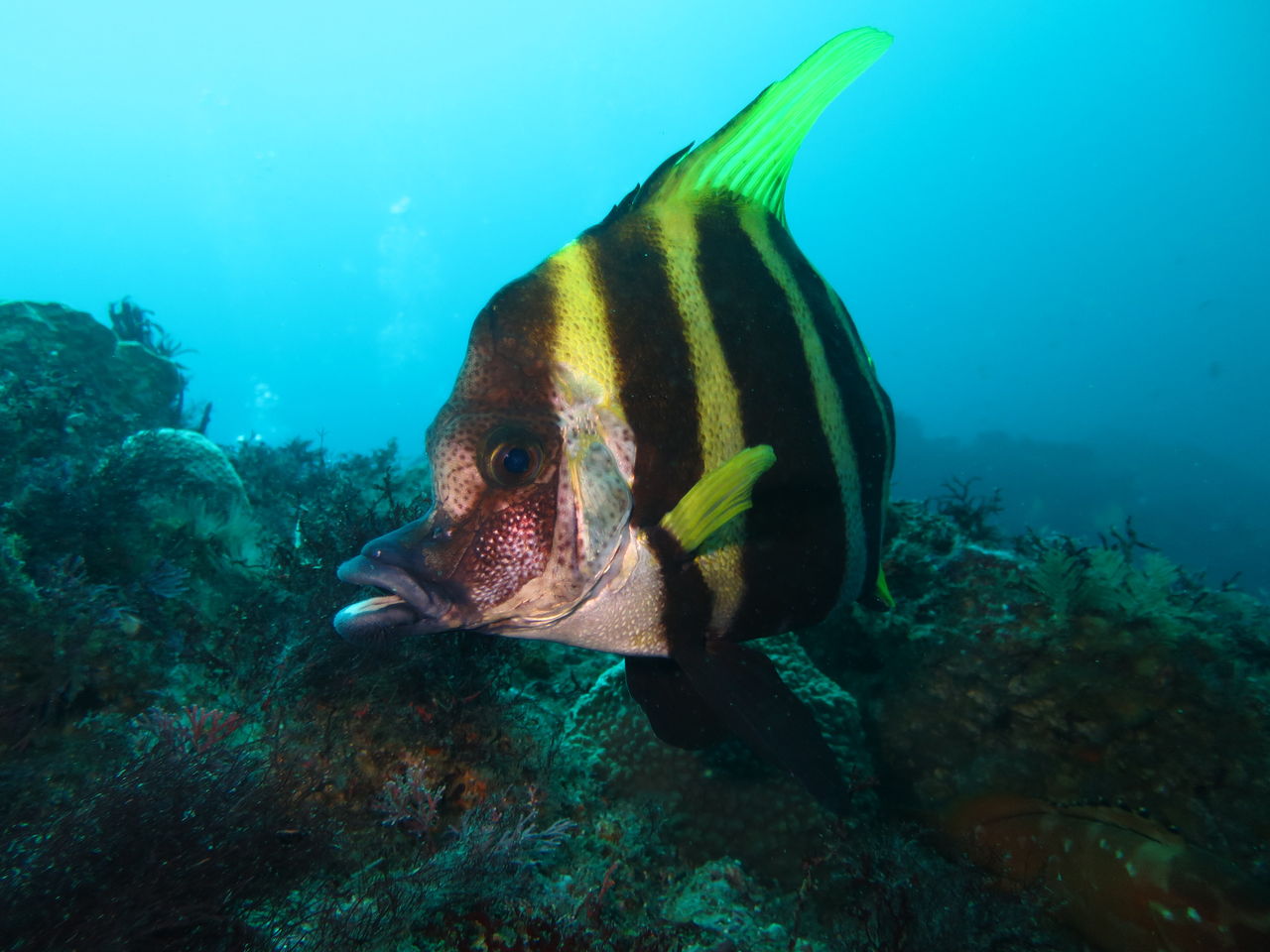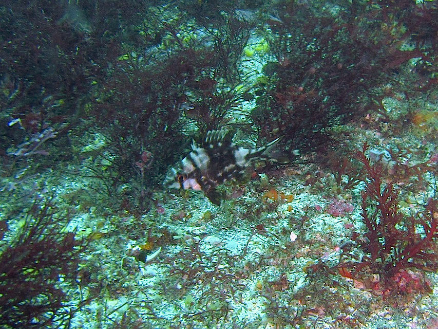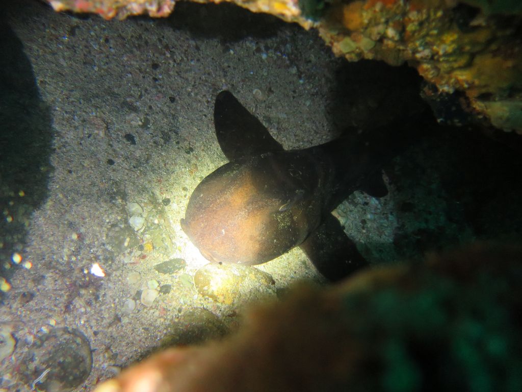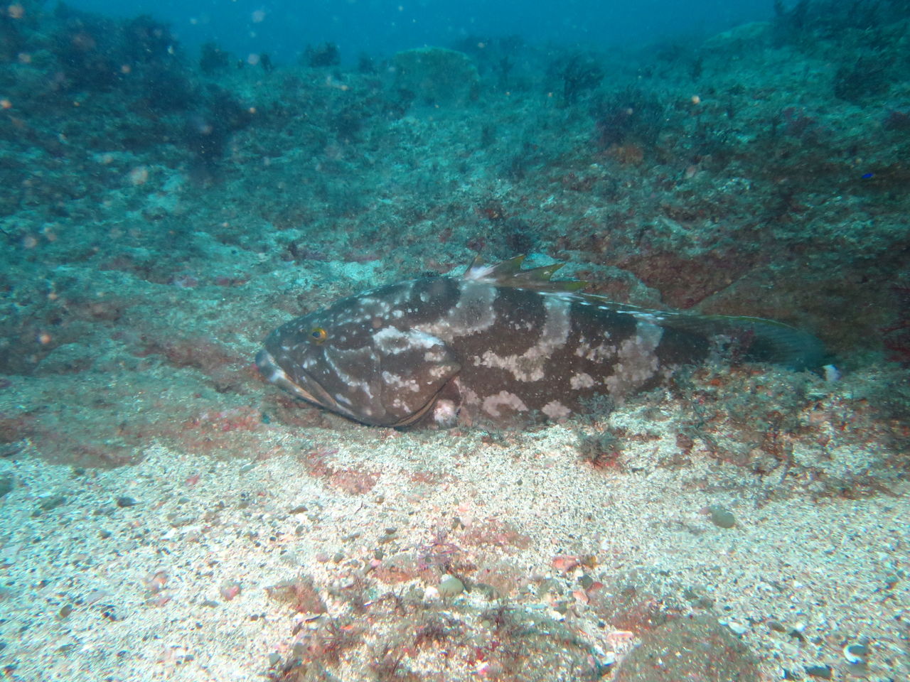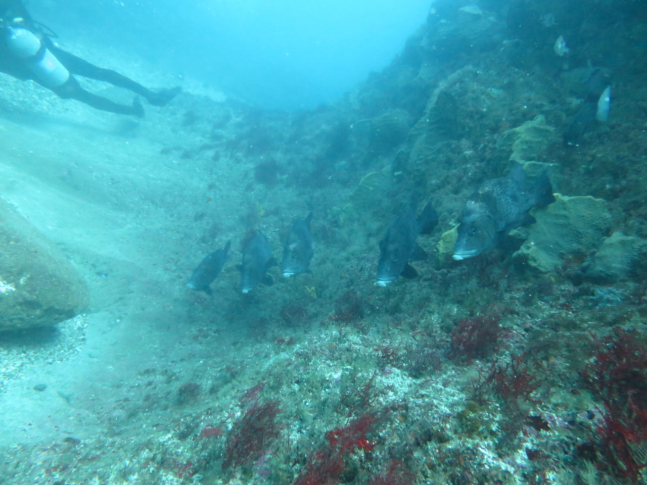 Aポイントからエントリー 水面付近は多少濁り気味でしたが、水底まで行くととってもきれいです。水温は20.9℃流れは北からやや流れています。 サメ穴に向かうとテングダイが6匹も待っていてくれました。サメ穴の北側にはモロコが2匹泳いでいます。穴の中にはネコザメ☆今日は2匹入っていました。その後流れに乗ってモロコ岩前までピューっと流れてきました。Aポイントの下にケサガケベラの幼魚が一匹泳いでいます。