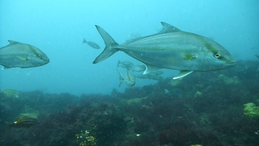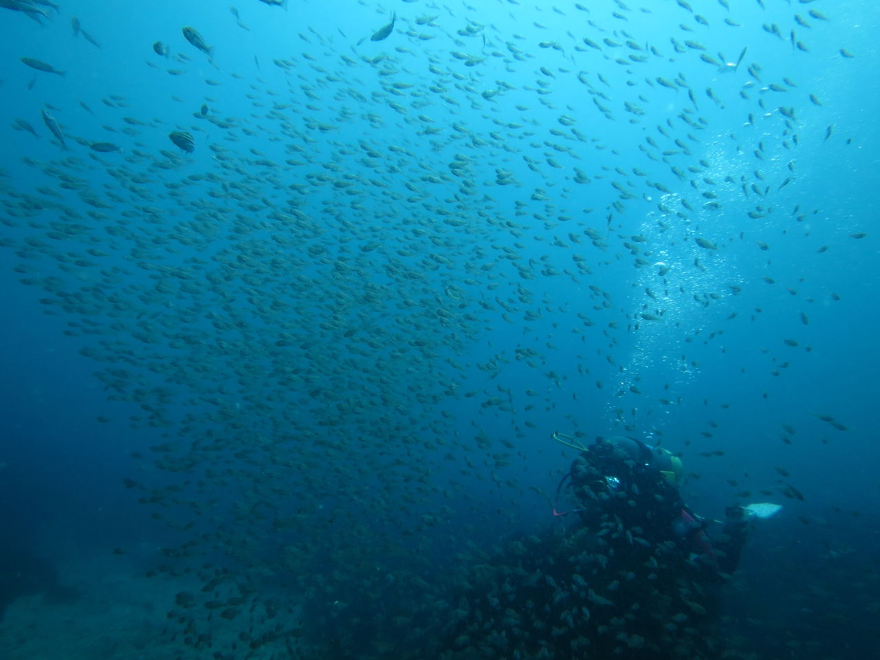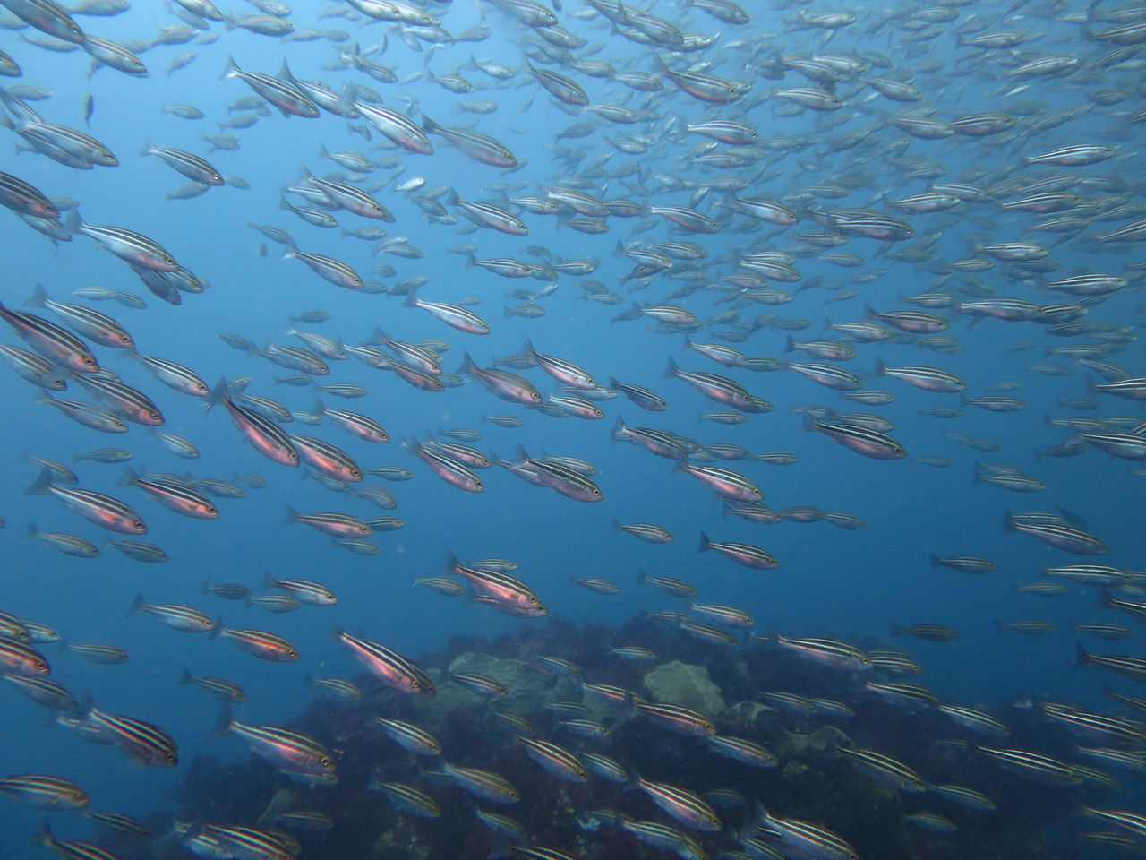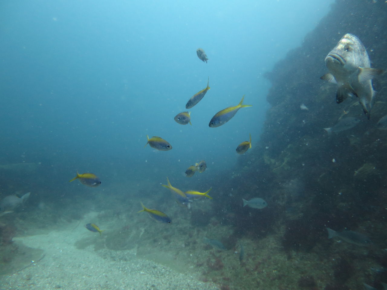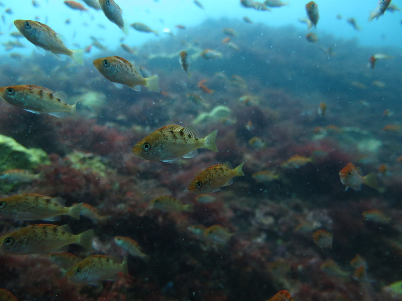 Aポイントからエントリー やや逆潮が入っています。モロコ岩と三角岩にはネンブツダイの群れでビッシリ。西ノ山を越えると一匹のヒラマサが猛スピードで逃げていきました。それを追う様に離れ根の南へ。タカベやイワシの群れがぐっちゃりと泳いでいます! トク根の方でヒラマサが6匹ほど泳いでいるのが見えみましたので。ゆっくり近づいていくと4匹ほど戻ってきてくれました! 流されながら離れ根へ行くとまたもう一匹のヒラマサがおよいできました。