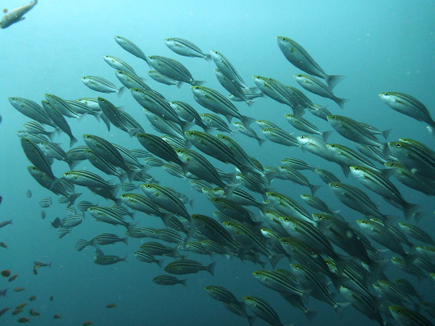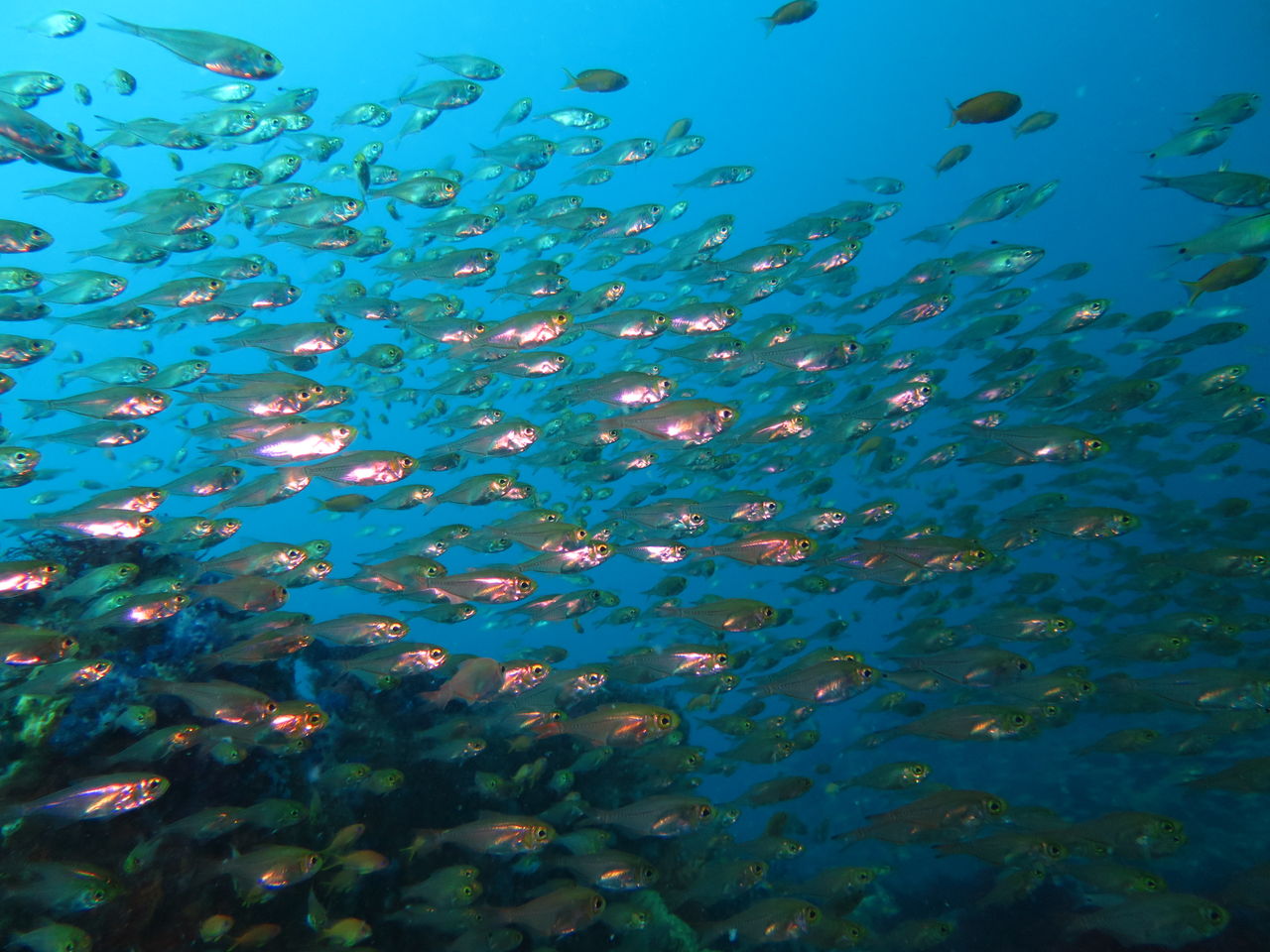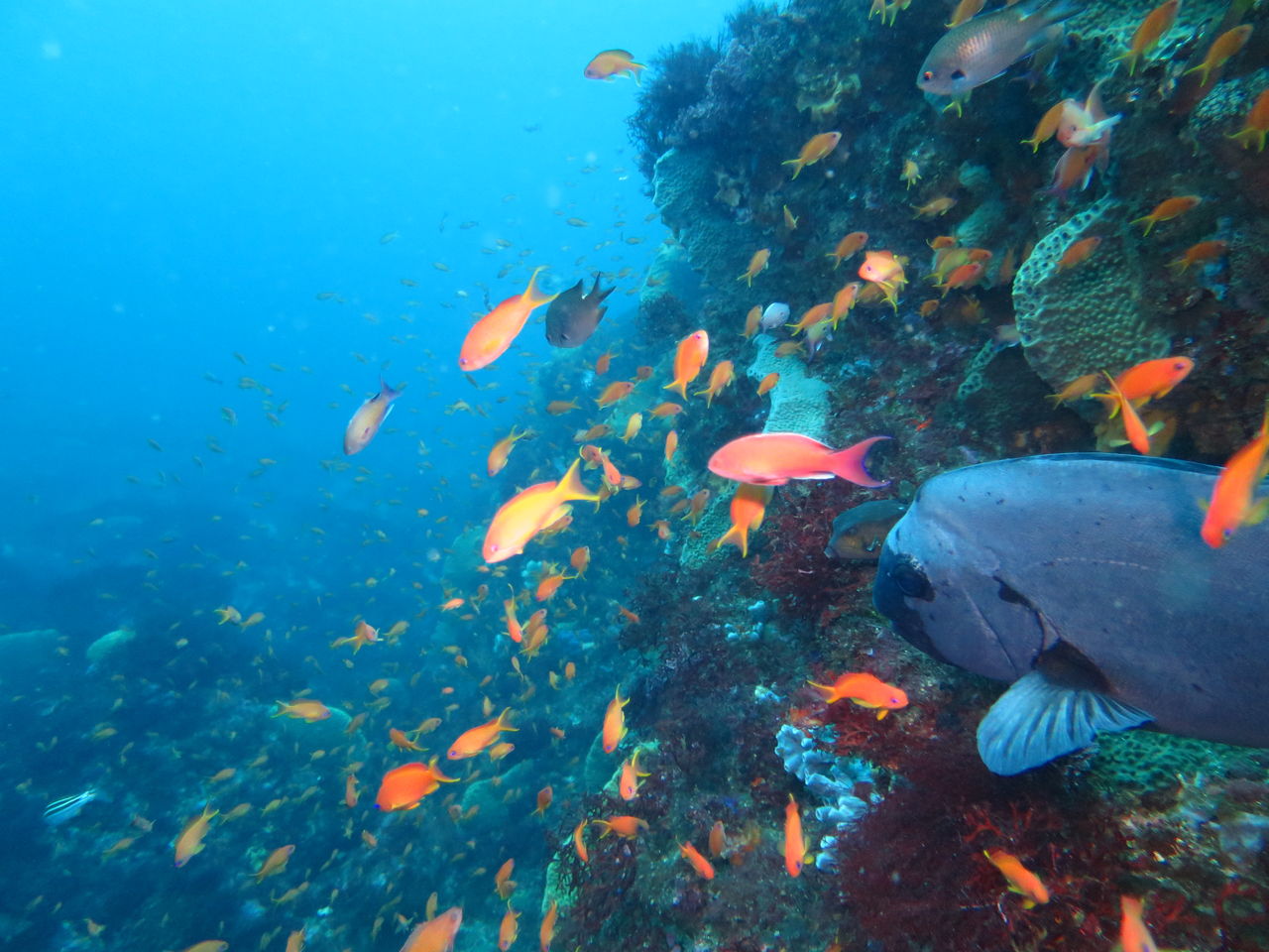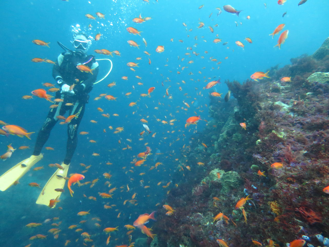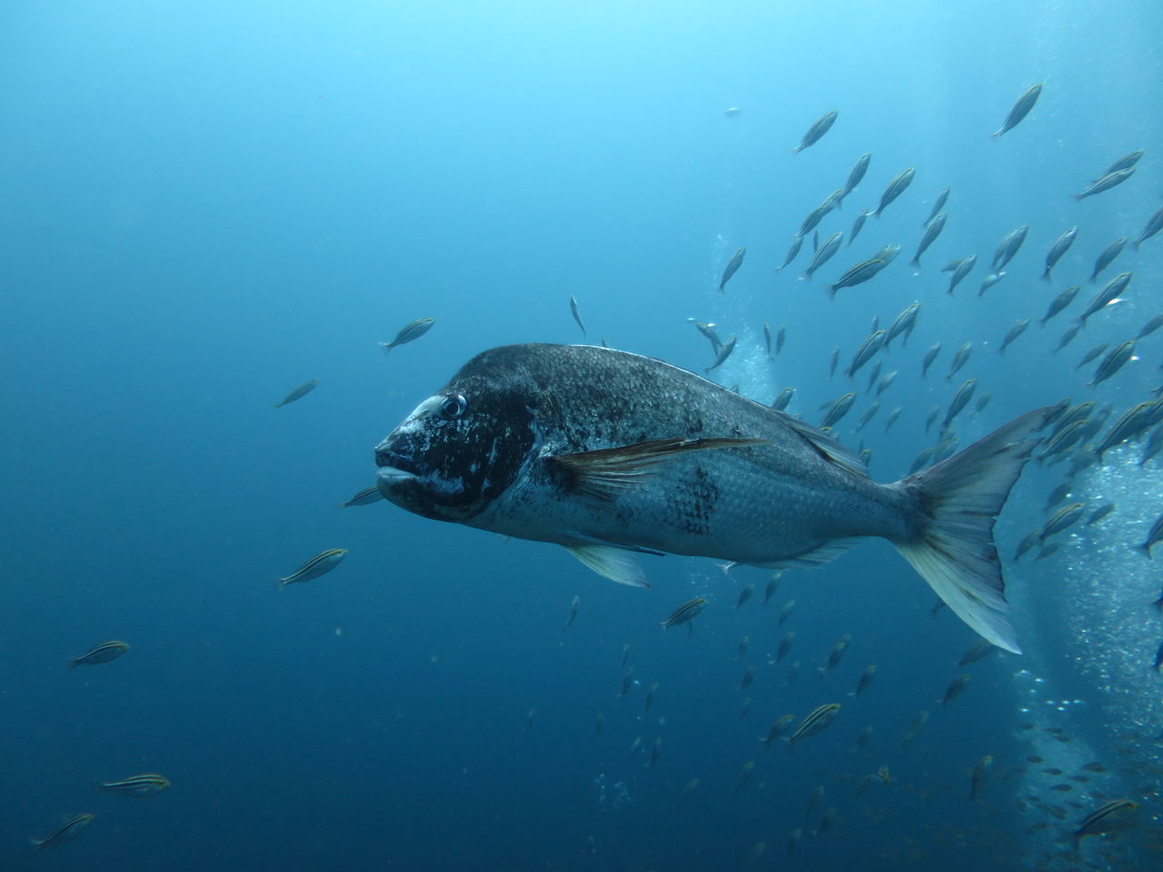 Aポイントからエントリー やや逆潮が入っています。モロコ岩と三角岩にはネンブツダイの群れでビッシリ。西ノ山を越えると一匹のヒラマサが猛スピードで逃げていきました。それを追う様に離れ根の南へ。タカベやイワシの群れがぐっちゃりと泳いでいます! トク根の方でヒラマサが6匹ほど泳いでいるのが見えみましたので。ゆっくり近づいていくと4匹ほど戻ってきてくれました! 流されながら離れ根へ行くとまたもう一匹のヒラマサがおよいできました。