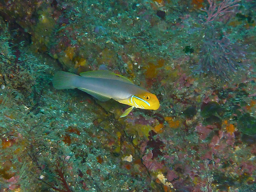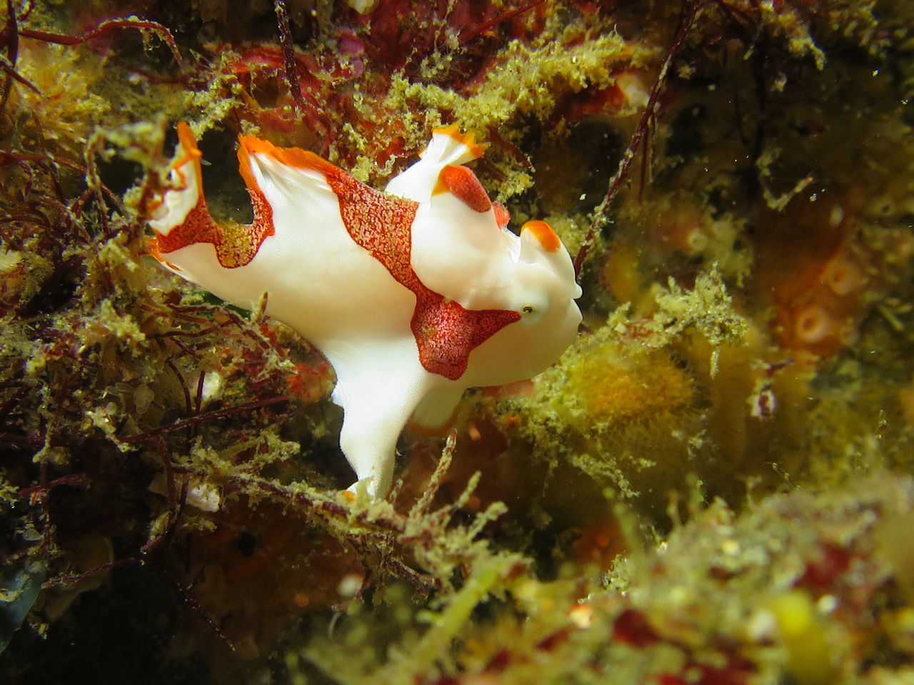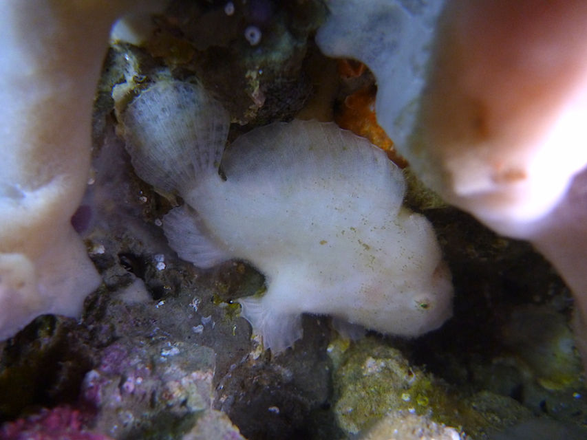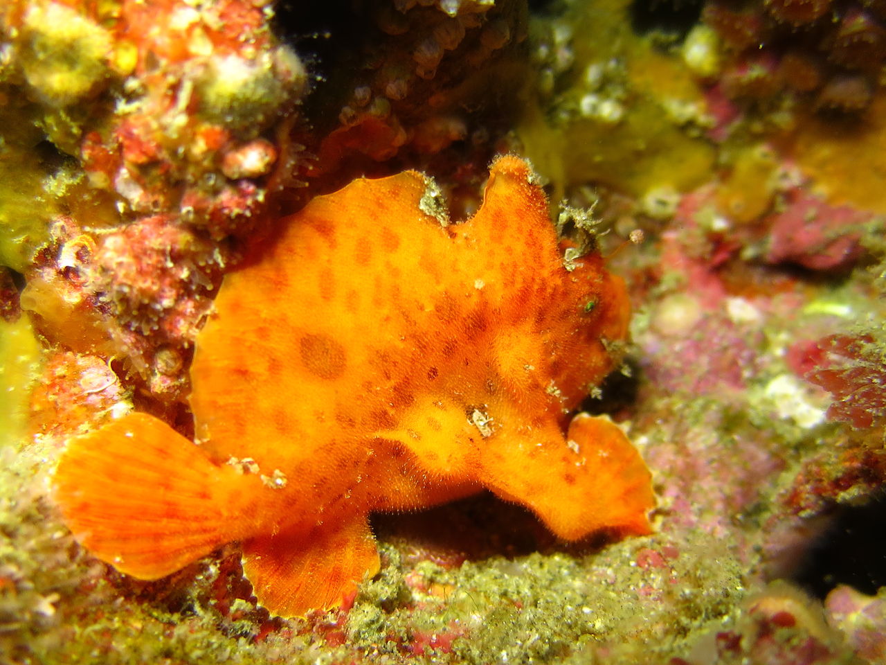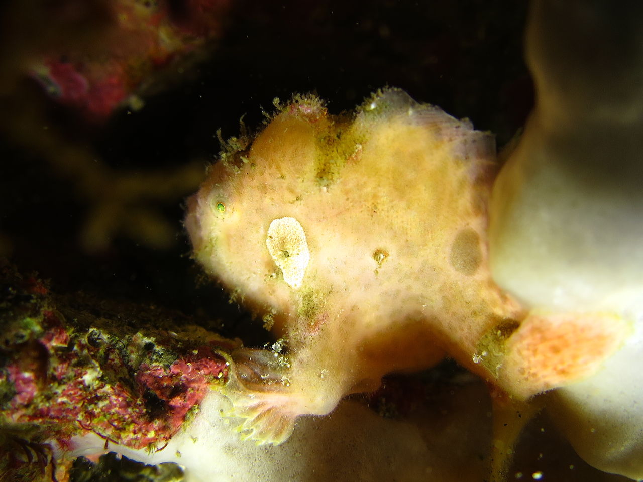 Cポイントからエントリー 逆潮が強くなってきました。真っ直ぐにメバル谷へ! まずは壁沿いのクマドリカエルアンコウを確認☆ 今日も同じ亀裂の中に隠れていました。メバル谷のベニカエルも同じカイメンの中でジッとしています。メバル谷の出口付近には、マンリョウウミウシ。 モロコに挟まれて片身の狭そうなヒゲダイ(笑) トク根の南側ではシロタエイロウミウシ。水面付近にはオキザヨリが30匹くらい泳いでいました。大根まで流されて帰ってくると。大きなヒラマサが3匹泳いできました。