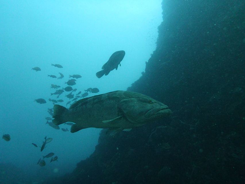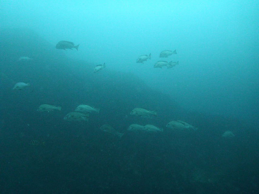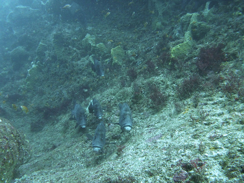 Aポイントからエントリー やや逆潮。潮見表と全然違う(笑) 逆潮なのに下げ潮状態・・・海って不思議☆ まずは西ノ山の上を越えて離れ根へ。イサキ、メジナは潮に逆らって必死に泳いでいます。V字谷にはモロコが4匹もホバリングしていました。ゆっくり行くとかなり近くまで寄れます! ヒゲダイ達もに10匹ぐらい泳いでいました。ハタンポ岩を越えて流されてモロコ岩へ。ハリセンボンが岩の切れ目に隠れていたり。ムナテンベラの幼魚がおよいでいました。