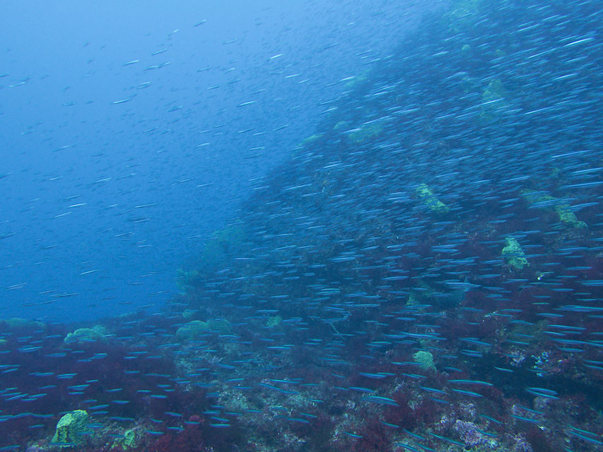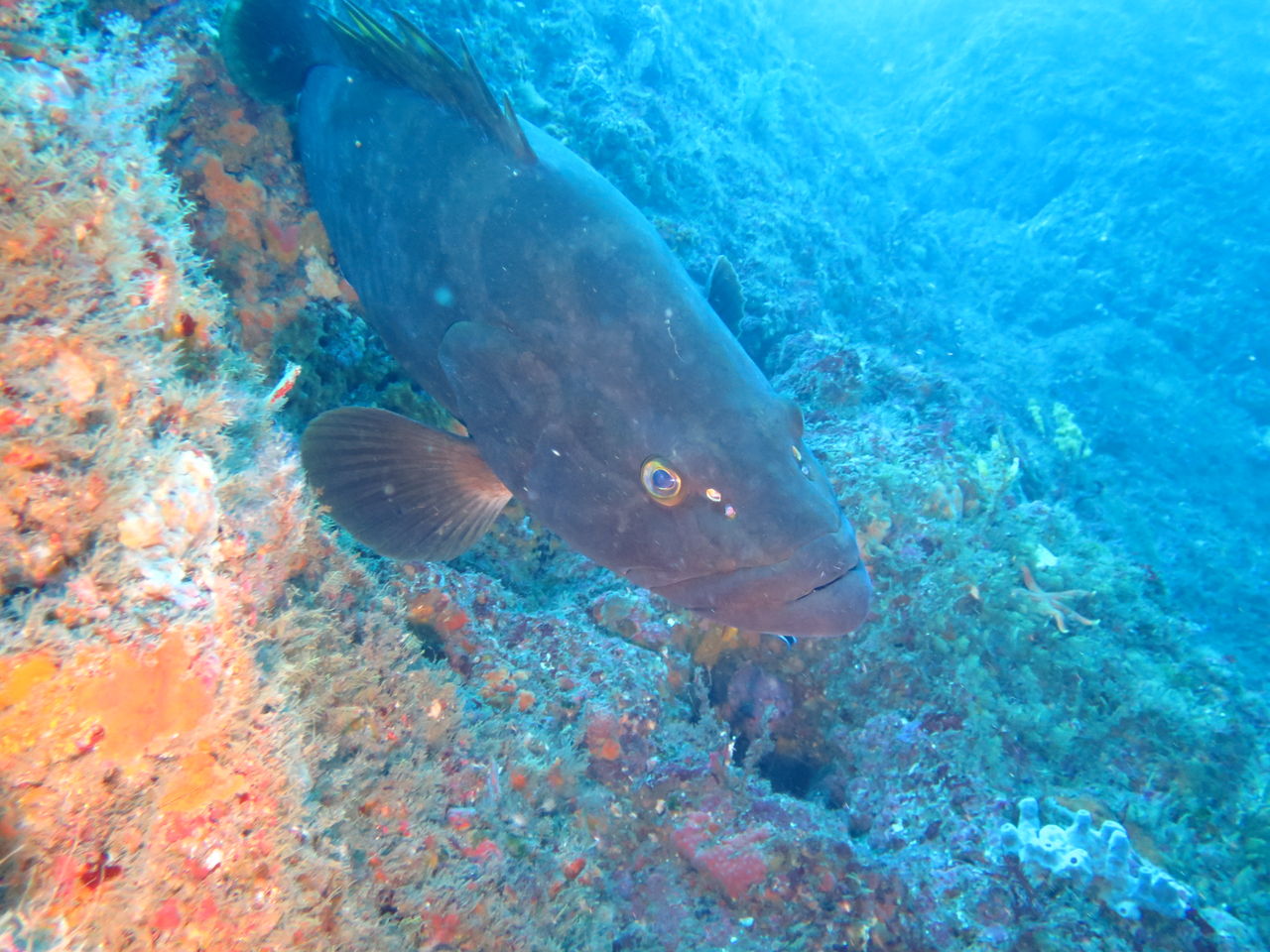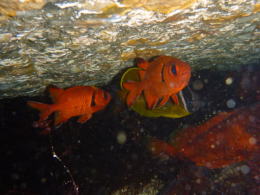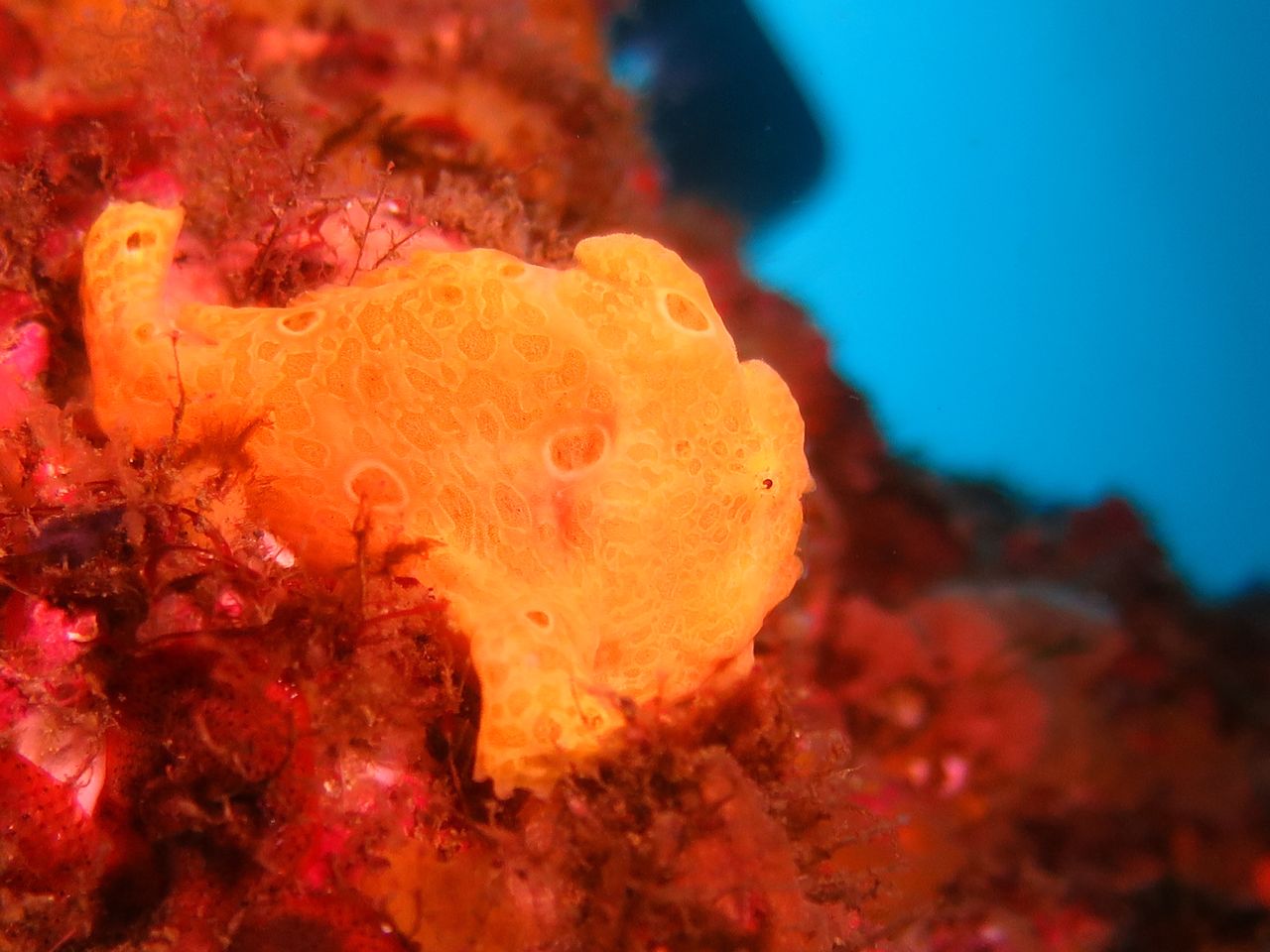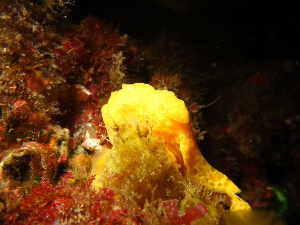 まったりな逆潮になりました。V字谷はガラーンとしていてヒゲダイとイシダイは南側の中層かイソバナ壁側に群れています。東側の壁のオレンジ色のイロカエルアンコウを確認。