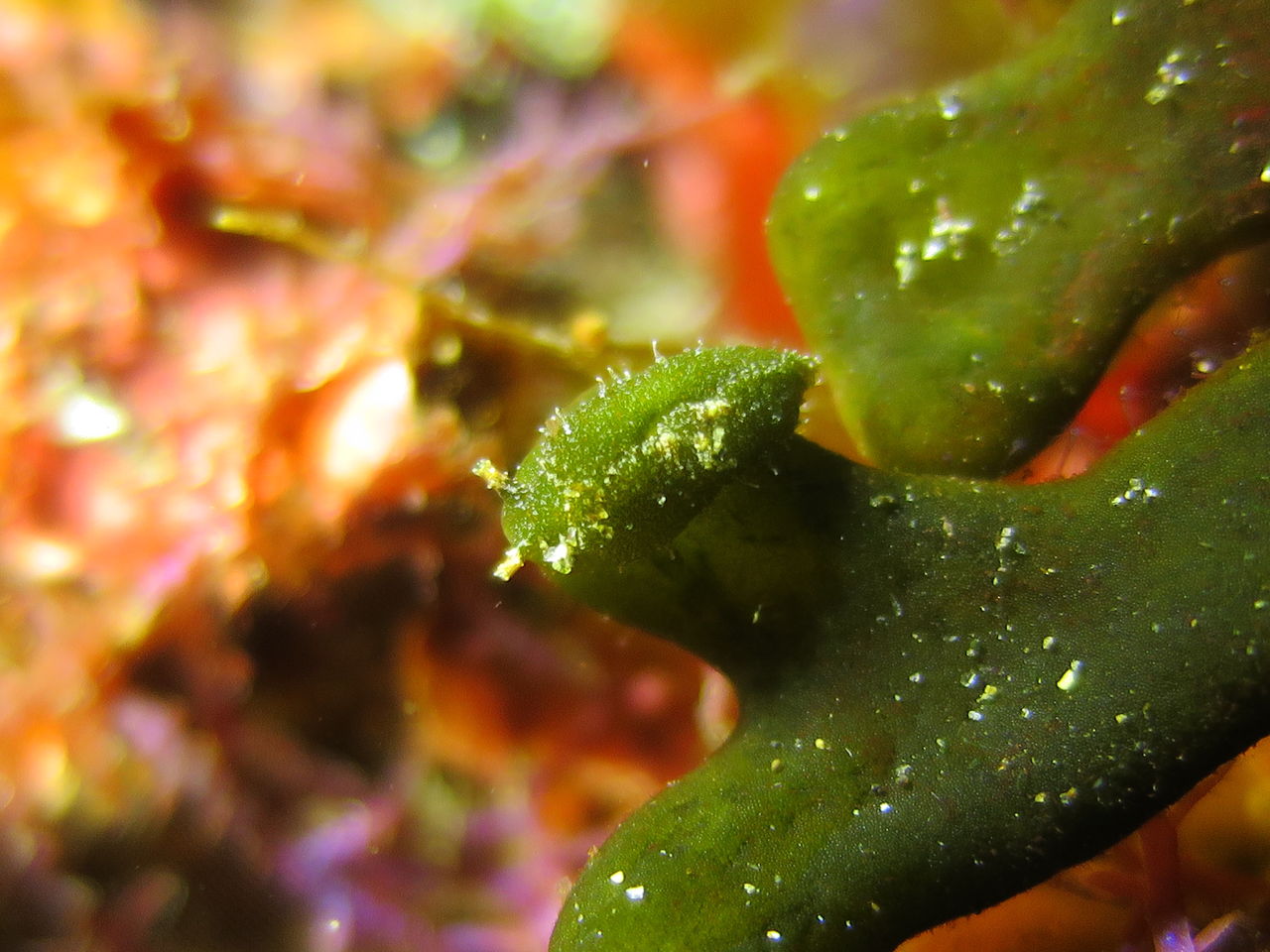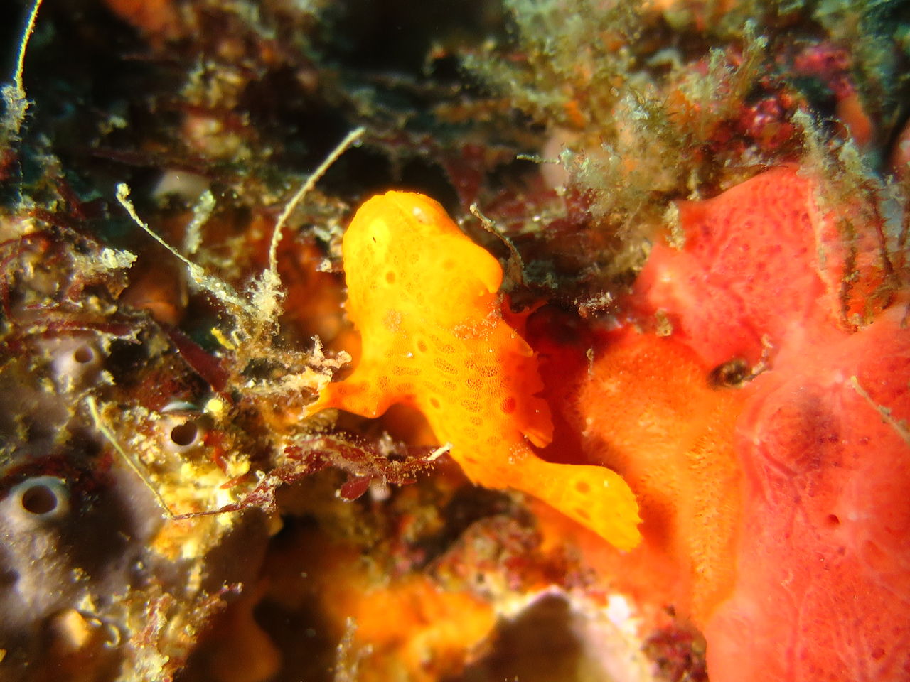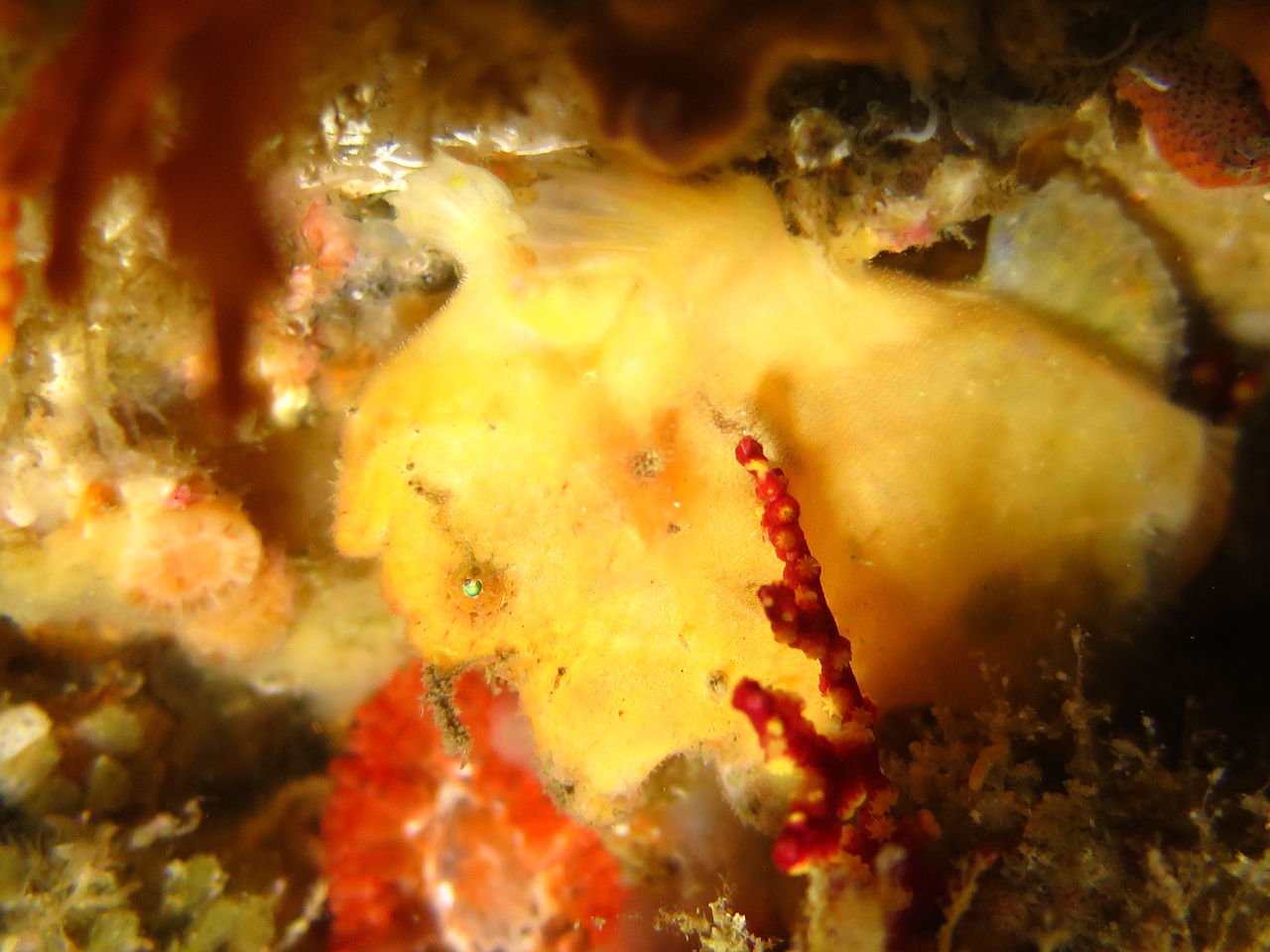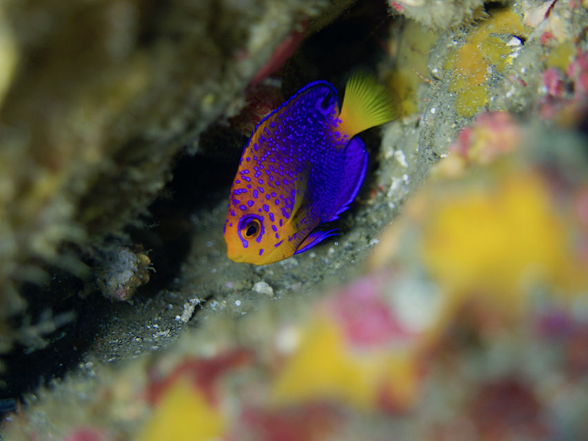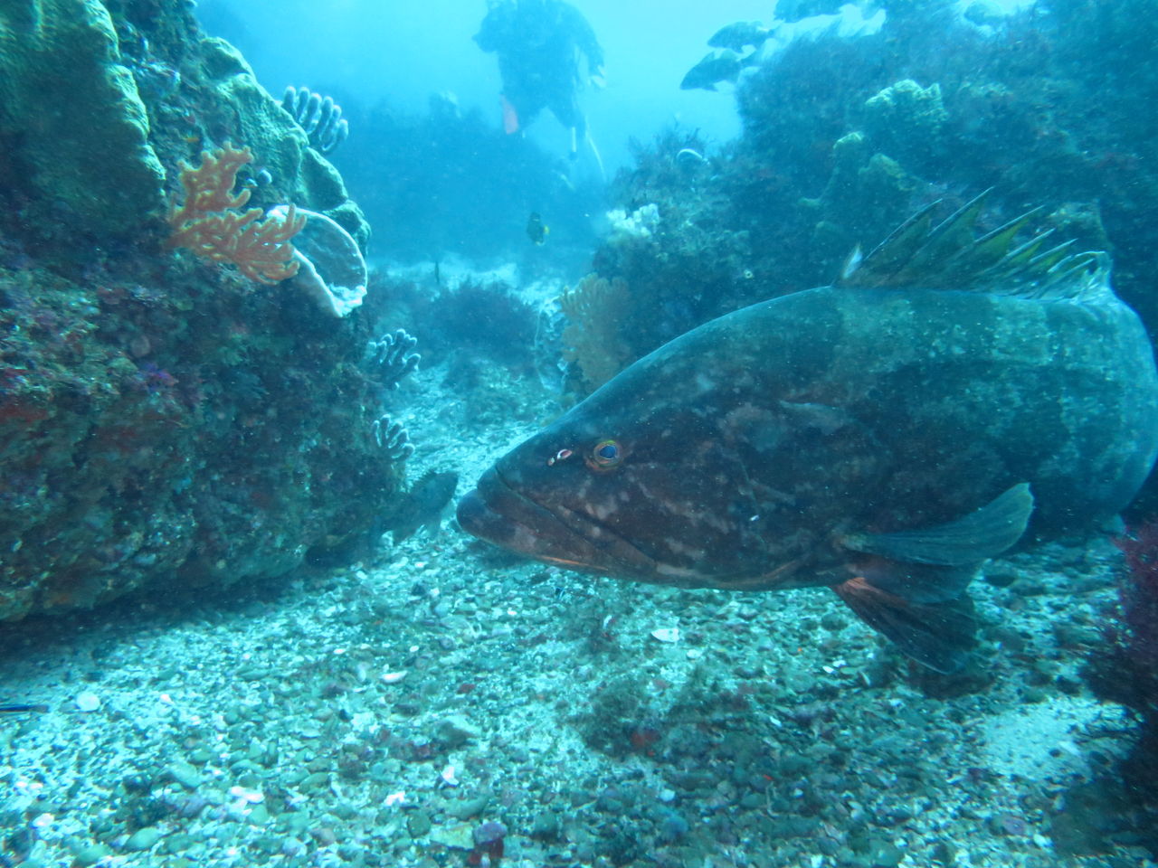 まったりな逆潮になりました。V字谷はガラーンとしていてヒゲダイとイシダイは南側の中層かイソバナ壁側に群れています。東側の壁のオレンジ色のイロカエルアンコウを確認。