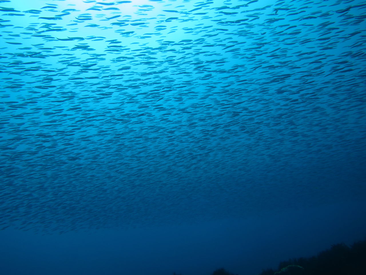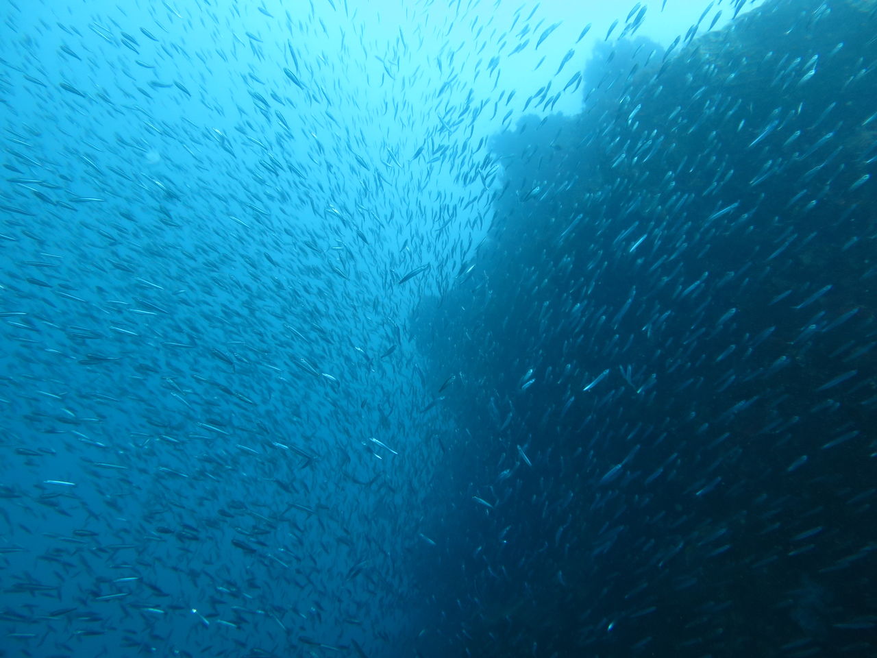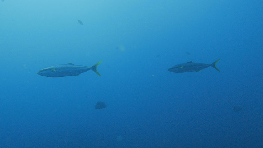 離れ根を回り込むと今日もイワシがたくさん群れています。その群れをヒラマサが2匹と何匹かのマダイが追っています。