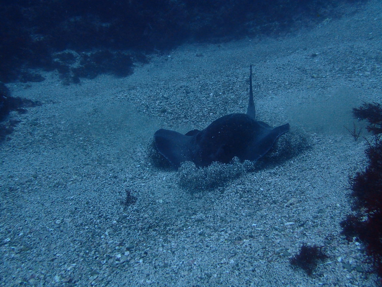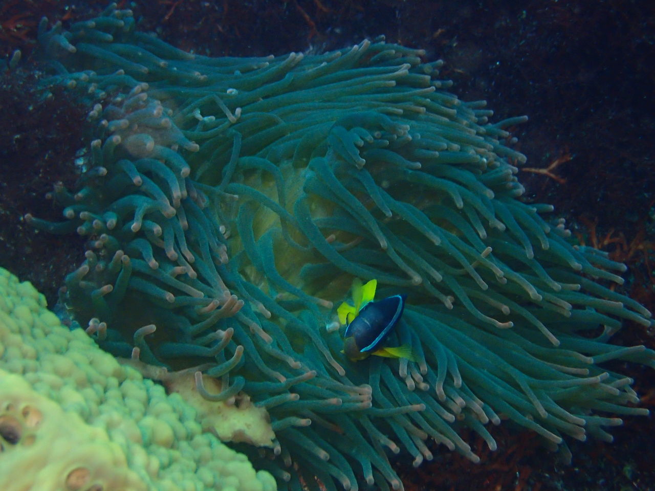 ・Bポイントからエントリー まだまだ真潮が強め! 砂地を北へ進んでいきます。途中でかなり大きなトビエイが一匹飛んでいましたが、潮がキツイようであまり上手く飛べていないような感じでした。 さらに北へ進むと、イソギンチャクの中に極小のクマノミが隠れていました。