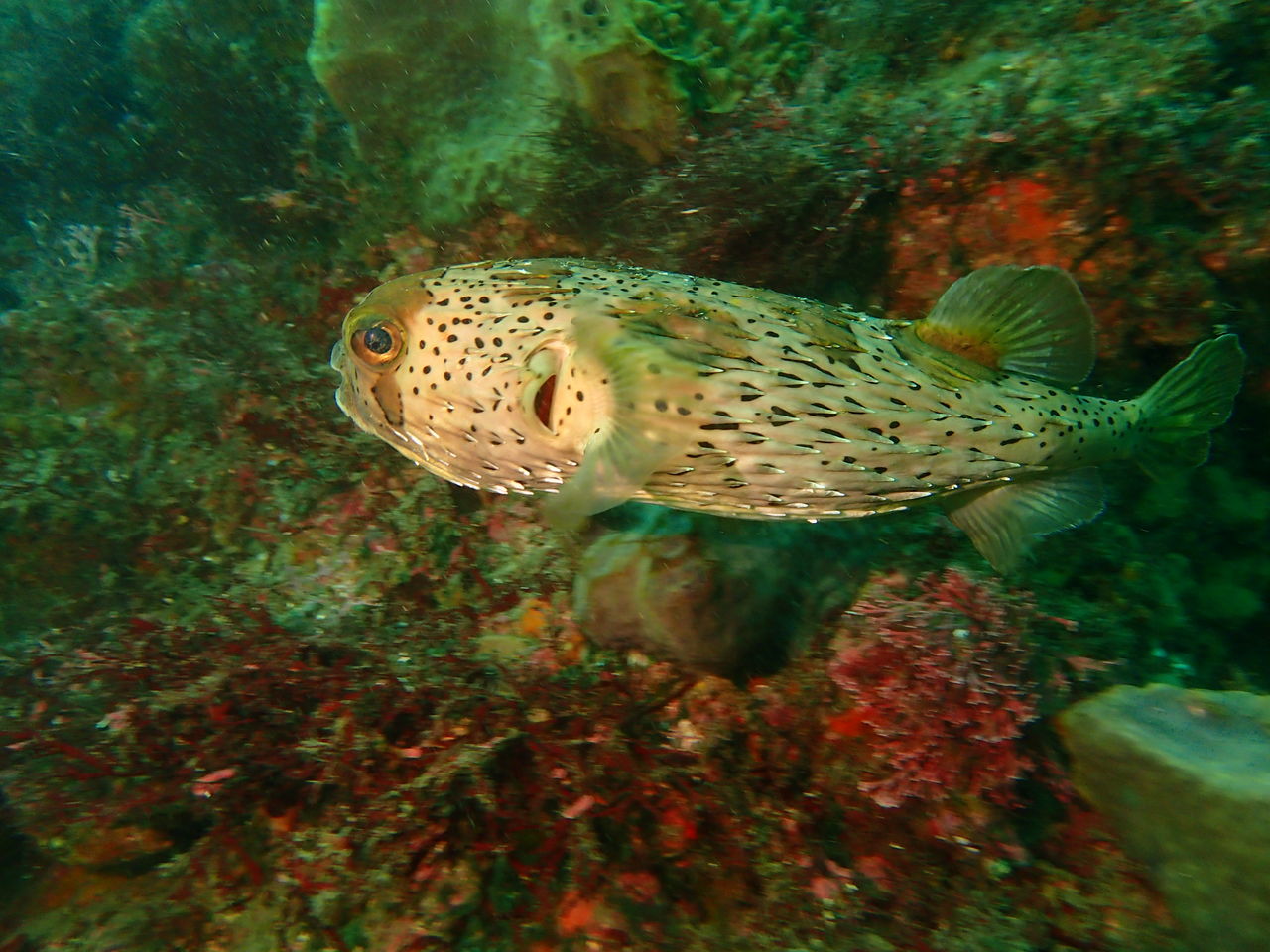 岩の下に頭を突っ込んで探しますが、どうにもゴンズイやツマグロハタンポが邪魔で奥のネコザメすらよく見えません。他にはオニハタタテダイ、アカハタ、アカマツカサ、イタチウオなど混み合っています。