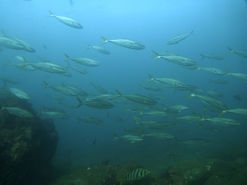 まずはハタンポ岩。岩の上にはイサキの群れ。