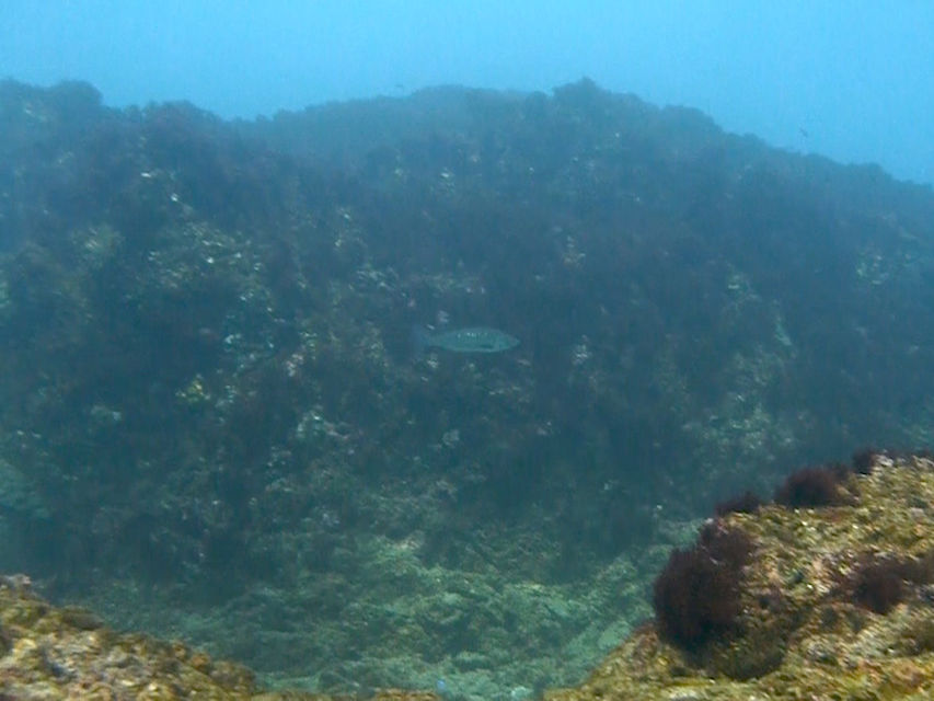 スズキを捜しに浅場をまわります。新魚礁の北側で遠くに100匹以上のスズキを見つけました。まるでバラクーダの群れのようにマッタリしているのですが、こちらに気づくと一瞬で視界の奥に消えます。写真は難しいですね。