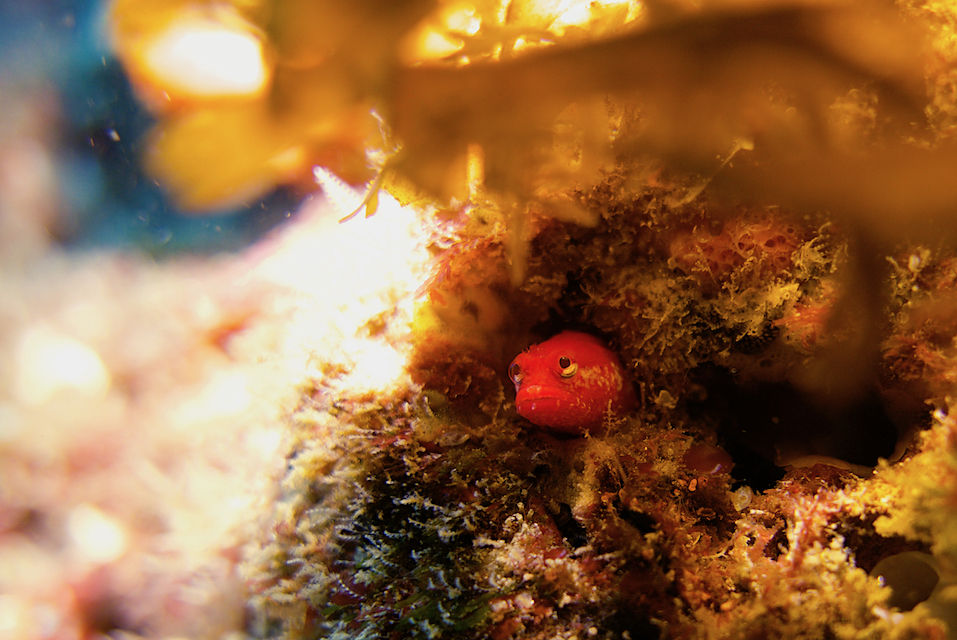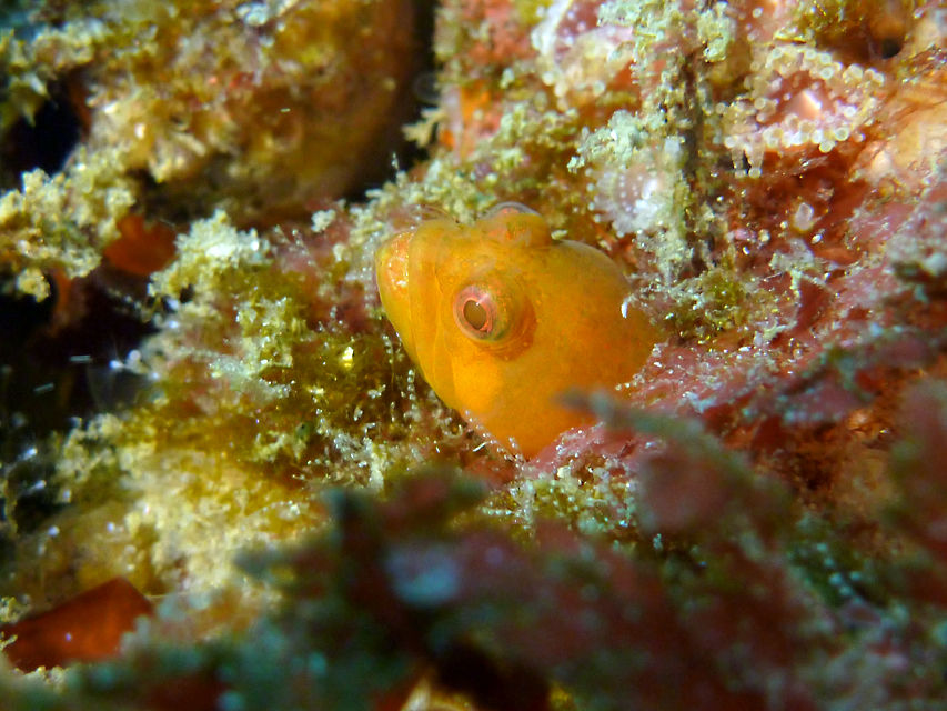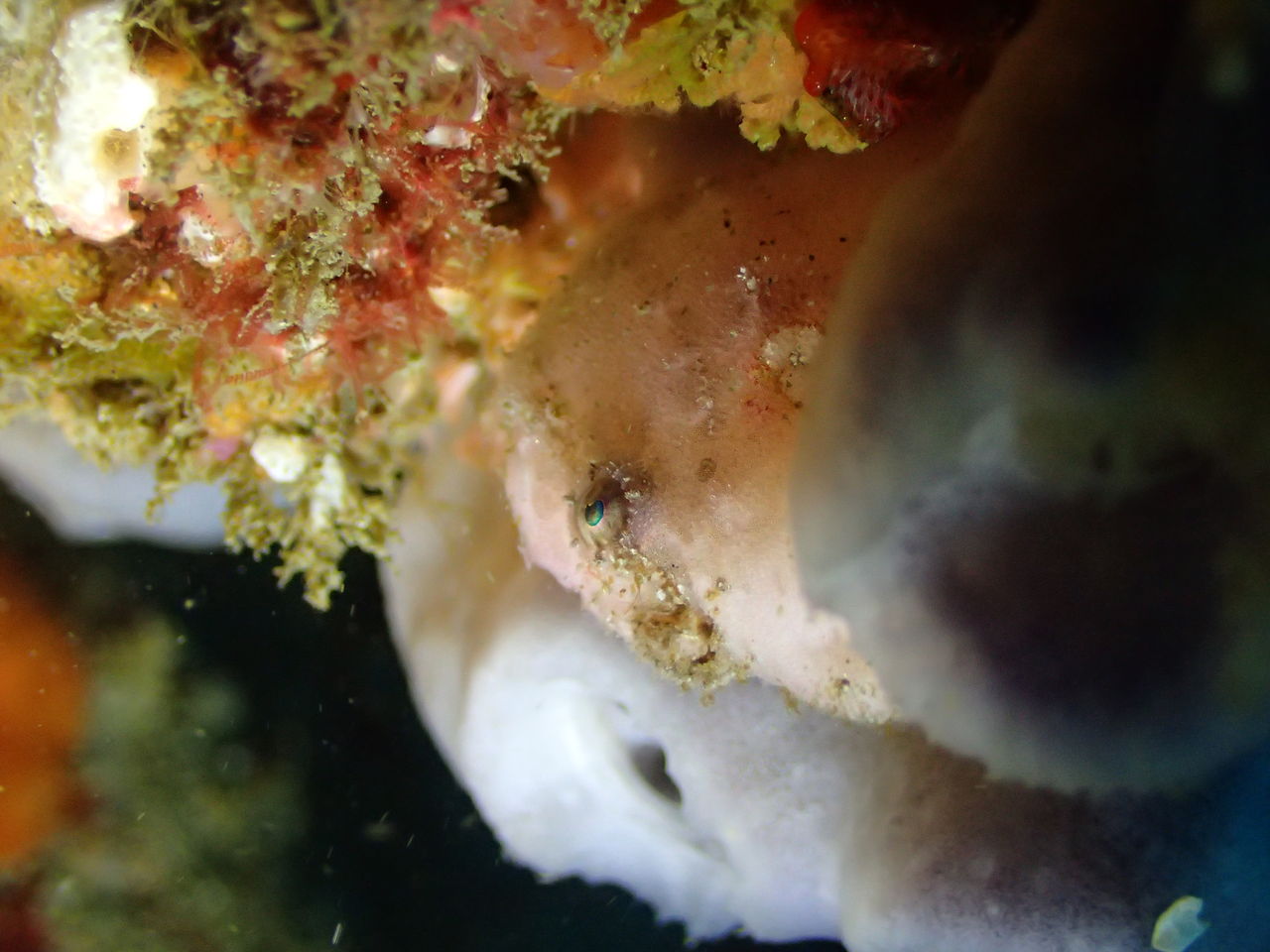 離れ根の東側の亀裂にはイシガキフグが2匹いました。 もう一度V字谷に戻ってチシオコケギンポ探し。 一箇所に固まって4匹仲良く顔を出していましたよ☆ 赤と黄色がいます。