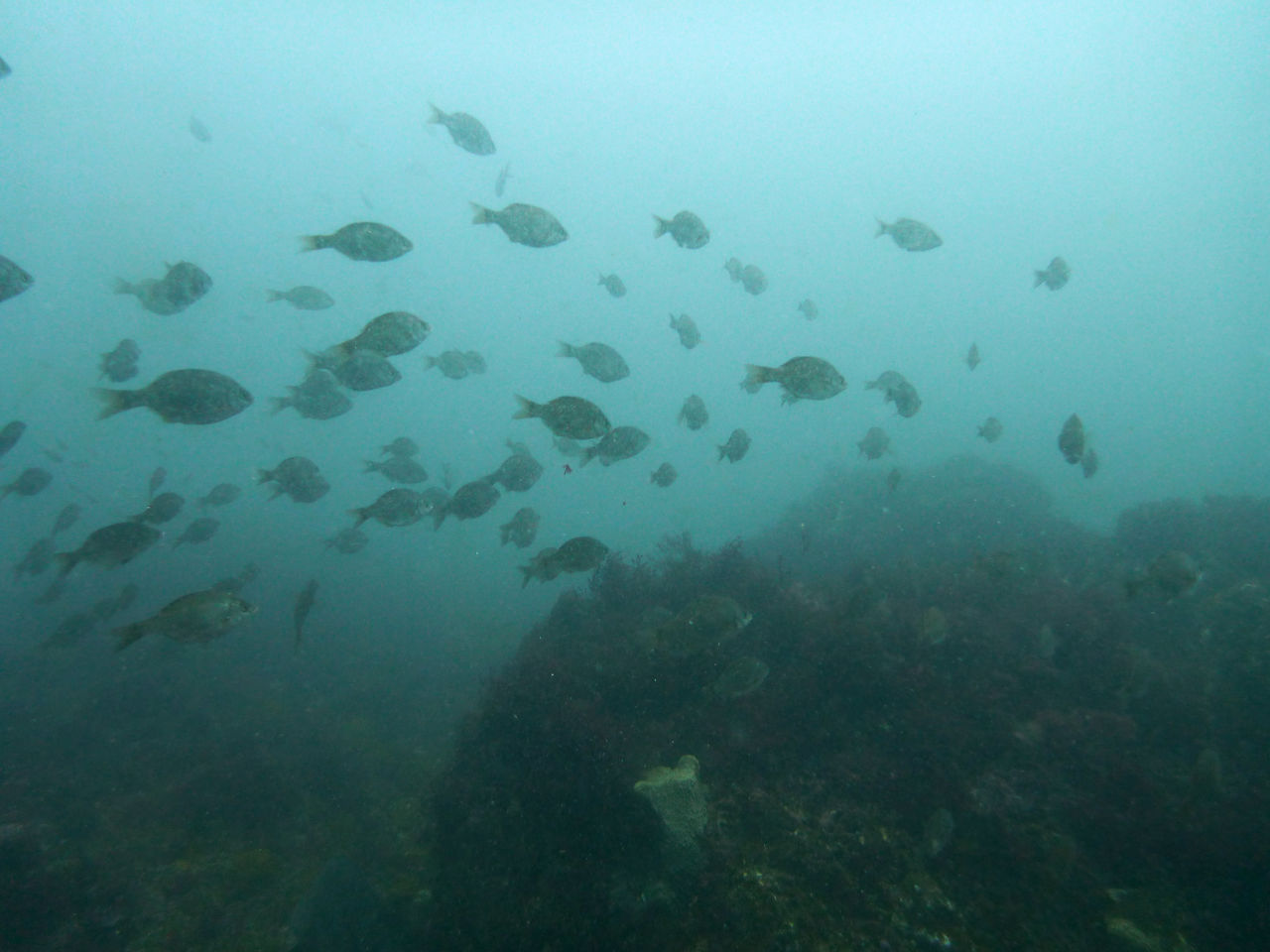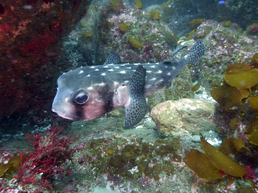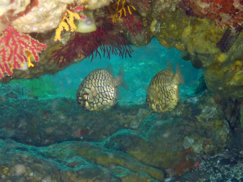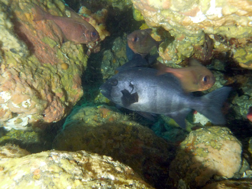 トク根の上にはマダイやメジナがいっぱい。 離れ根の東側の亀裂にはイシガキフグが2匹一緒に居ました。