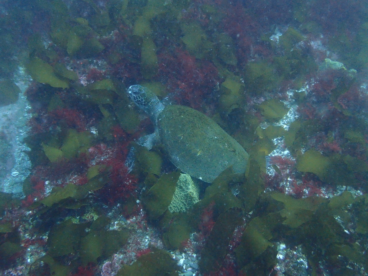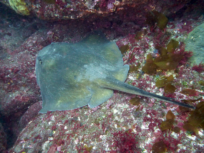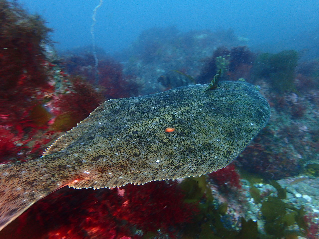 テング岩の沖には大きなアカエイが泳いでいました。 ゆっくりモロコ岩まで戻ってくると、水底にカメが居ました♪ じーっとして動かないので暫く観察させてもらいました。