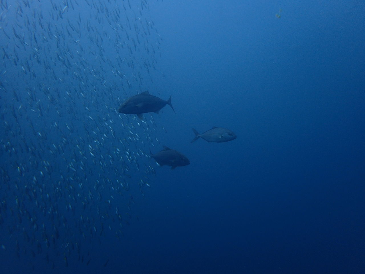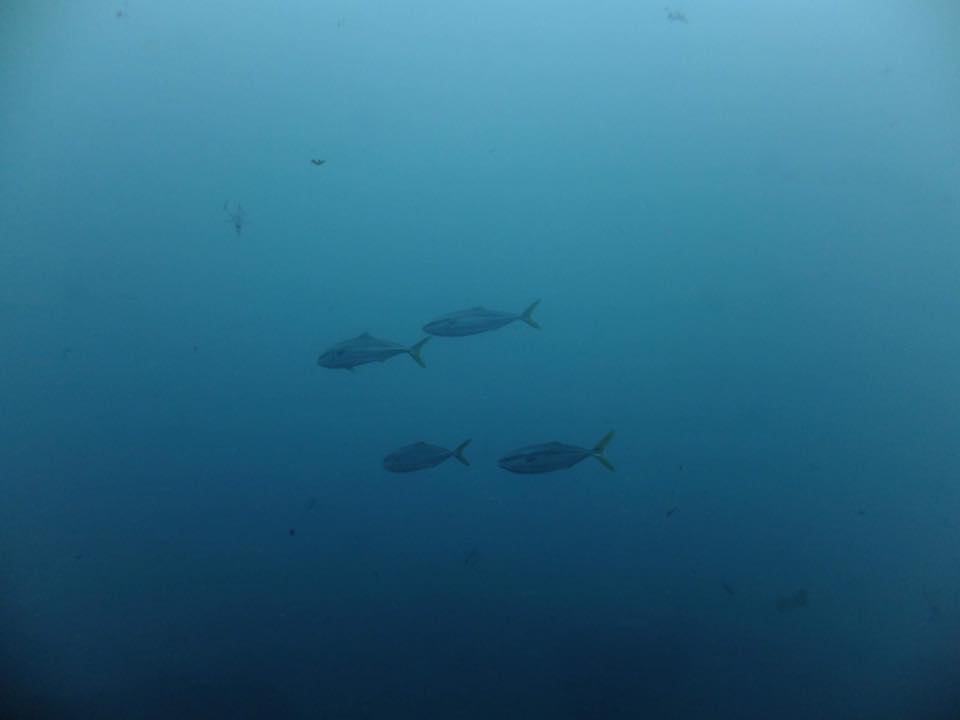 タカベの群れを追っていくと。 そこにヒレナガカンパチが3匹登場☆ タカベを追い回していました!