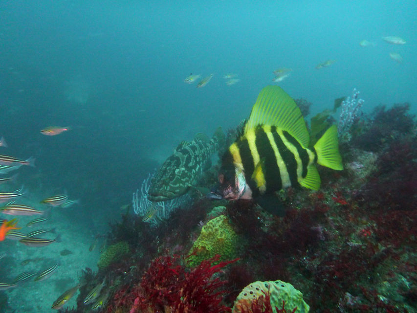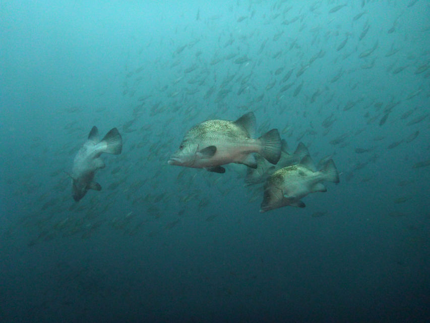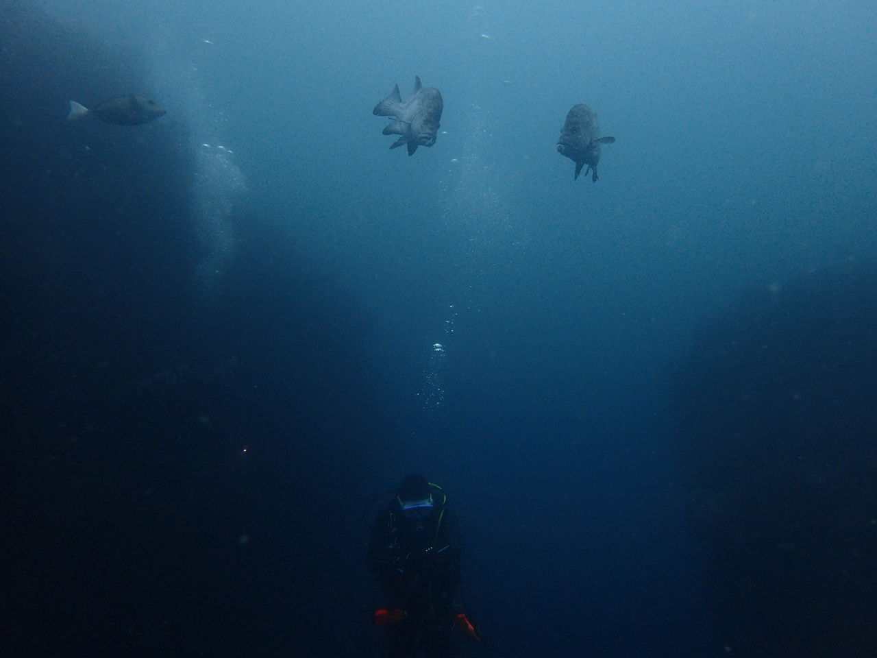 先ずはV字谷へ。根の上にはタカベの群れがすごいです! 流れがながったため、マダイやヒゲダイはみんな中層へ移動していました。