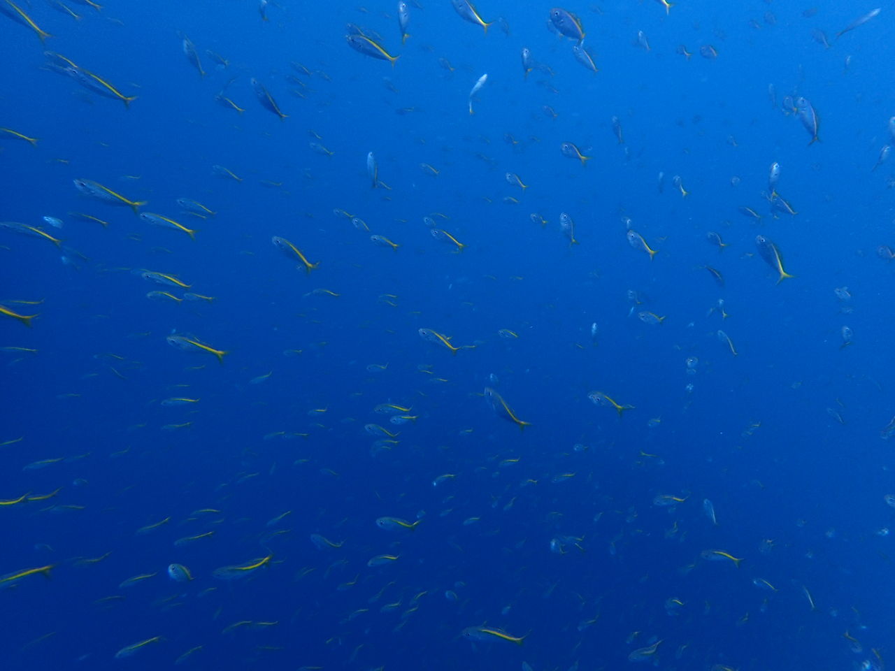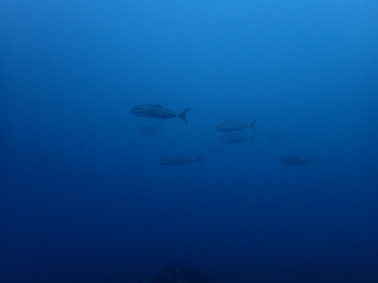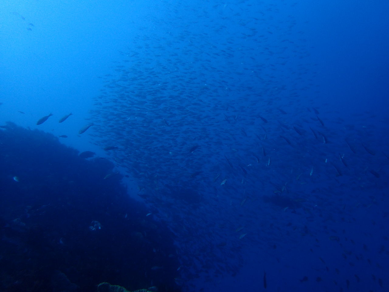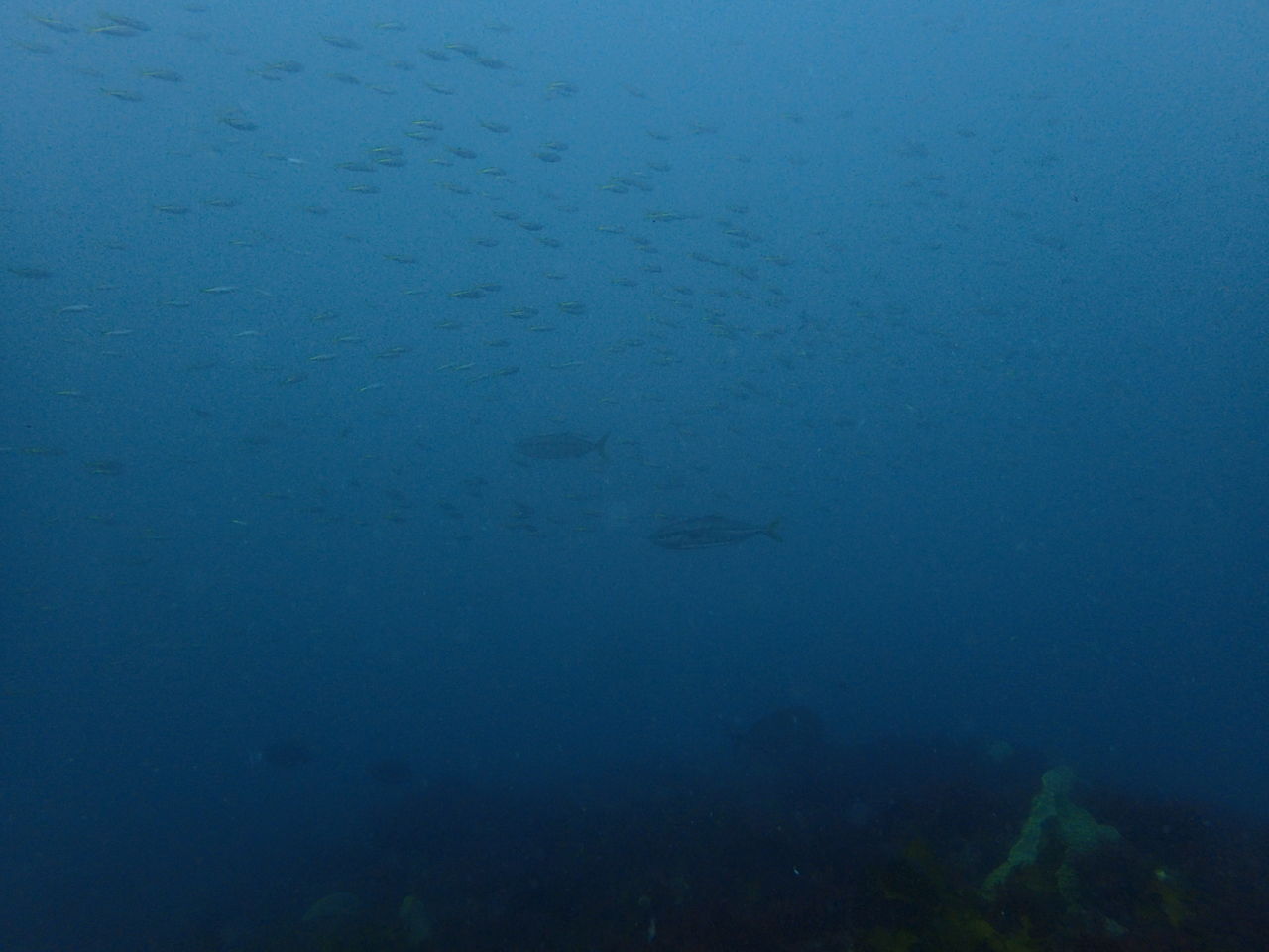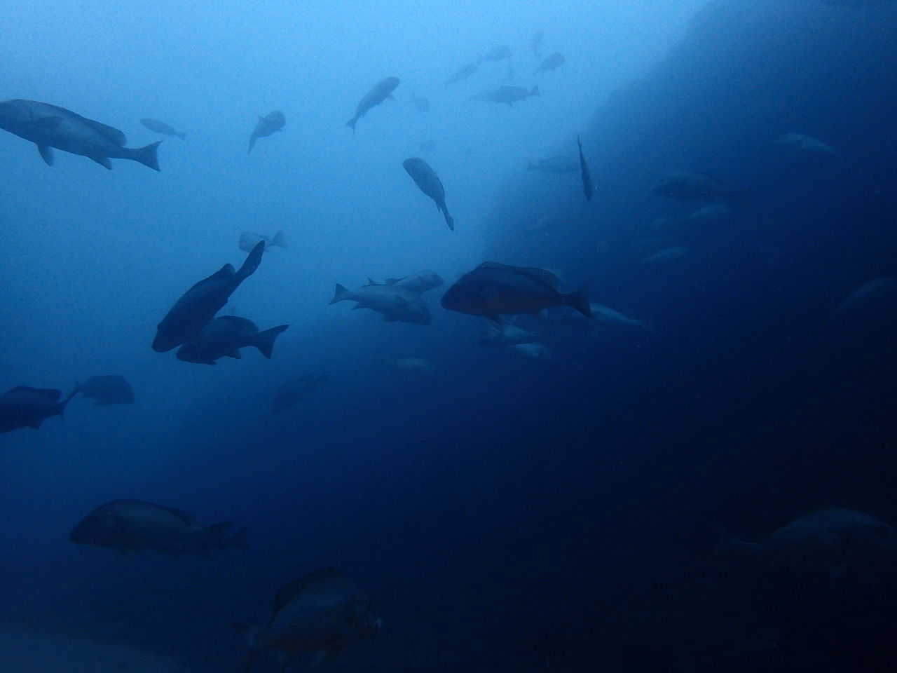 途中で大きなマダイやコロダイとすれ違いトビエイの根へ到着! 根の北側が黒くなっているので良く見てみたら、全部タカベの群れ!! 徐々に視界も良くなってきて10mぐらいはみえてきました。