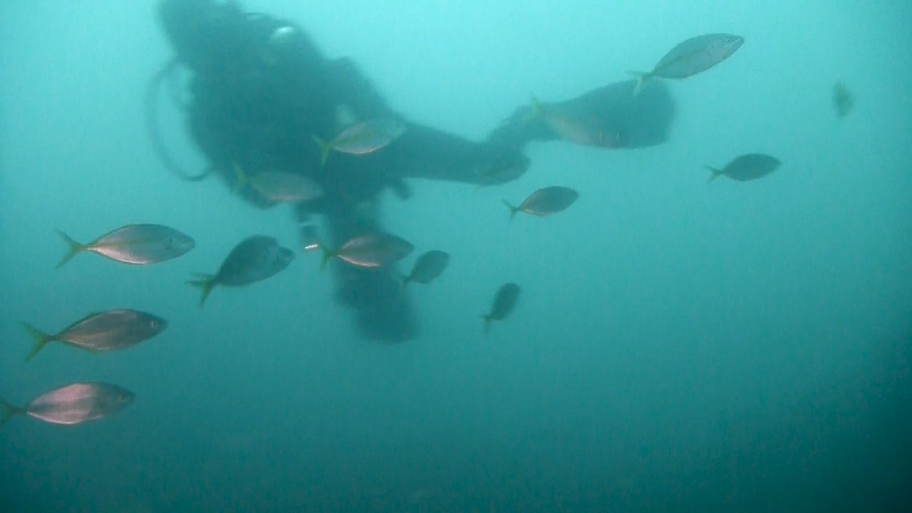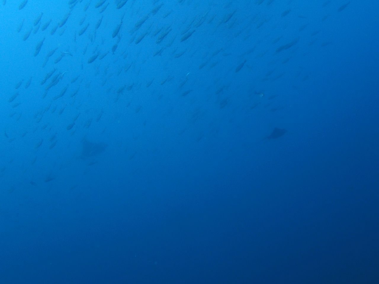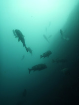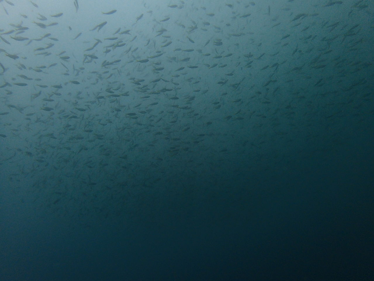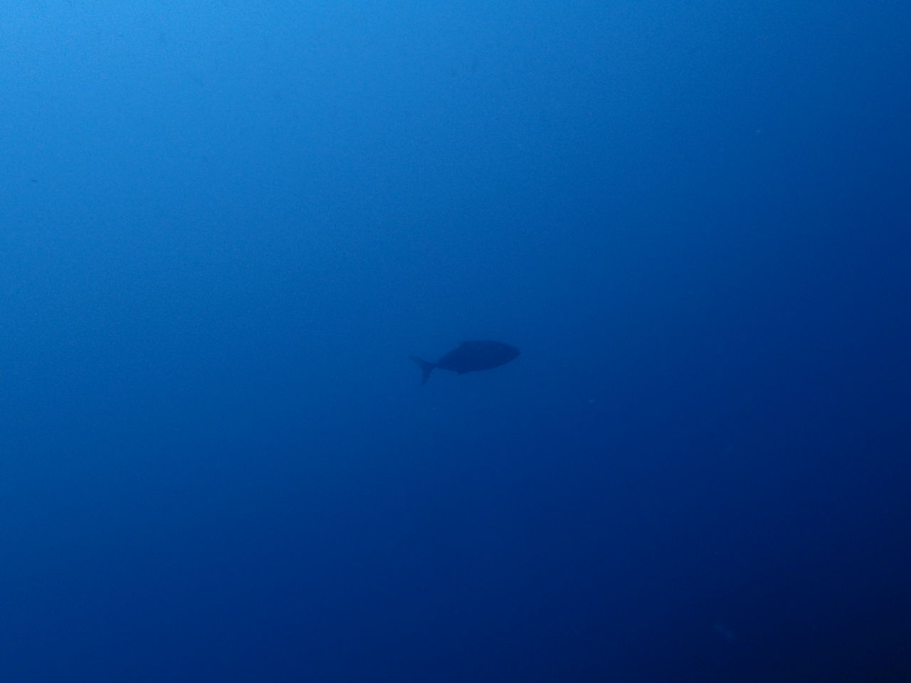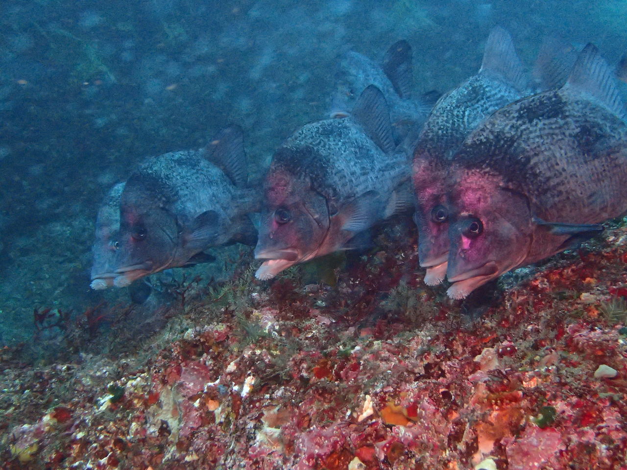 途中で大きなマダイやコロダイとすれ違いトビエイの根へ到着! 根の北側が黒くなっているので良く見てみたら、全部タカベの群れ!! 徐々に視界も良くなってきて10mぐらいはみえてきました。