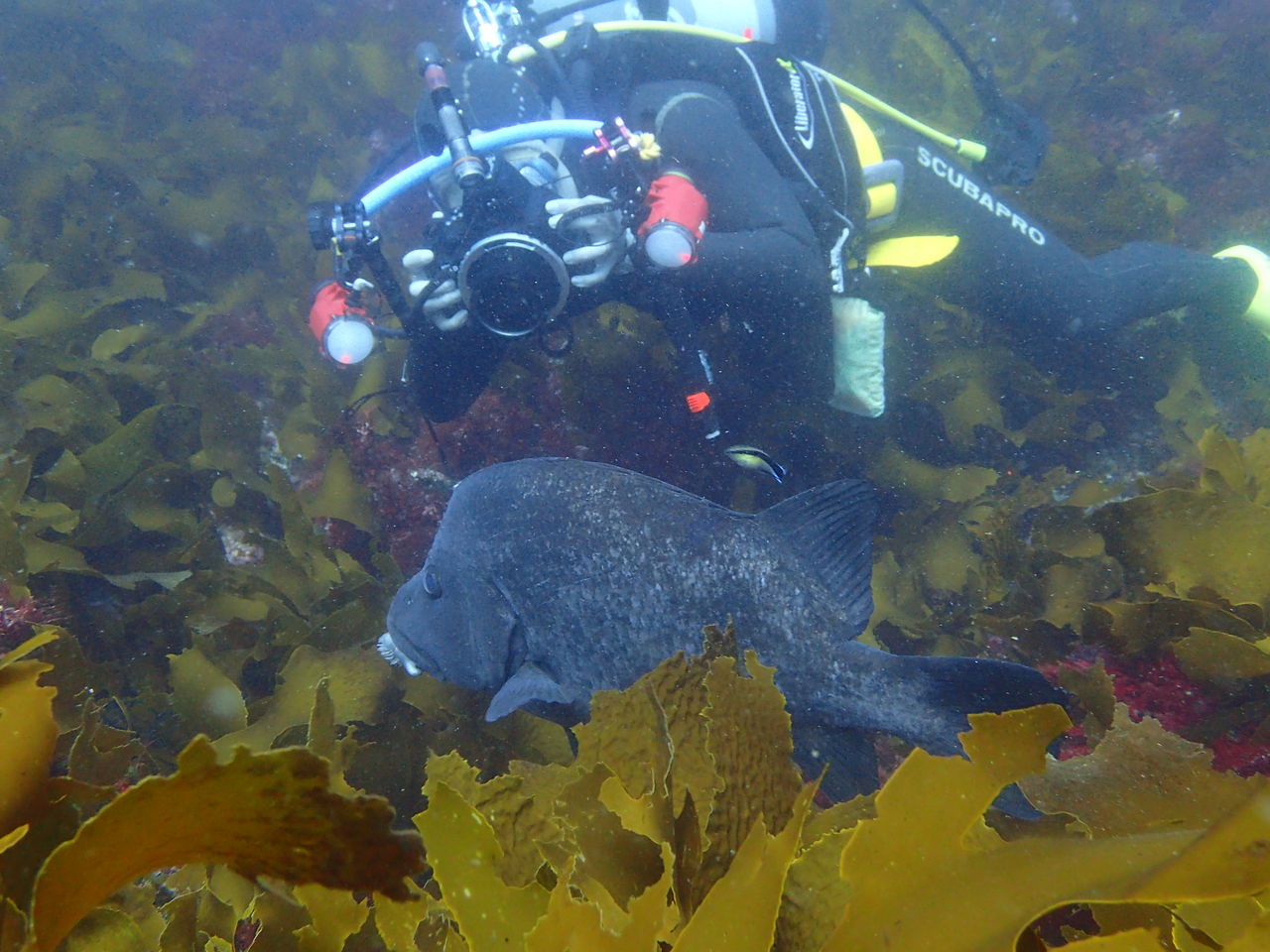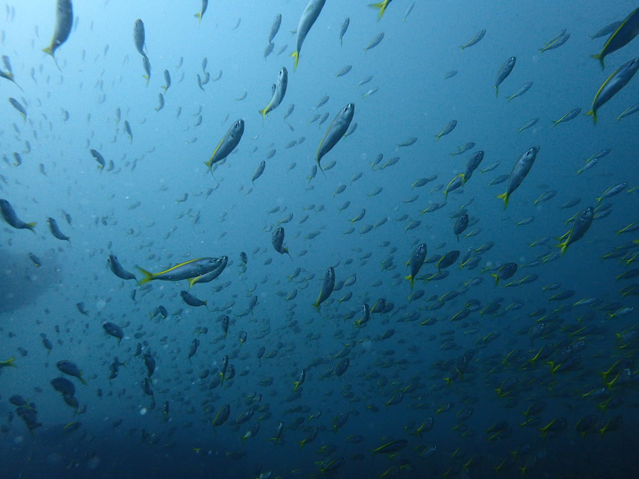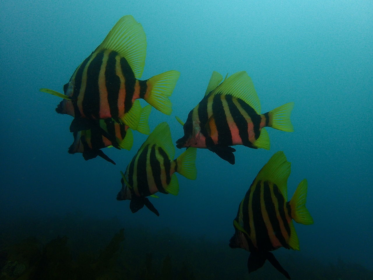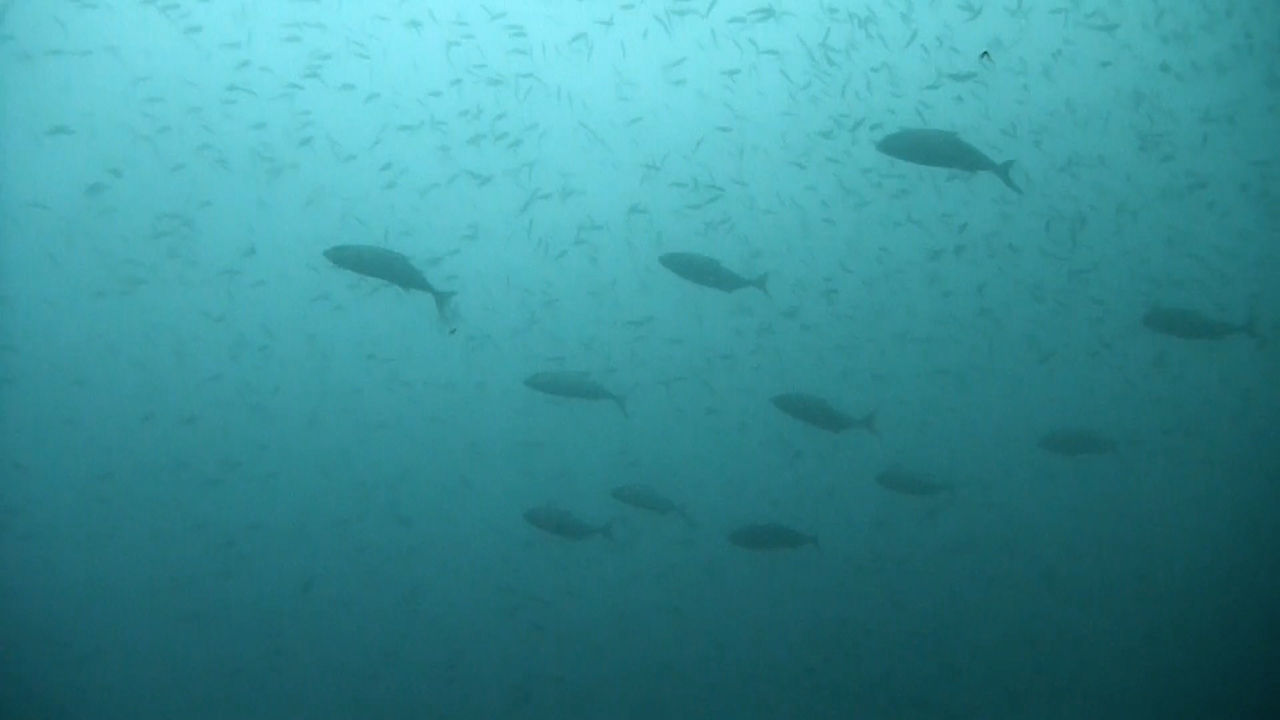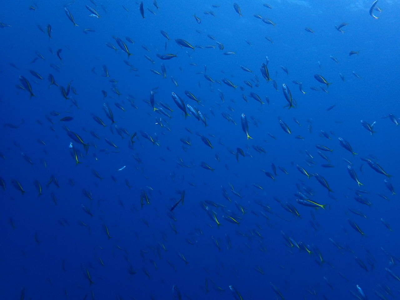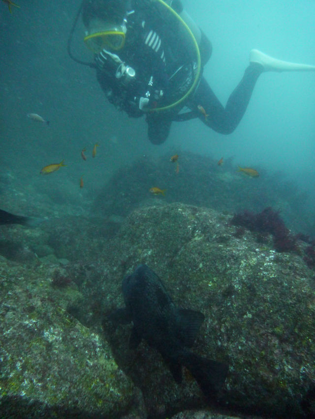 途中で大きなマダイやコロダイとすれ違いトビエイの根へ到着! 根の北側が黒くなっているので良く見てみたら、全部タカベの群れ!! 徐々に視界も良くなってきて10mぐらいはみえてきました。