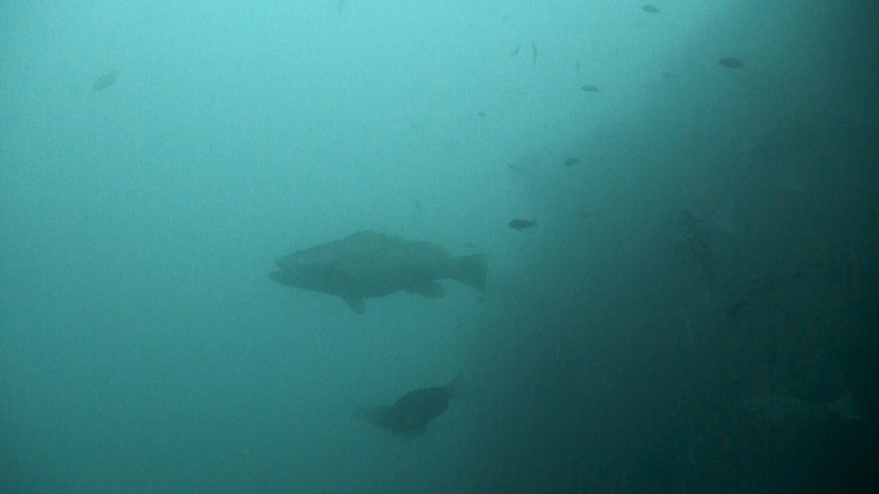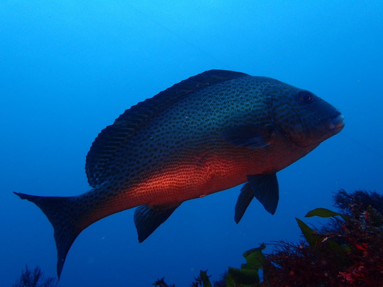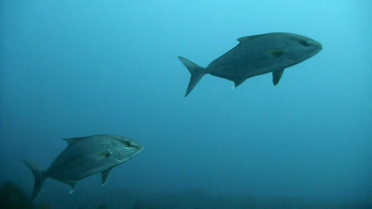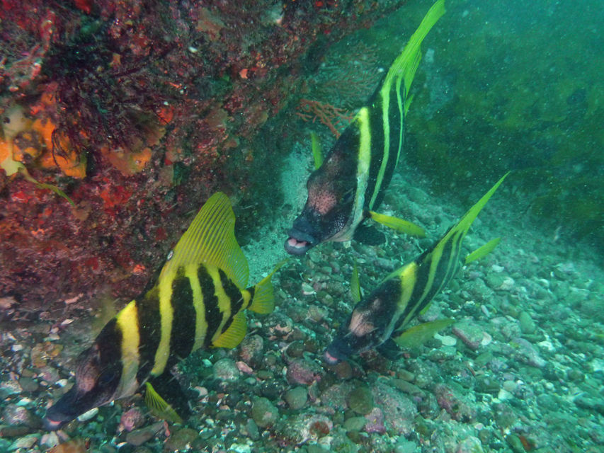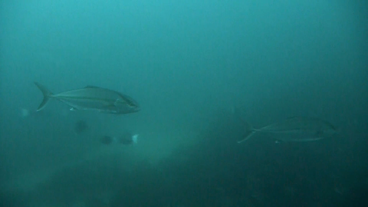 テングダイは1匹と3匹のグループに分かれていました。 中層にはイサキとマアジが泳ぎ回っています。