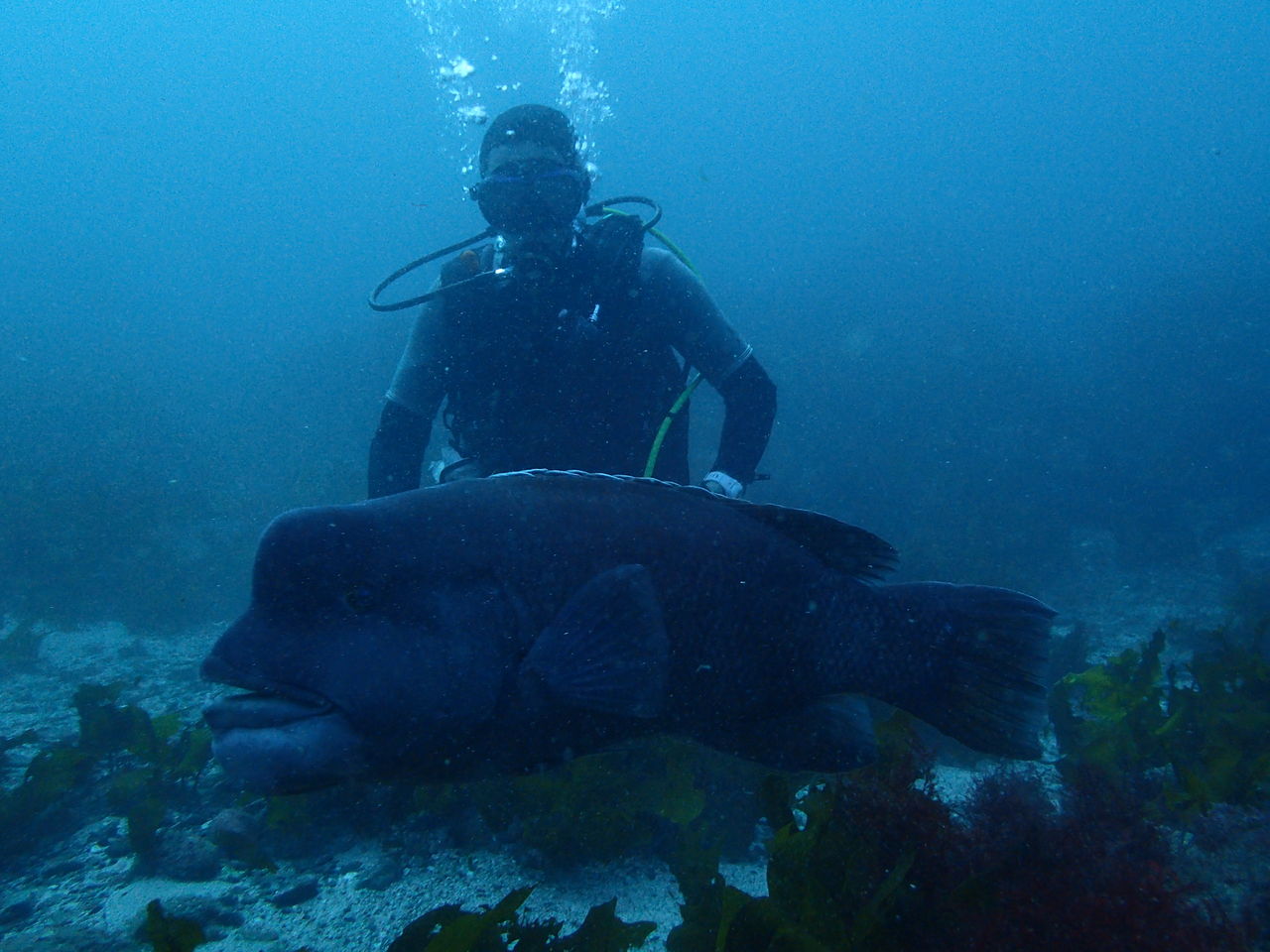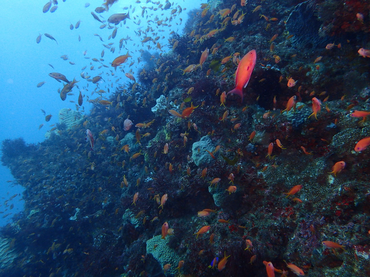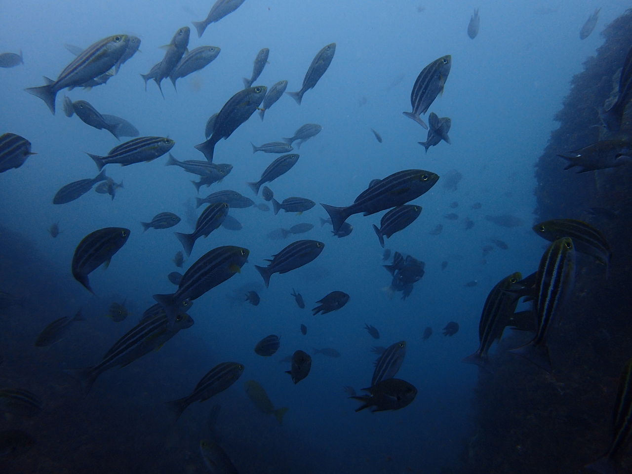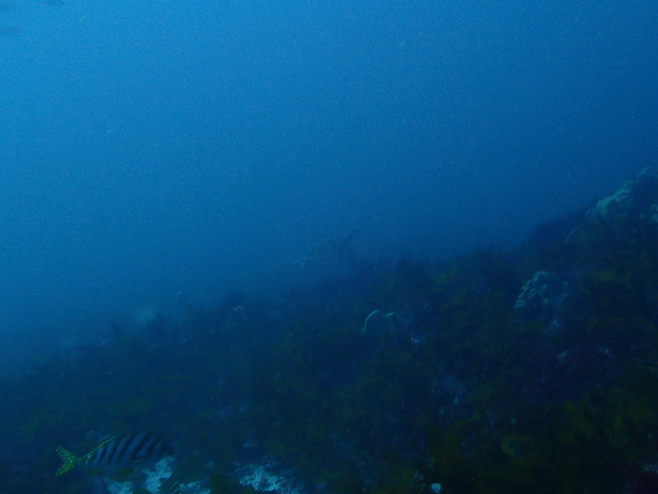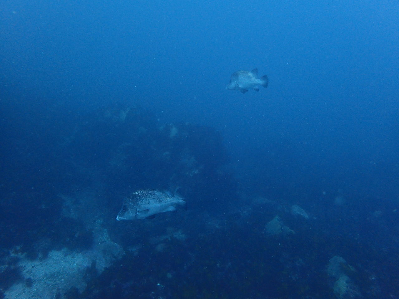 まずはV字谷、手前にホウライヒメジが水底に寝ています。東側の壁には大きなイシダイ。