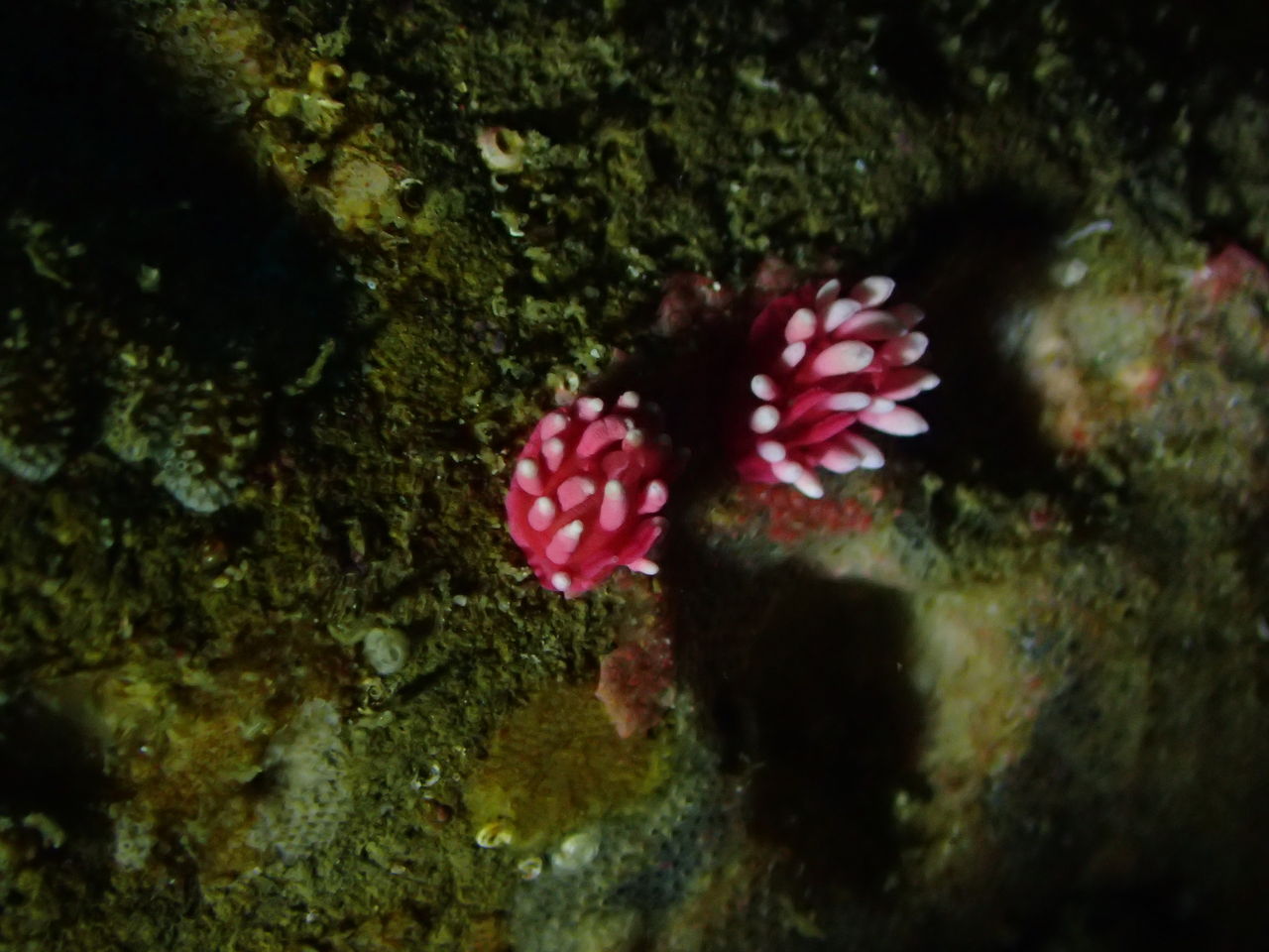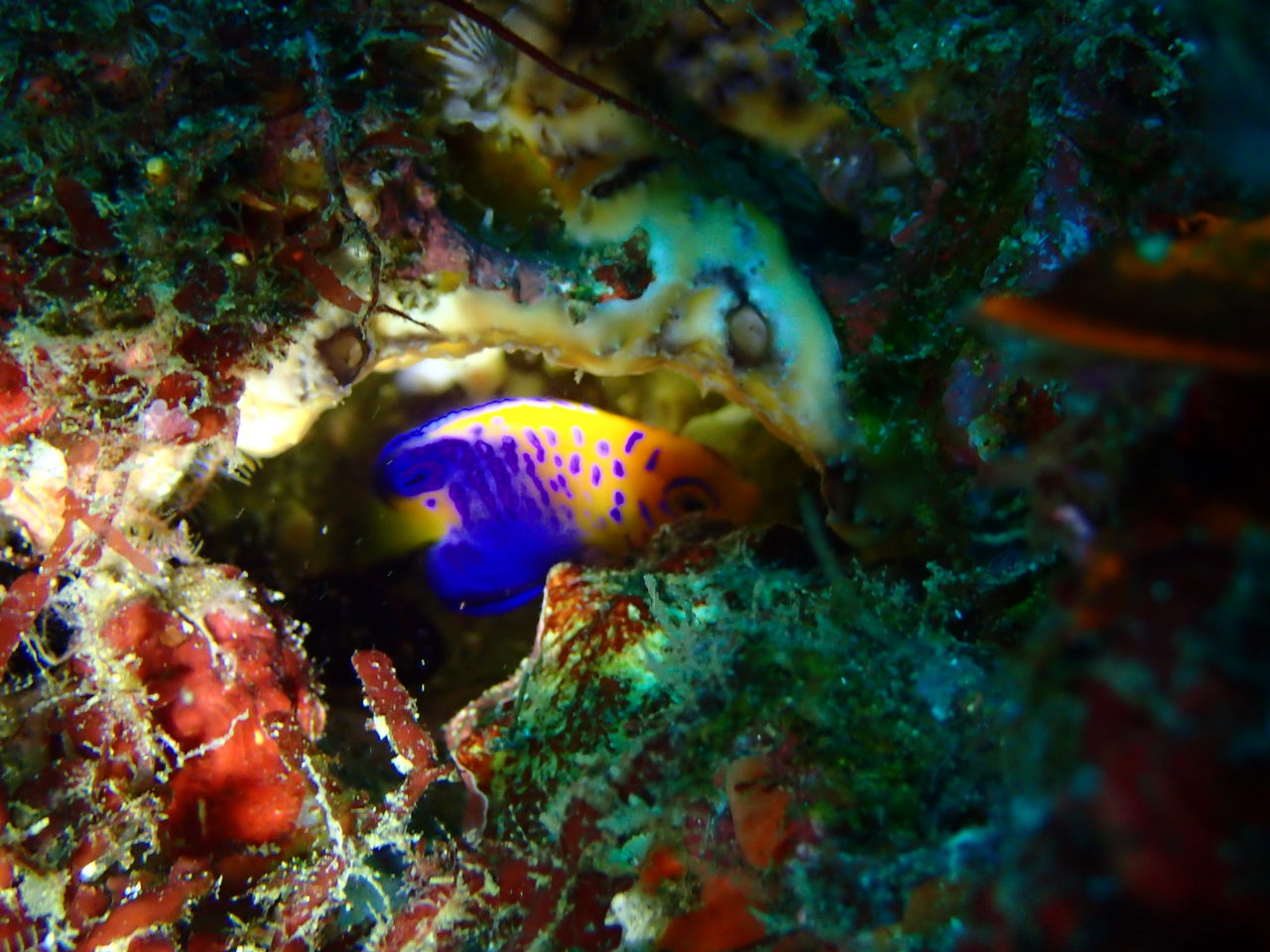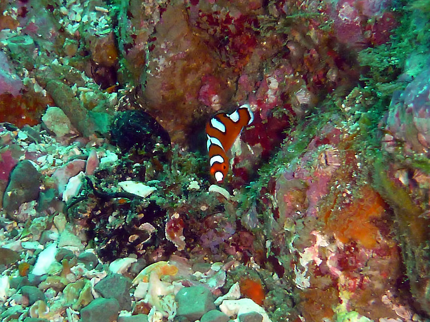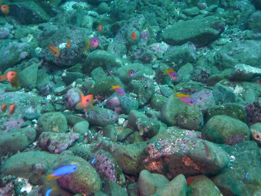 チェーン沿いにイソギンチャクエビ。三角岩にはキンギョハナダイの群れに紛れてクロユリハゼ、ウメイロモドキ、イッセンタカサゴの幼魚。