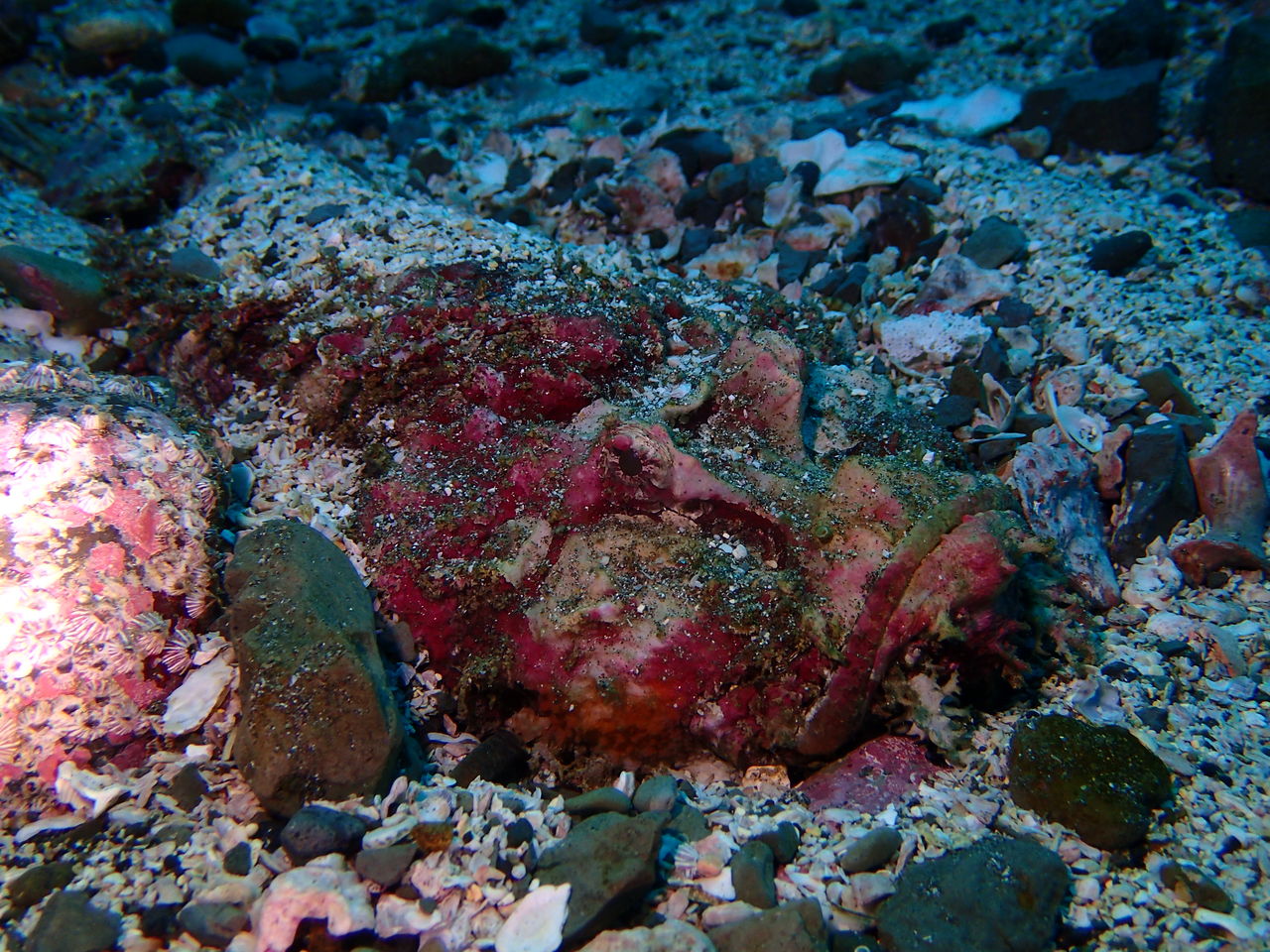 水底で岩をひっくり返してみると、まずイラがやってきて、付いている貝を食べようとしますが力が足りず。あとから来たコブダイがあっけなく剥がして食べました。