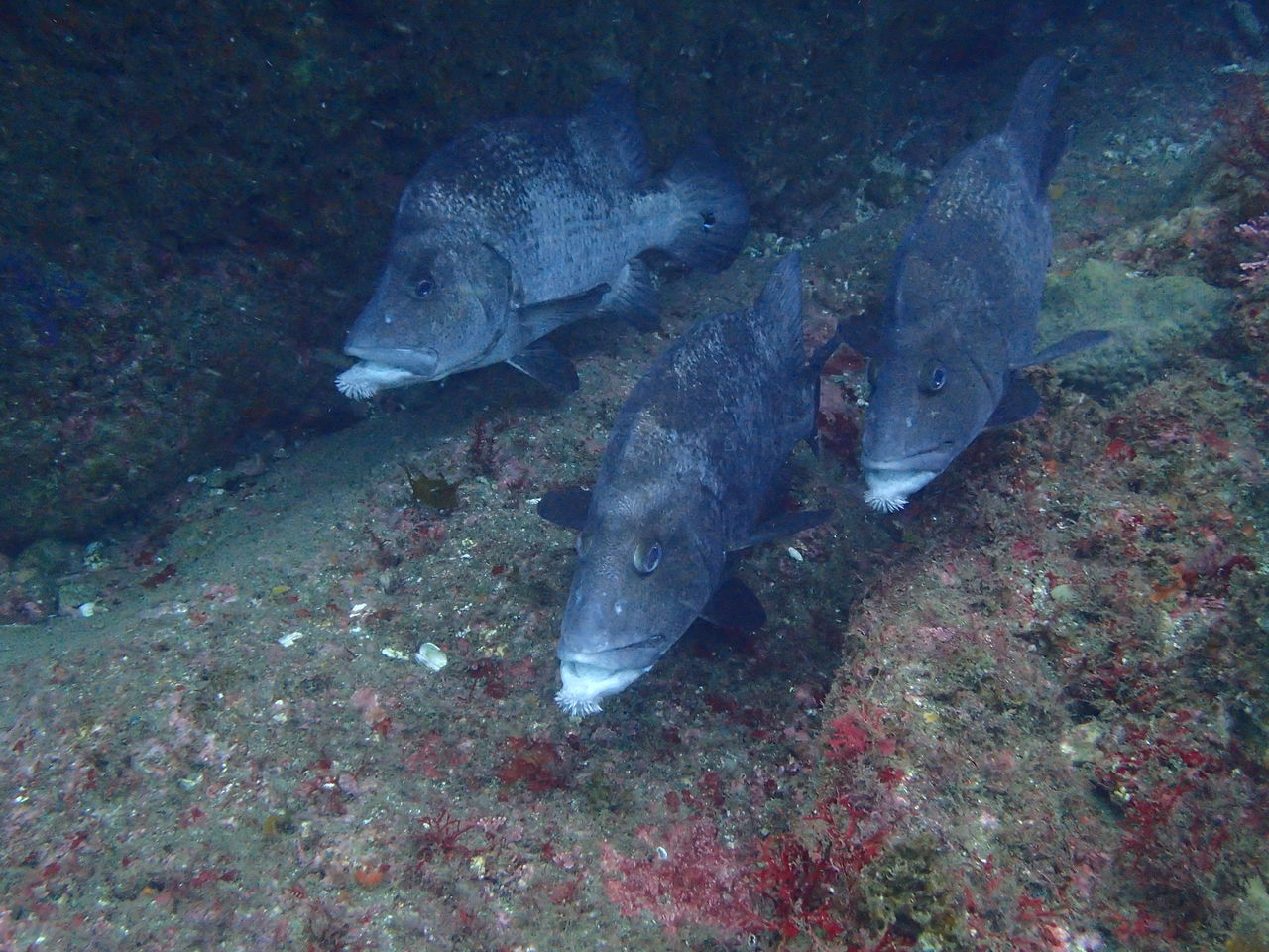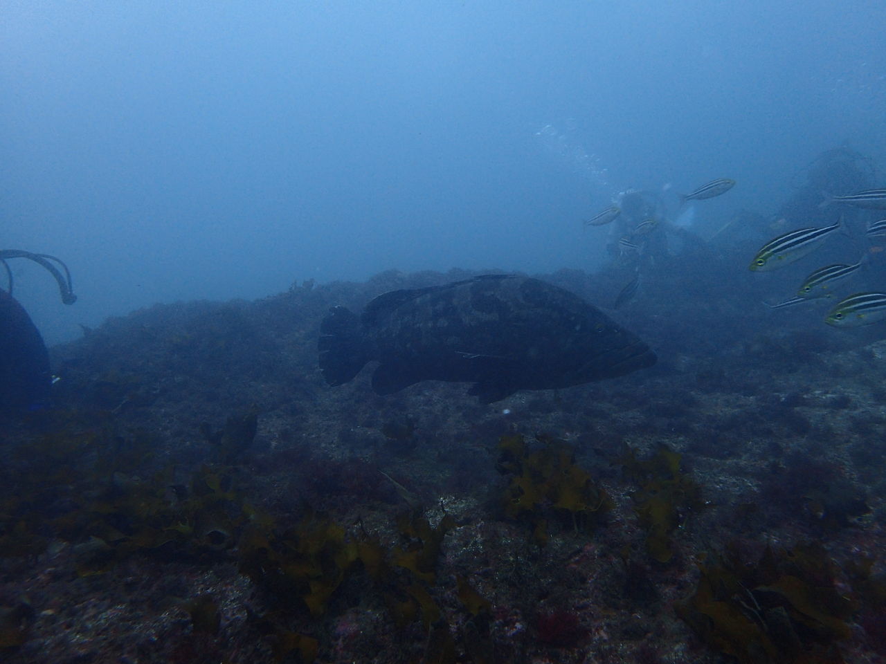 イソバナ壁の前ではタカベの群れ、土管の中にはヒゲダイ、イソバナ壁の隙間にはクエが入っていました。