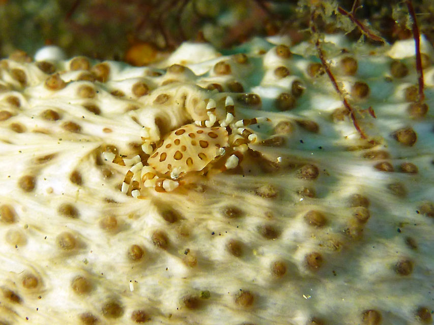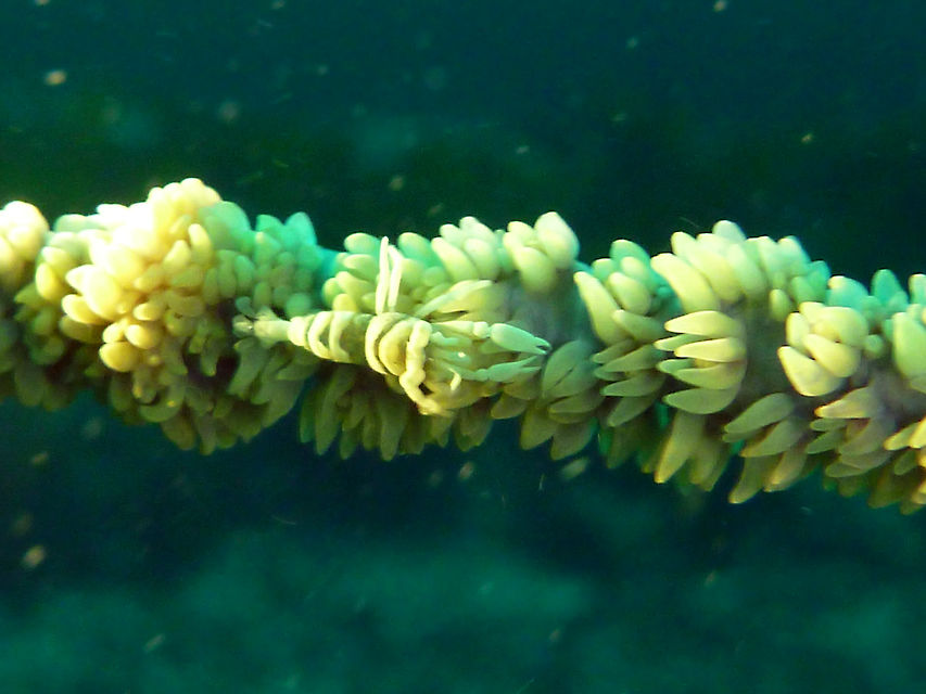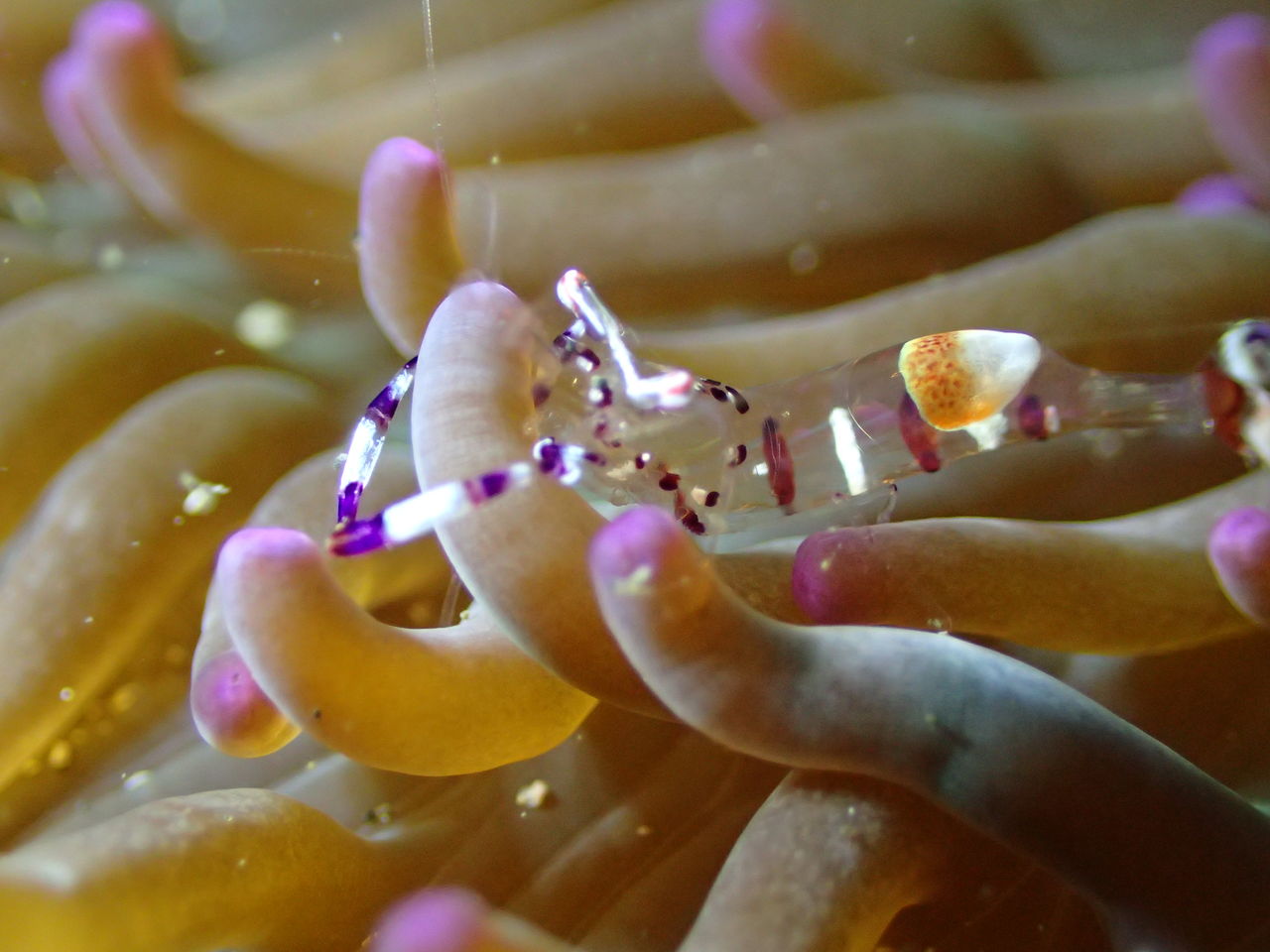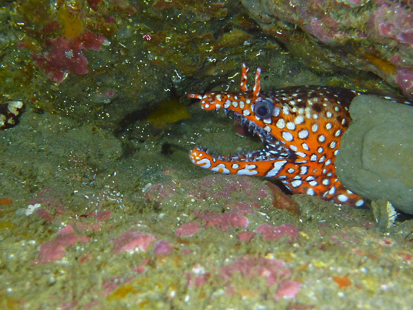 メバル谷の隣の谷に降りて壁の隙間にイソギンチャクモエビ。トラウツボのそばにはクリアクリーナーシュリンプ。