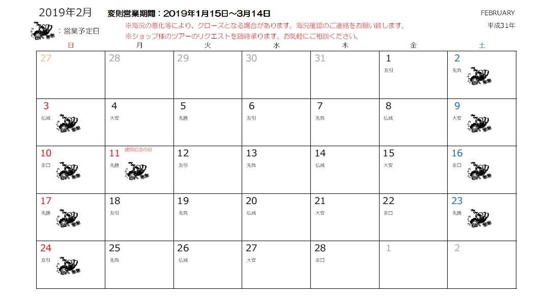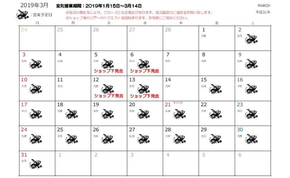 基本的には土日と祭日の営業となりますが、ショップ様におかれましては、リクエストをいただければ海が時化ない限り、いつでも船は出せますのでお気軽にご連絡くださいませ。