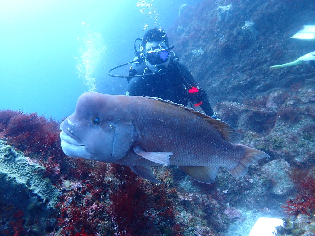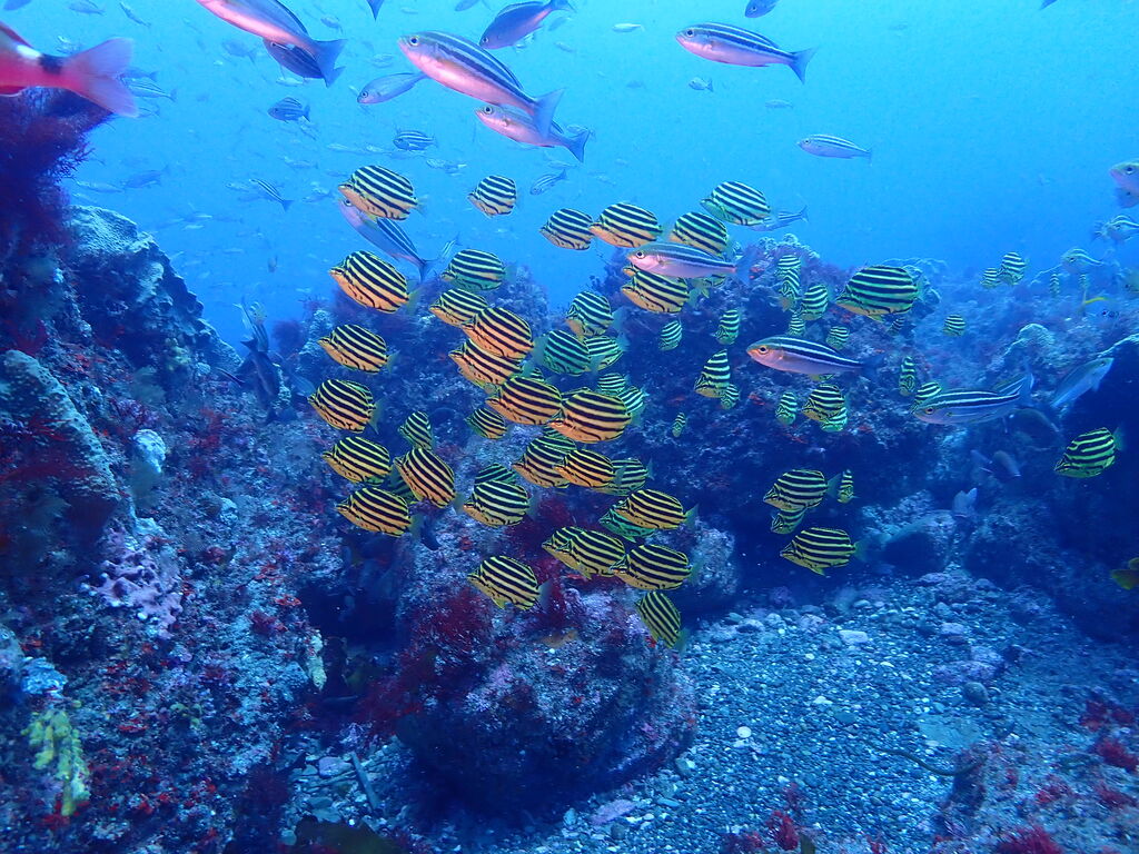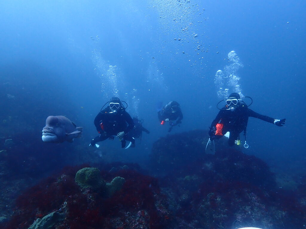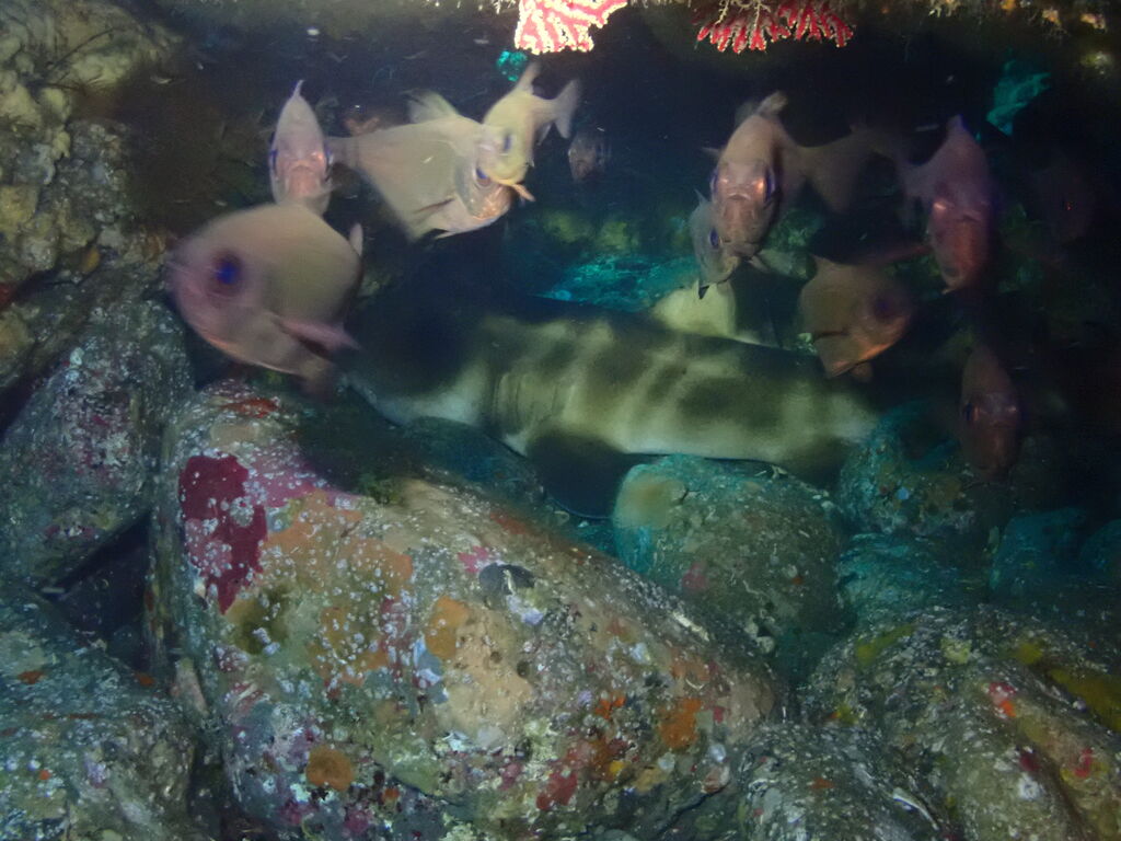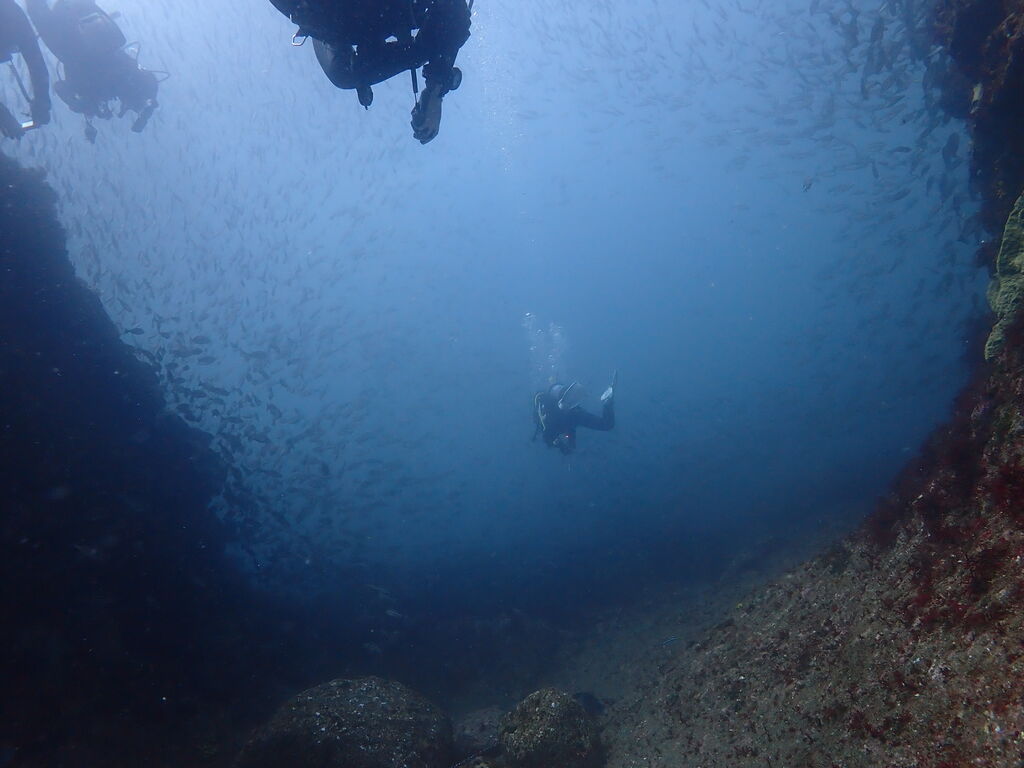 V字谷にはヒゲダイが整列。ハタンポ岩の南側にはアオウミガメが居ました。